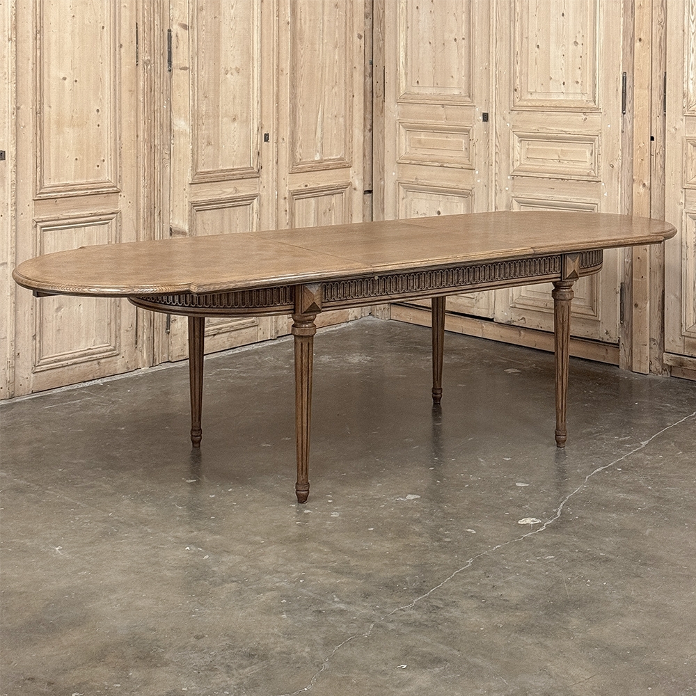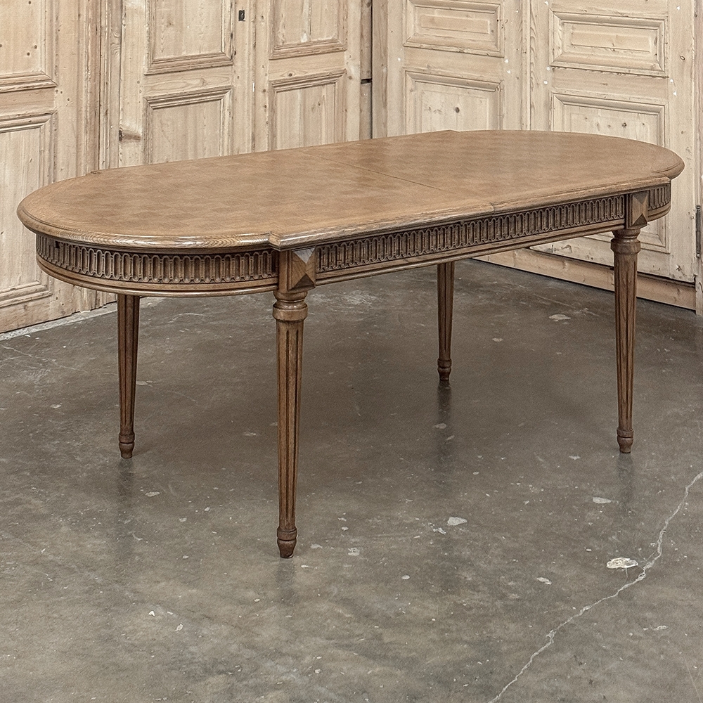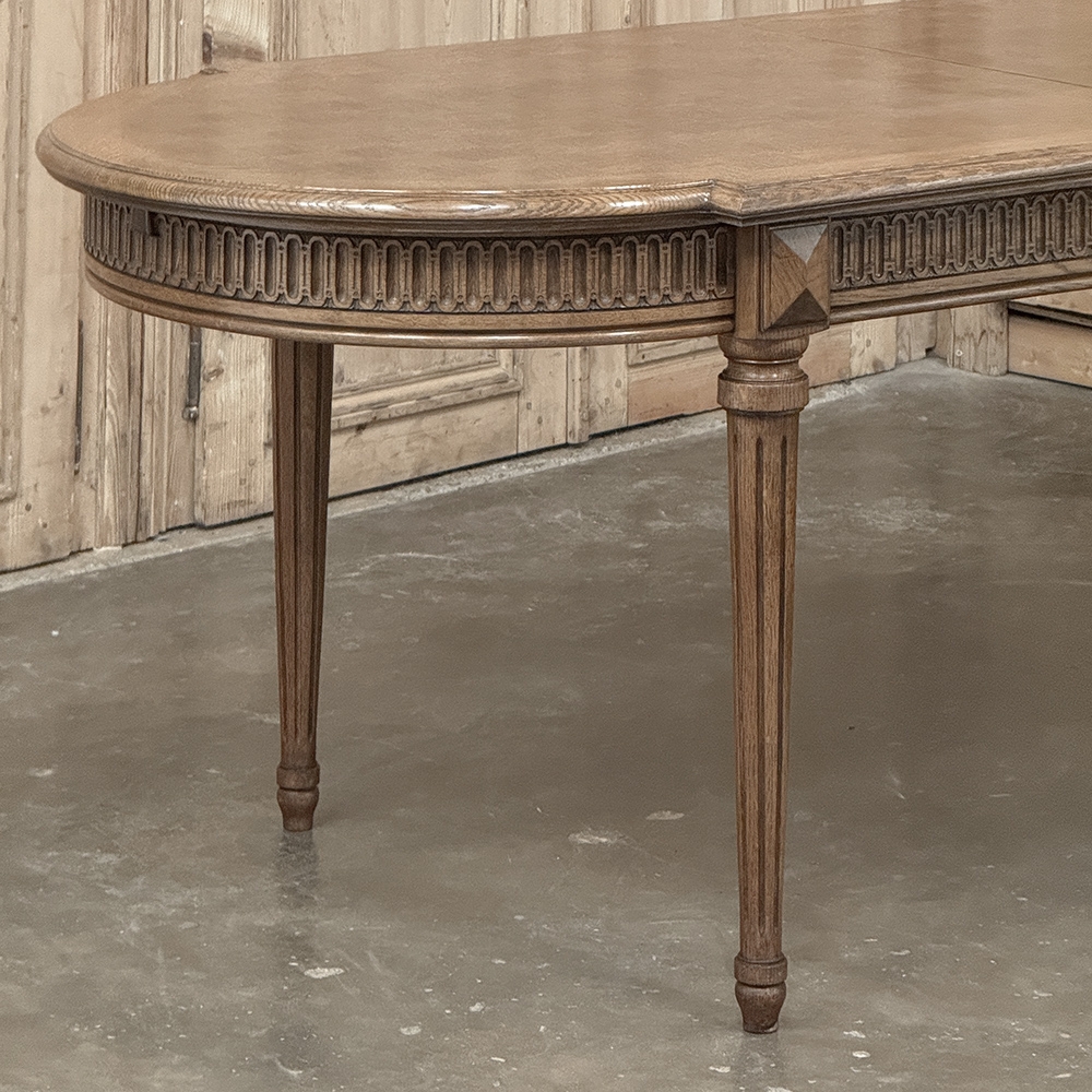 Antique French Louis XVI Oak Parquet Dining Table with Pop-Up Leaf is an ingenious design that will serve your family for many years to come. Crafted from solid oak with parquet on top, the top is made of two halves that slide open to reveal a concealed pop-up leaf that allows more guests or family members to be accommodated. Leaf folds back in so table can be reverted to reclaim floor space. The rounded ends make it a great choice for families with youngsters running about the house. Support is provided by a fluted apron all around, accented with pyramidal plinth blocks above each of four tapered and fluted legs. Elegant but not pretentious, it will immediately become a family heirloom piece!