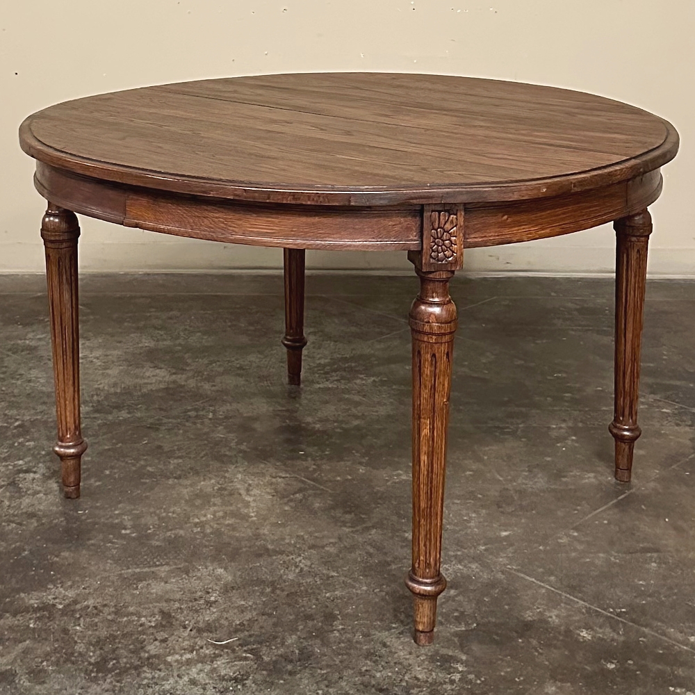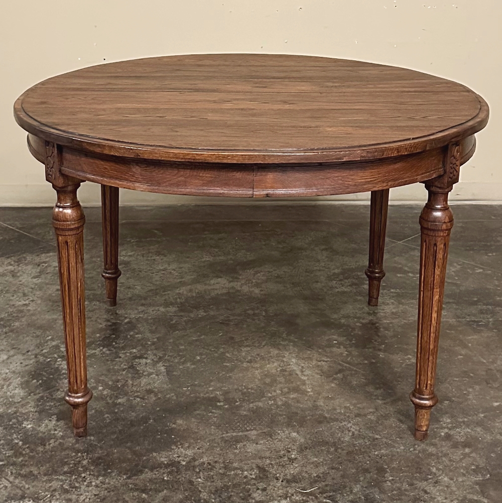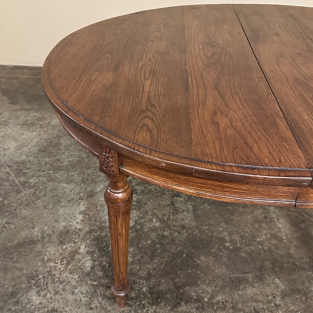 Antique French Louis XVI Oval Dining Table in Solid Oak presents a tailored, no nonsense classical appeal rendered in solid oak to endure for decades.  The oval shaped thick plank top is beveled all around, and displays the beautiful wood grain to perfection.  A relatively shallow molded apron appears all around as well, interrupted only by plinth blocks carved with a stylized floral motif.  The plinth blocks top four tapered and fluted column legs with turned molding.  Knee clearance is 25.5" tall, and more clearance is easy to arrange with leg extensions, if you so require.