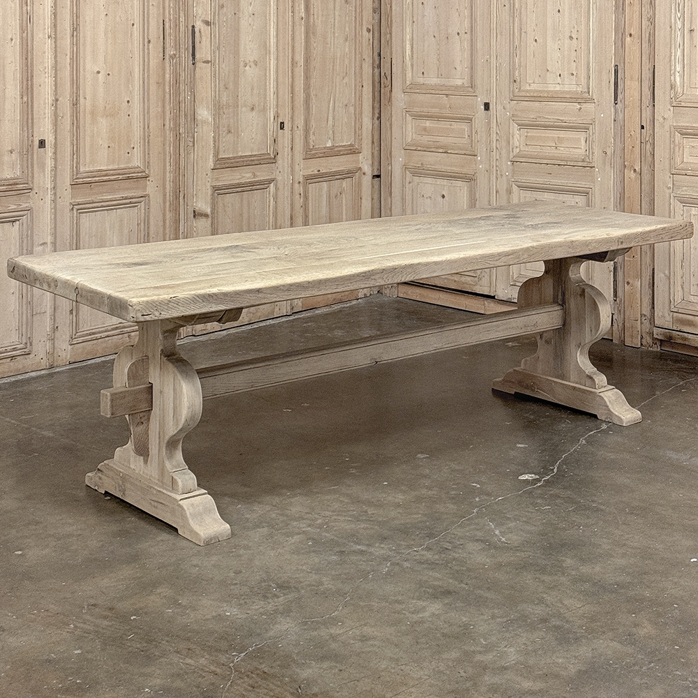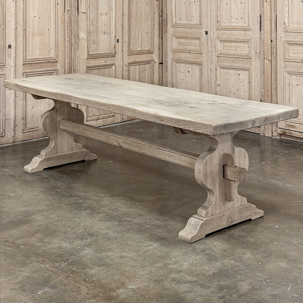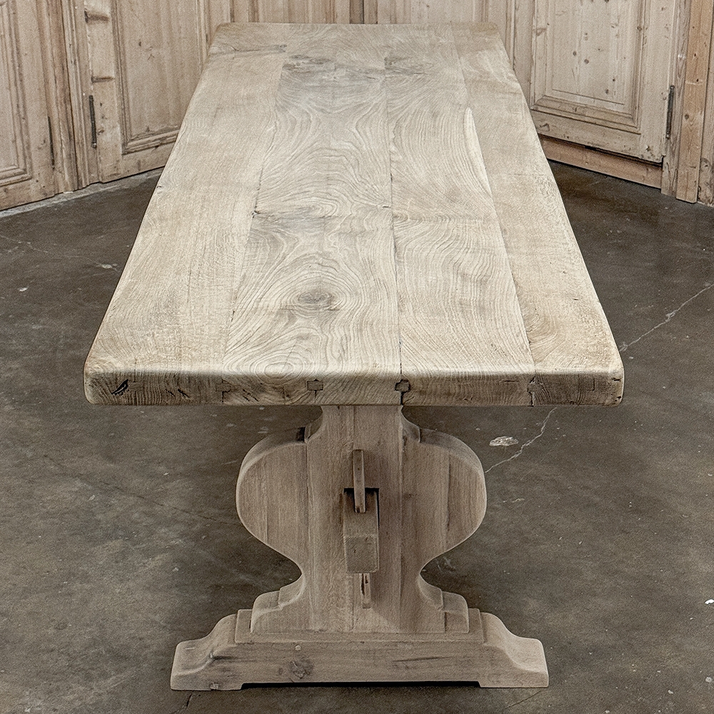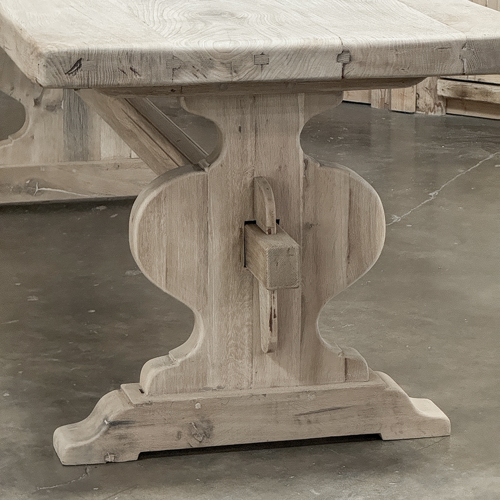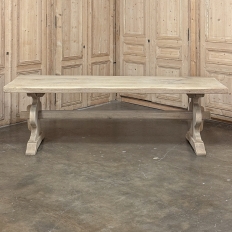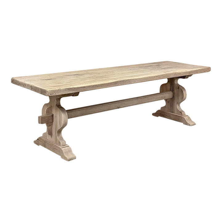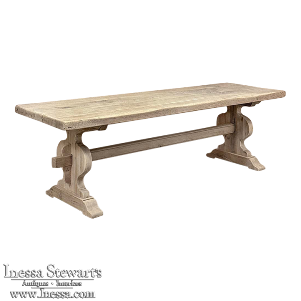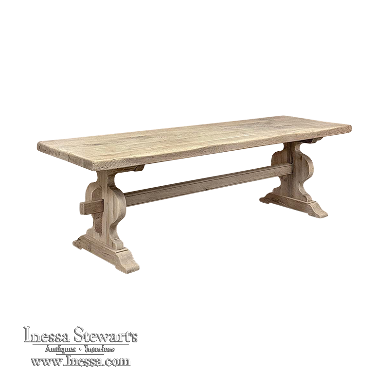 Antique Italian Style Country French Stripped Oak Trestle Table is the product of centuries of traditional design and craftsmanship! Utilizing beautifully figured sycamore and sturdy oak planks and timbers, the artisans created the table in the Italian style with massive urn-shaped side supports affixed to cross pieces serving to connect to the top above, and provide a sturdy footprint below. The supports were then fully mortised to accommodate a solid oak trestle shimmed at both sides for stability, durability, and stylish flair all in one! The stripped finish performed by our expert in-house professional staff reveals the natural beauty of the wood, providing your family with an unmistakable tie to the past.