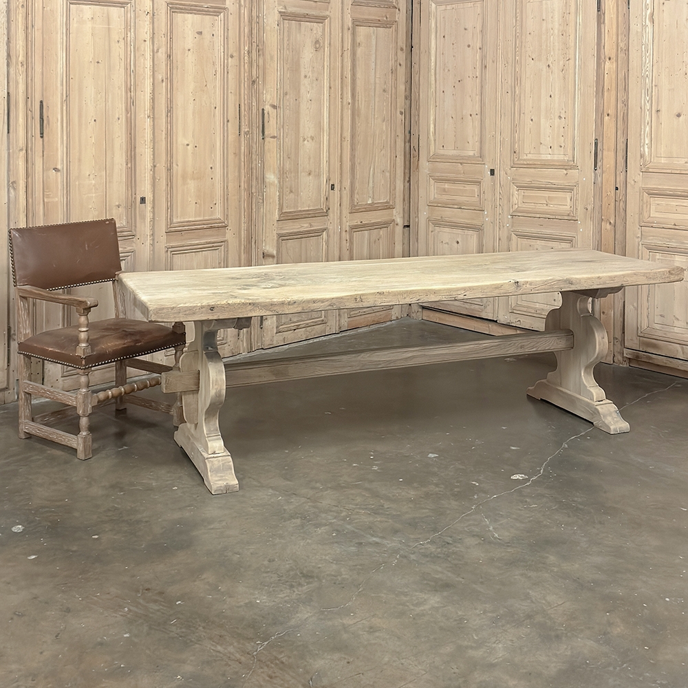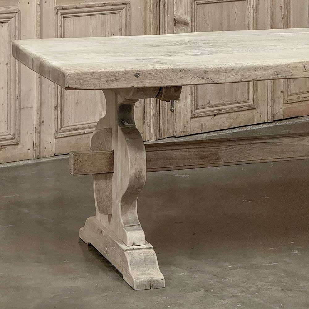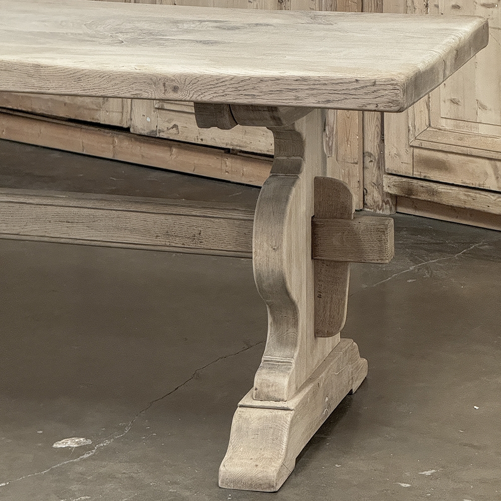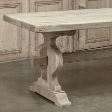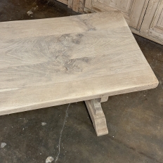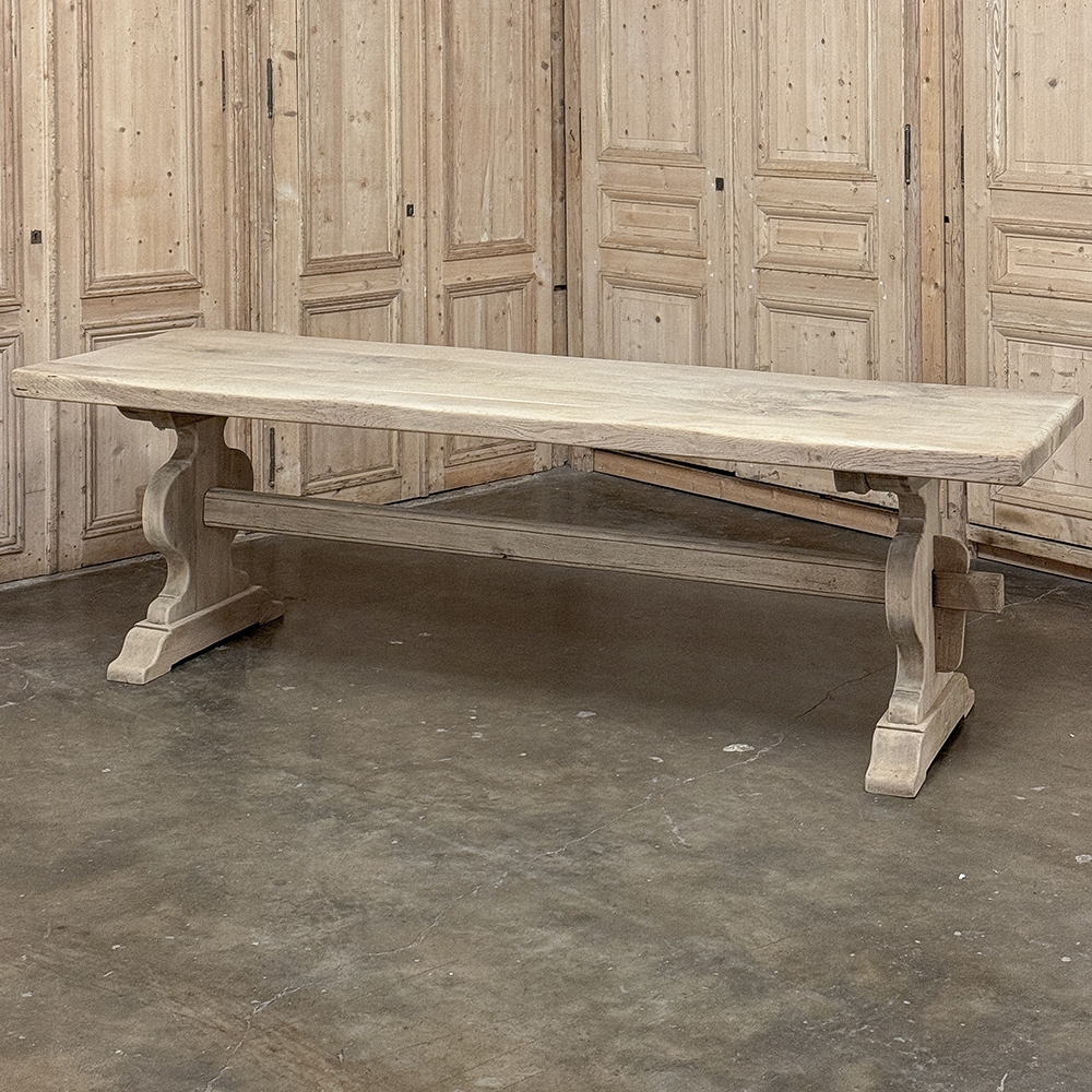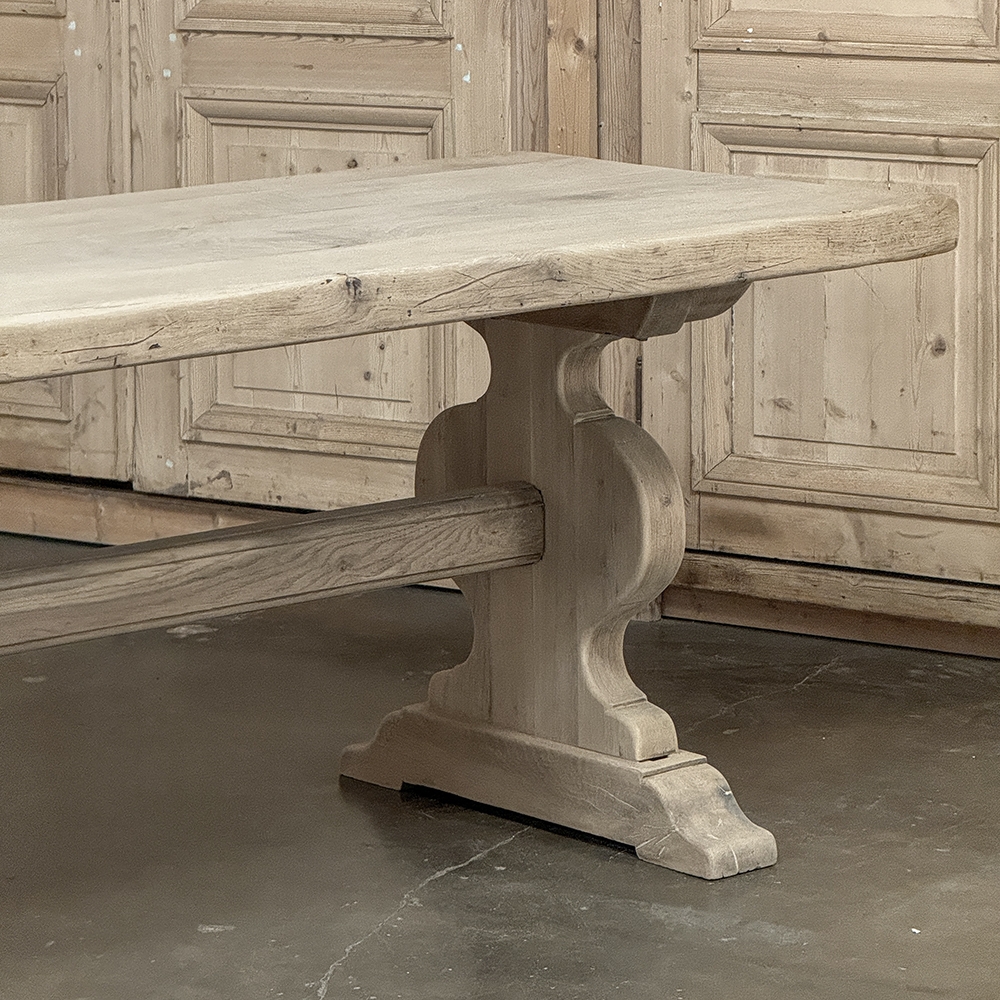 Antique Italian Style Country French Stripped Oak Trestle Table is the product of centuries of traditional design and craftsmanship! Utilizing beautifully figured sycamore and sturdy oak planks and timbers, the artisans created the table in the Italian style with massive urn-shaped side supports affixed to cross pieces serving to connect to the top above, and provide a sturdy footprint below. The supports were then fully mortised to accommodate a solid oak trestle shimmed at both sides for stability, durability, and stylish flair all in one! The stripped finish performed by our expert in-house professional staff reveals the natural beauty of the wood, providing your family with an unmistakable tie to the past.