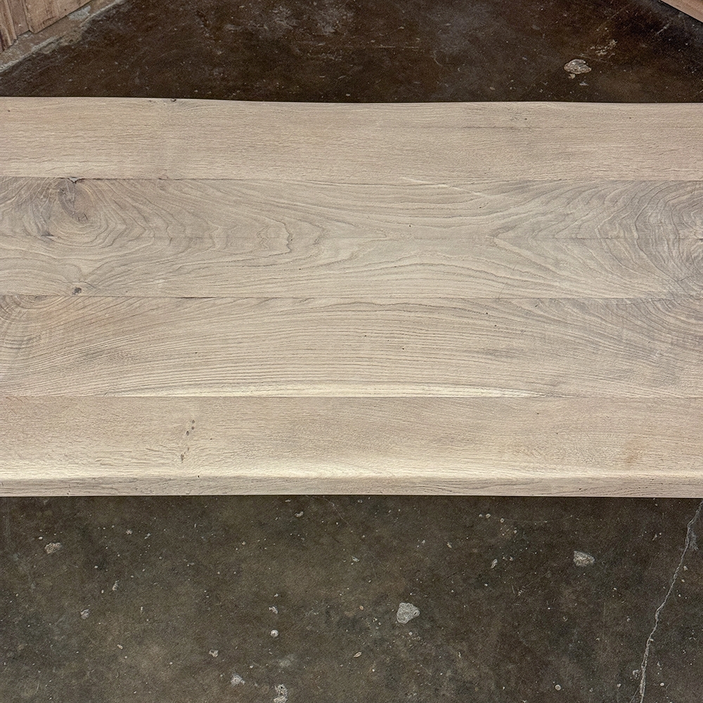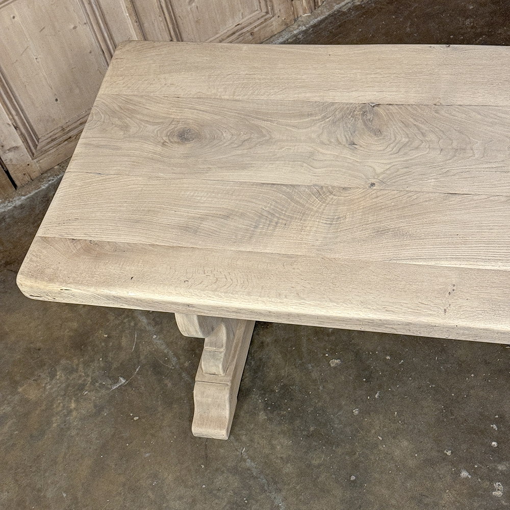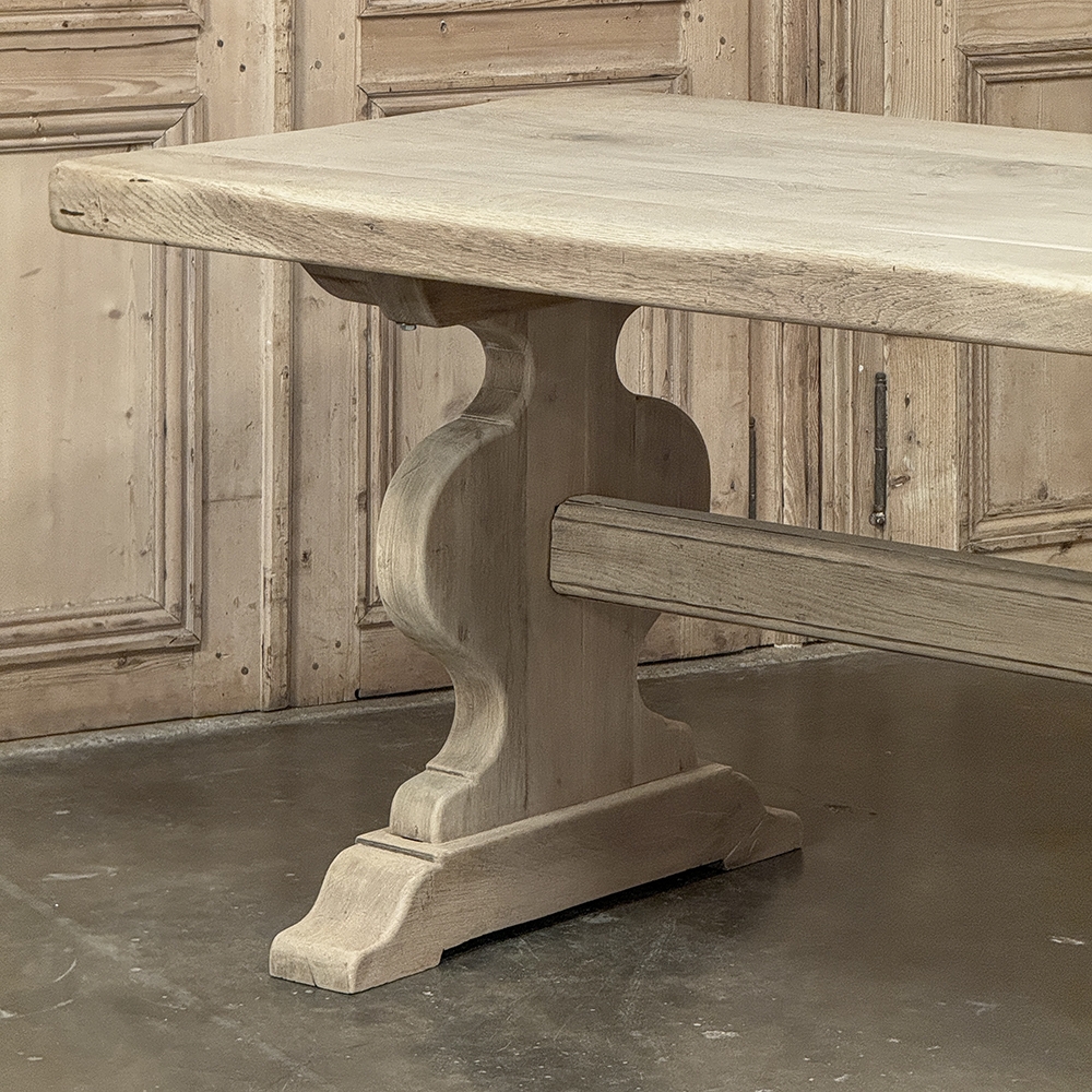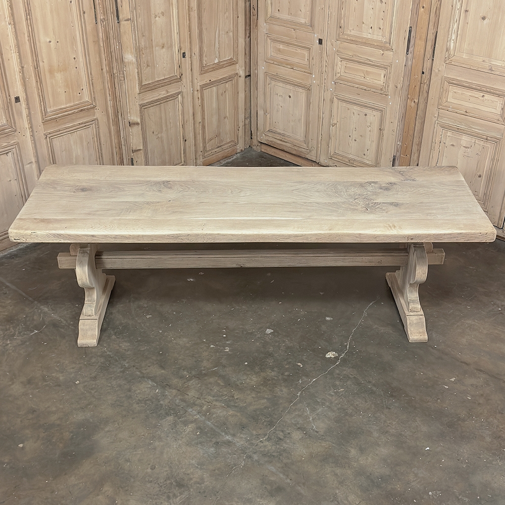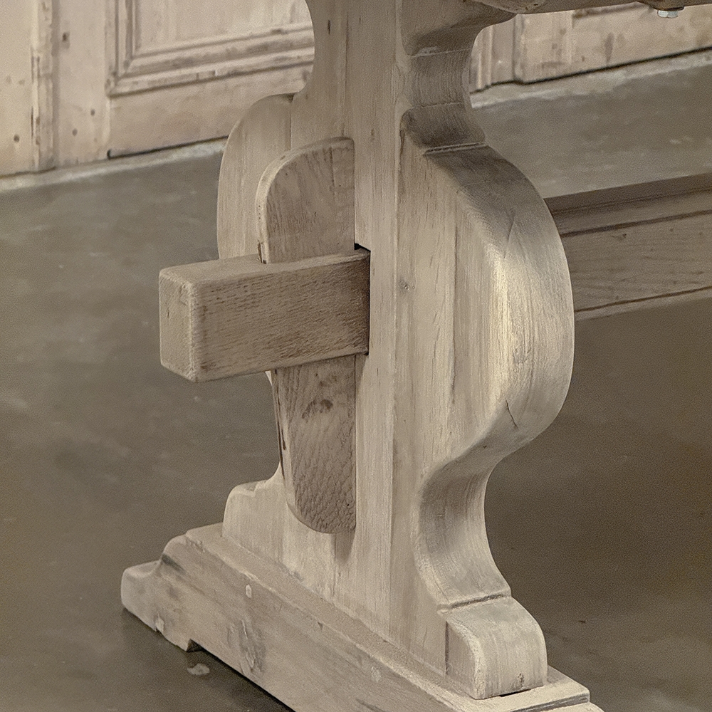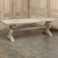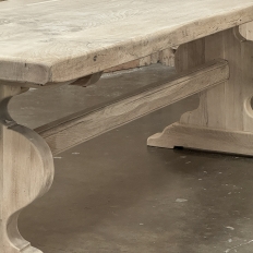 Antique Italian Style Country French Stripped Oak Trestle Table is the product of centuries of traditional design and craftsmanship! Utilizing beautifully figured sycamore and sturdy oak planks and timbers, the artisans created the table in the Italian style with massive urn-shaped side supports affixed to cross pieces serving to connect to the top above, and provide a sturdy footprint below. The supports were then fully mortised to accommodate a solid oak trestle shimmed at both sides for stability, durability, and stylish flair all in one! The stripped finish performed by our expert in-house professional staff reveals the natural beauty of the wood, providing your family with an unmistakable tie to the past.