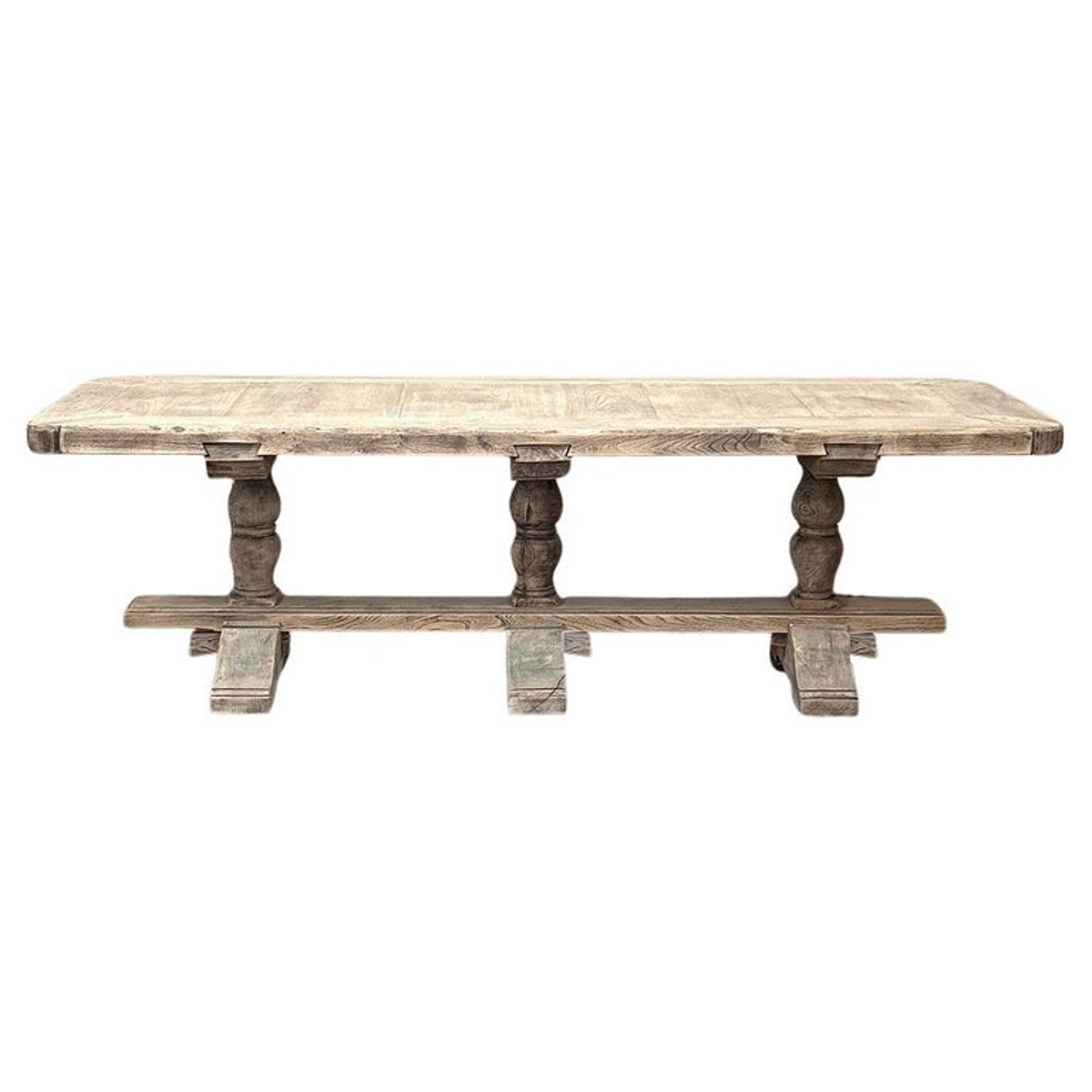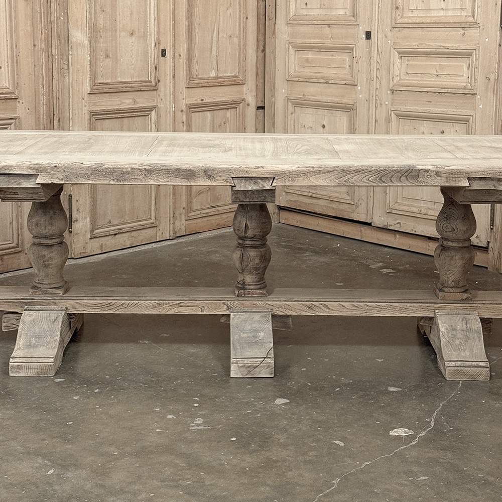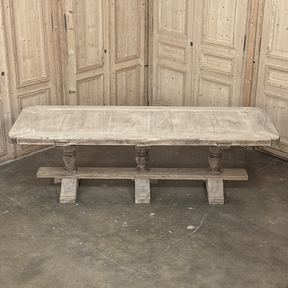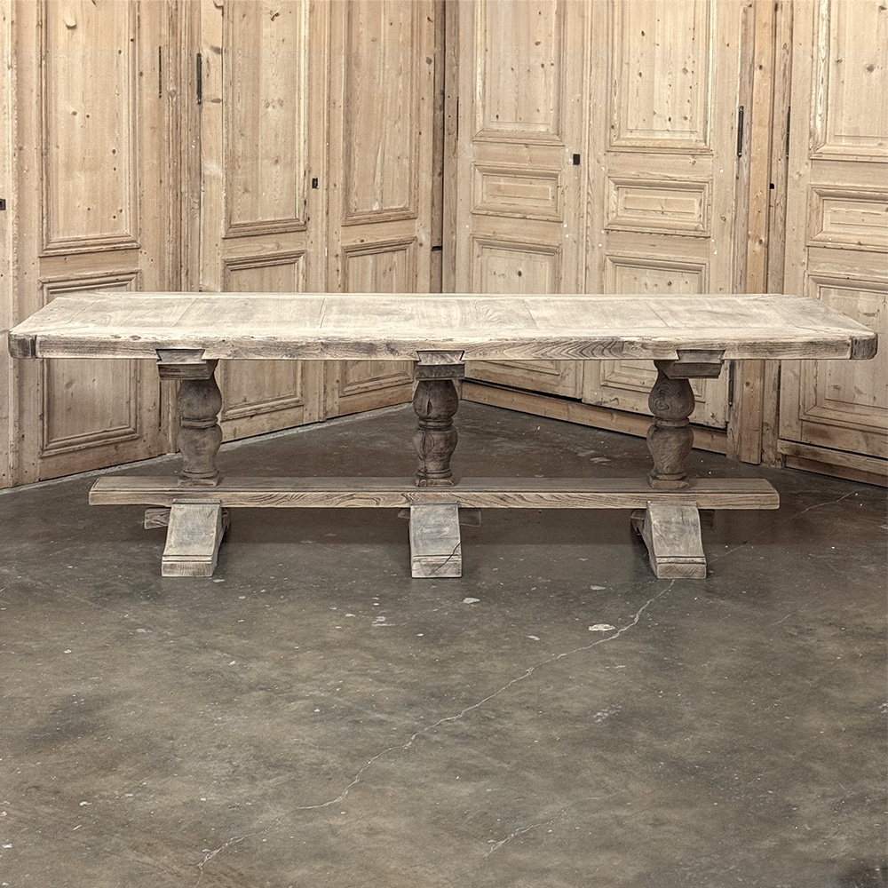 Antique Rustic Country French Triple Pedestal Trestle Dining Table represents the epitome of traditional craftsmanship! Utilizing techniques handed down from generation to generation, the artisans who created this table utilized their relatively primitive hand-tools to fashion a work of art that will endear itself to your family. Thick beams of old-growth oak were used for the top, with an intriguing corner treatment that eliminates sharp corners. Three turned pedestals on massive feet are connected to a wide trestle beam, with pegged mortise & tenon joinery throughout ensuring lasting legacy. Painstakingly stripped using our proprietary process that retains the patina and sheer natural beauty of the old wood, it features a lighter visual appeal that is so perfectly complementary to today's more casual decors.