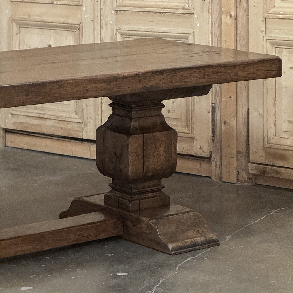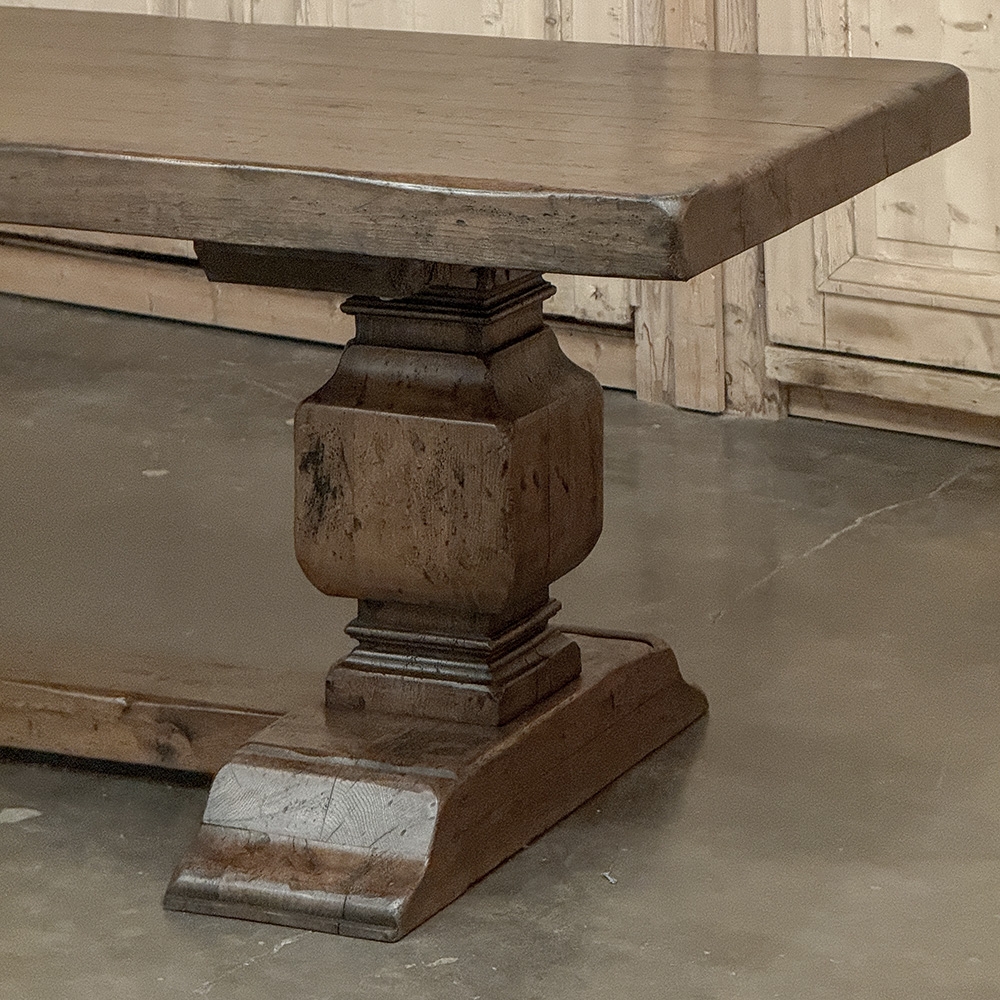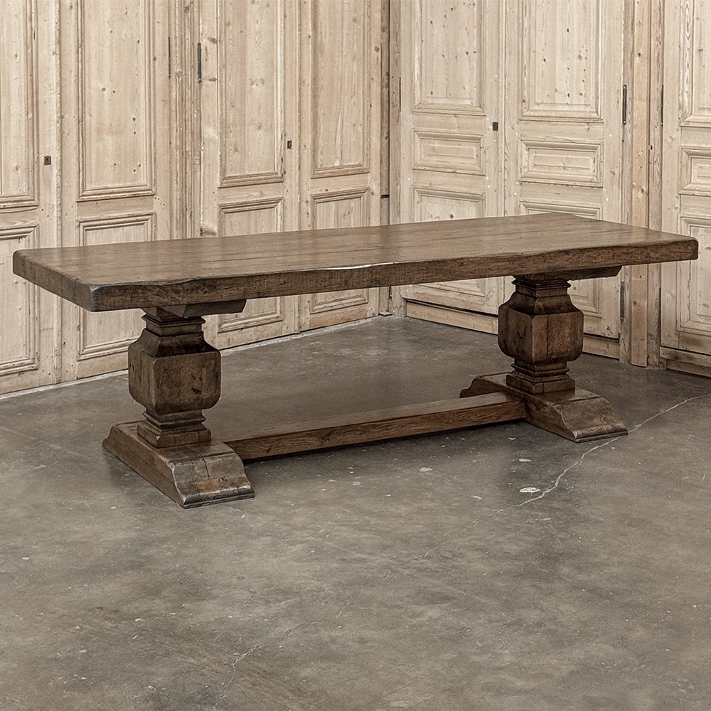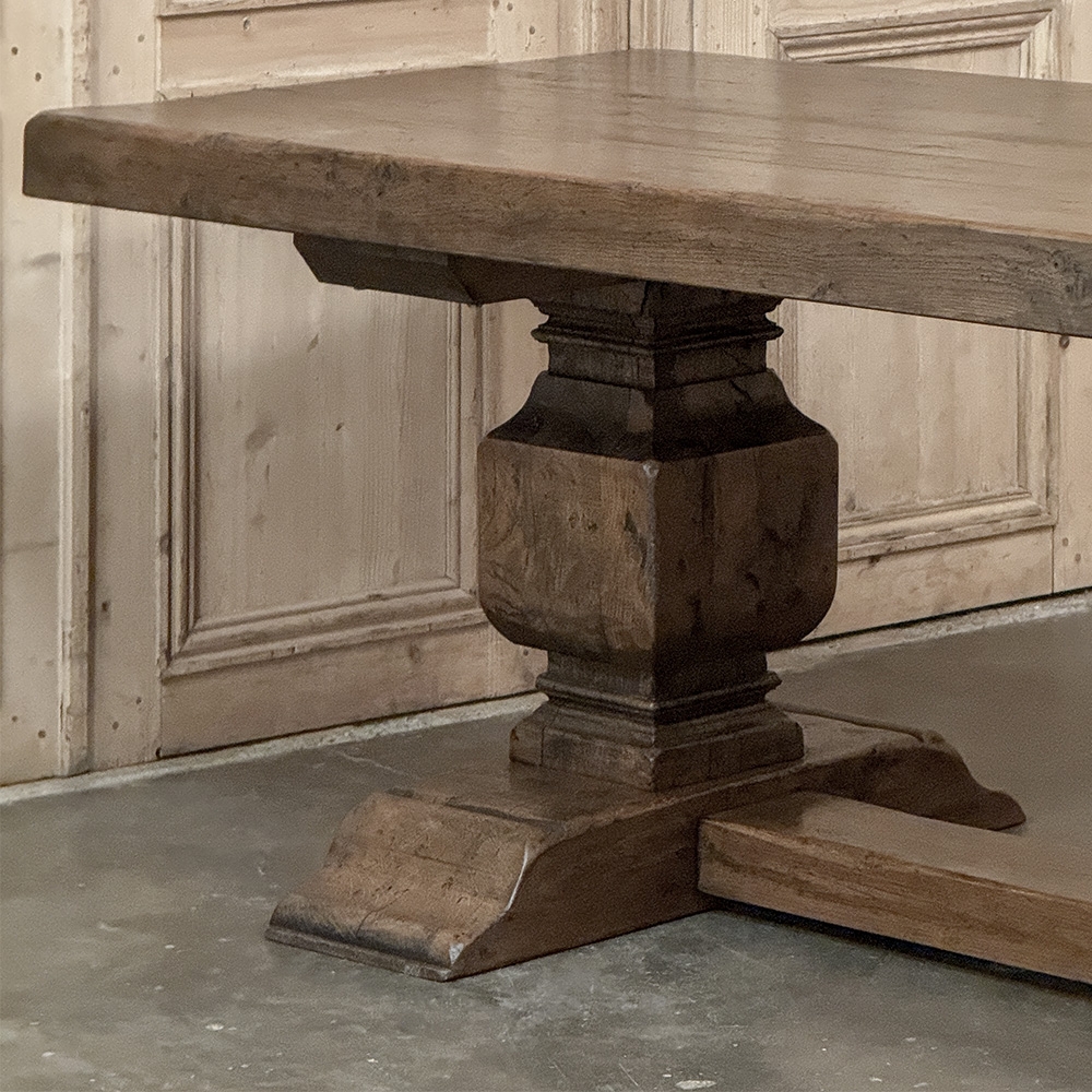 Antique Rustic European Double Pedestal Trestle Dining Table was literally built to last for centuries! Hand-crafted from dense, old-growth seasoned oak, its thick plank top with dovetailed joints is so strong a supporting apron is unnecessary, producing generous 27.5" knee clearance all around, with plenty of overhang for the lord and lady of the castle on each end. Two massive pedestals provide support, connected below by a trestle and fitted to broad feet that are tapered for maximum seating comfort. Table top is removable for easy transport.