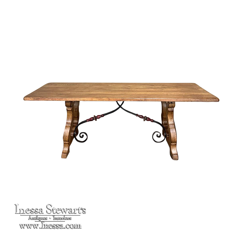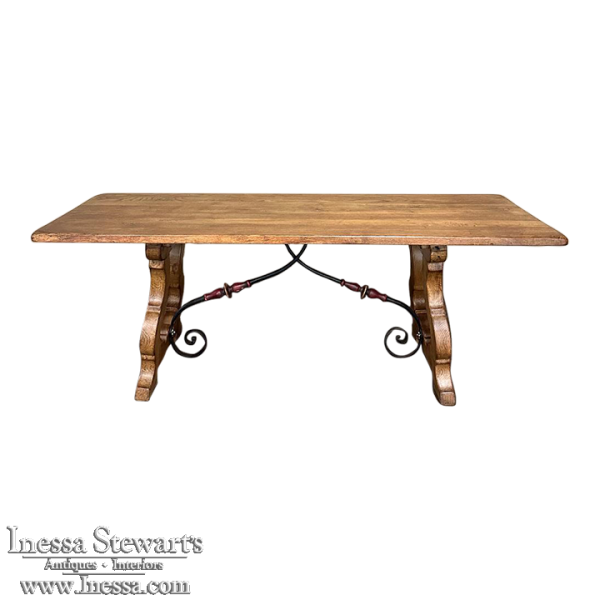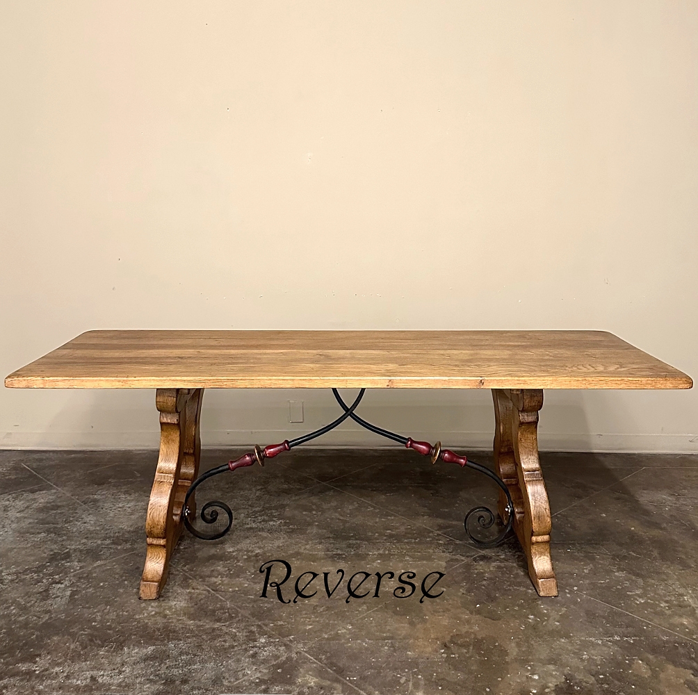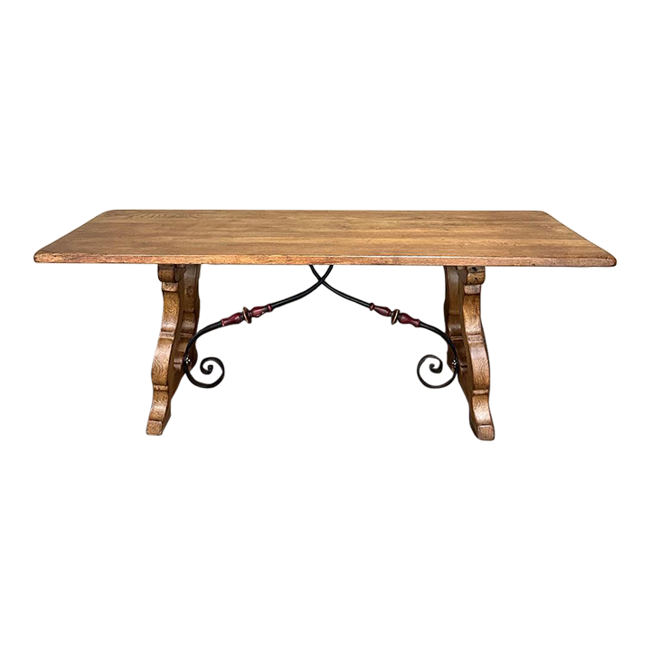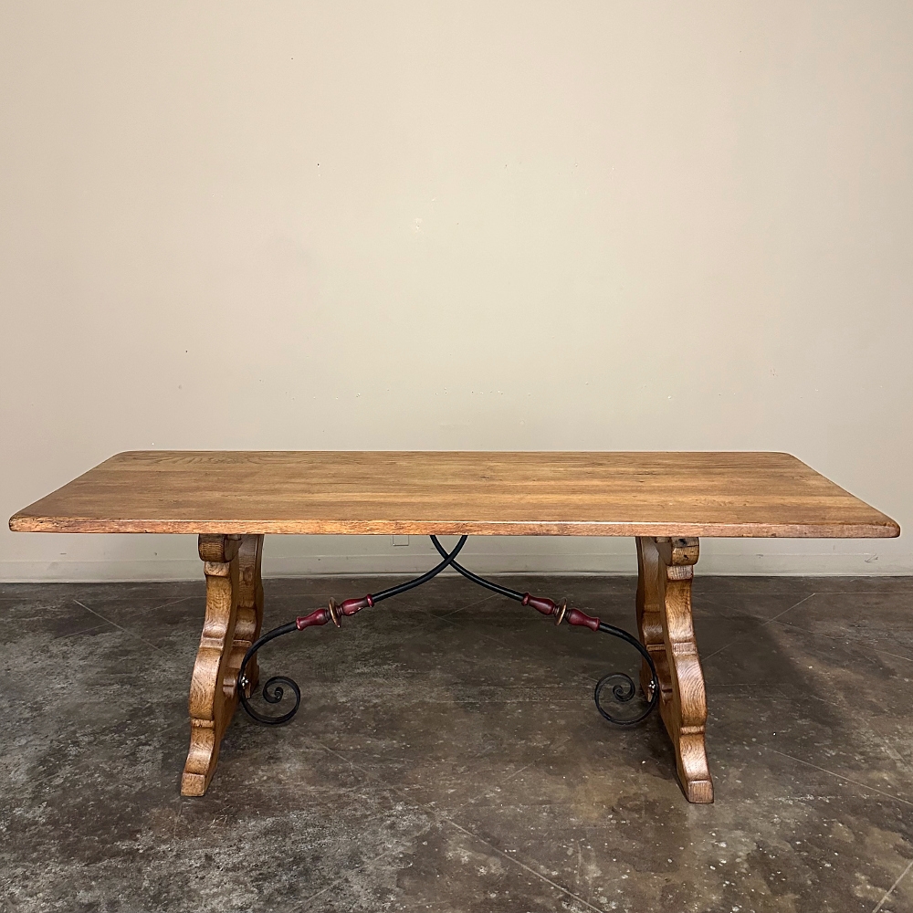 Antique Spanish Oak Dining Table was styled in the traditional manner which has been refined over the past several centuries in the Iberian peninsula! Utilizing dense, old-growth oak, the top was fashioned from solid planks so thick, a supporting apron was unnecessary, which leaves a maximum amount of welcome knee clearance. Support is provided by two lyre-shaped uprights connected to the top with perpendicular beams, and connected for structural strength via scrolled hand-forged stretchers that were artfully crafted with turnings painted red and gold for added visual appeal. The iron stretchers cross each other on their way to connect with the bottom of the table top's planks in a design that is as timeless as the traditions that inspired it. Literally built to last for generations, your family will enjoy this wonderful table for decades to come.
