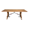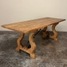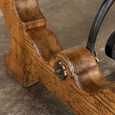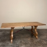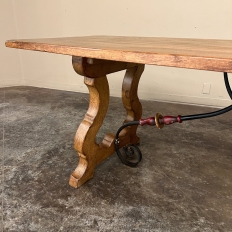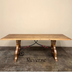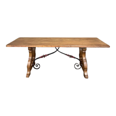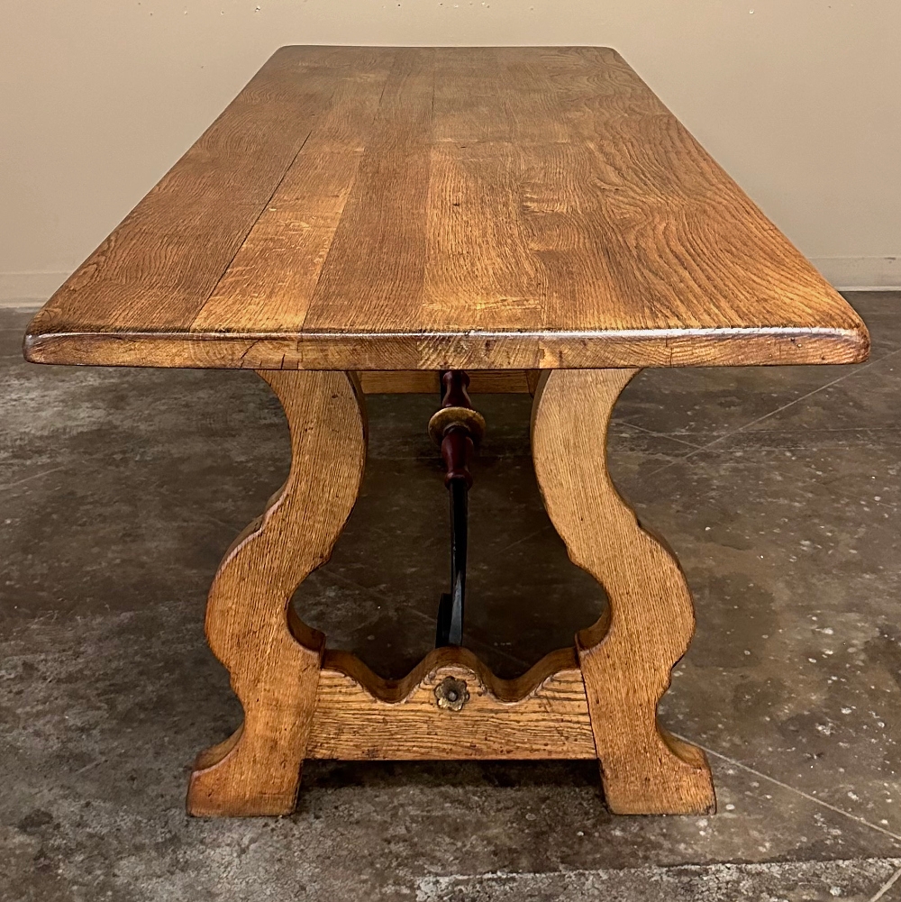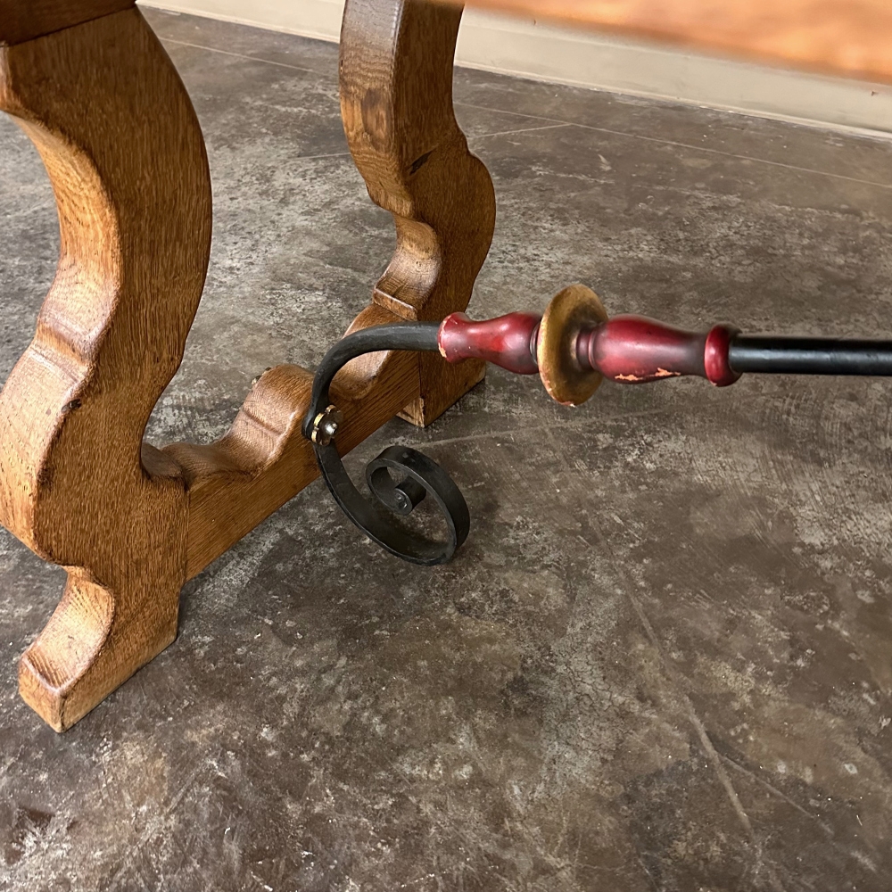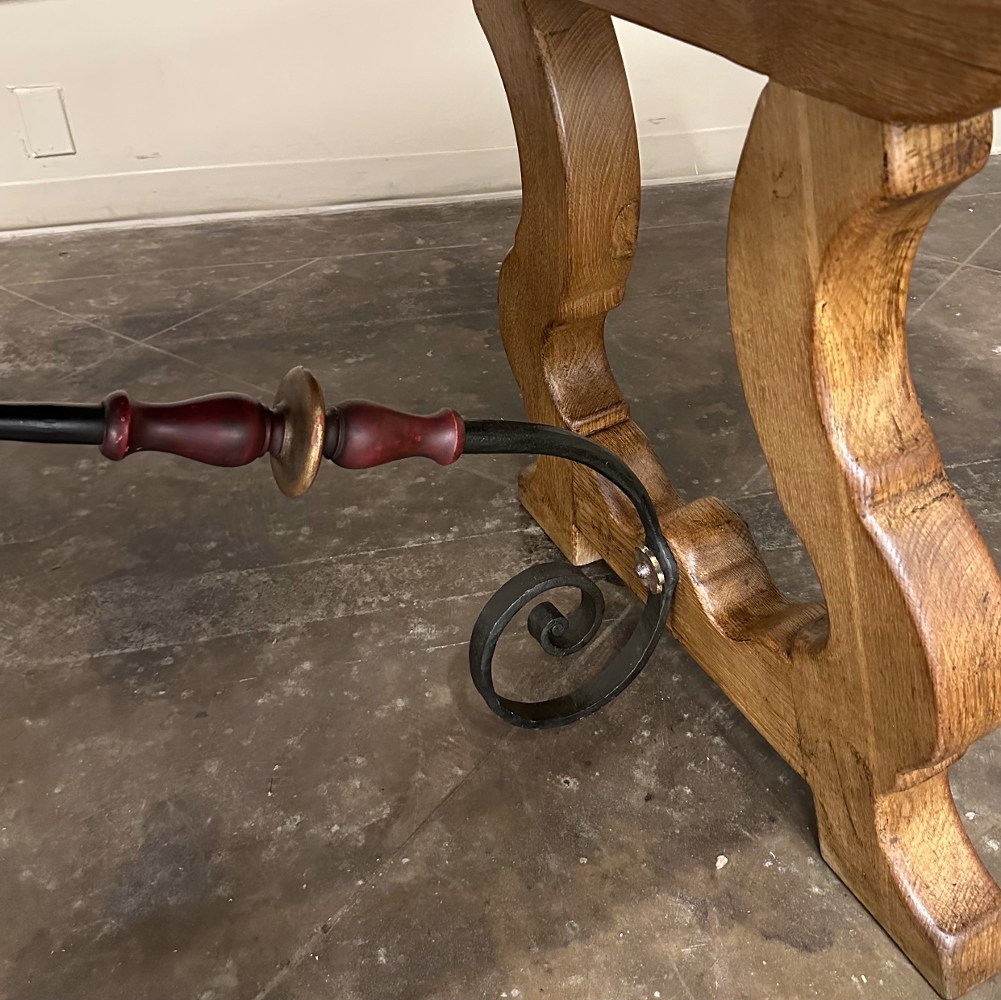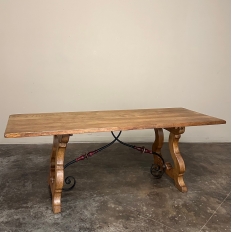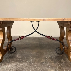 Antique Spanish Oak Dining Table was styled in the traditional manner which has been refined over the past several centuries in the Iberian peninsula! Utilizing dense, old-growth oak, the top was fashioned from solid planks so thick, a supporting apron was unnecessary, which leaves a maximum amount of welcome knee clearance. Support is provided by two lyre-shaped uprights connected to the top with perpendicular beams, and connected for structural strength via scrolled hand-forged stretchers that were artfully crafted with turnings painted red and gold for added visual appeal. The iron stretchers cross each other on their way to connect with the bottom of the table top's planks in a design that is as timeless as the traditions that inspired it. Literally built to last for generations, your family will enjoy this wonderful table for decades to come.