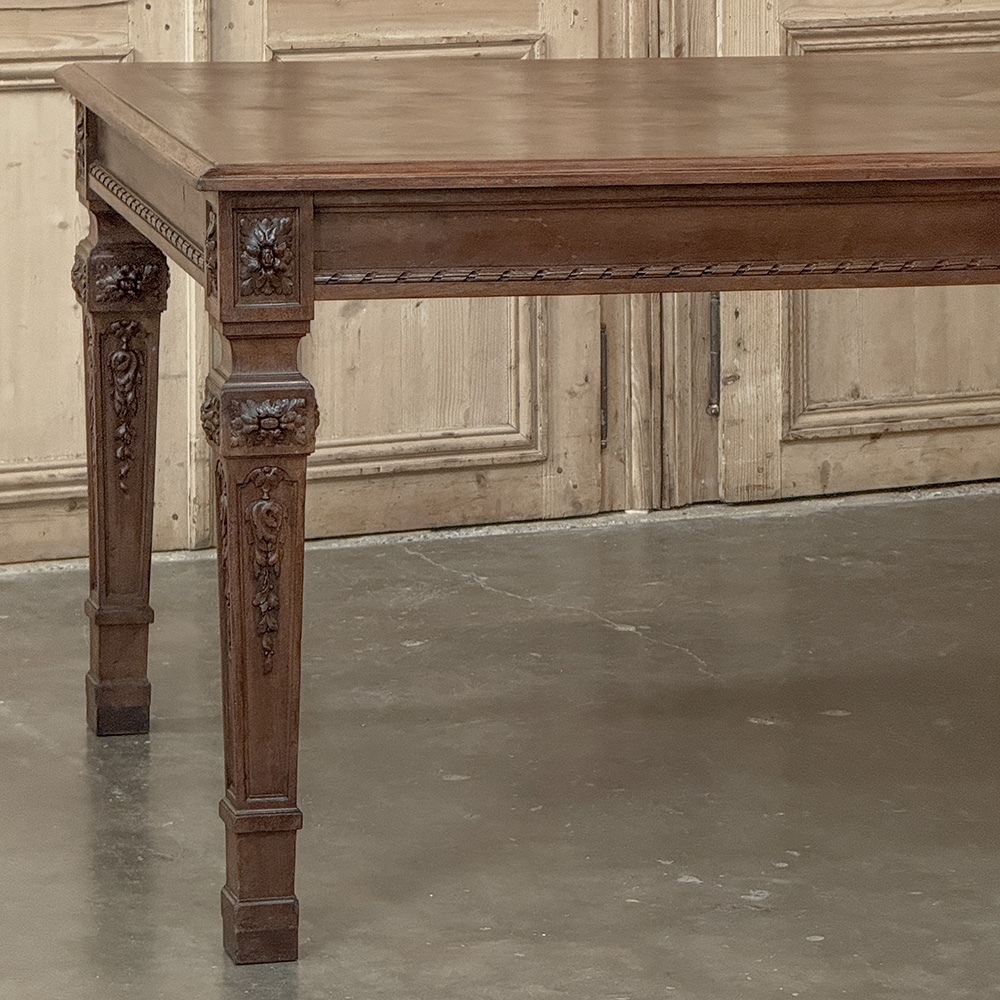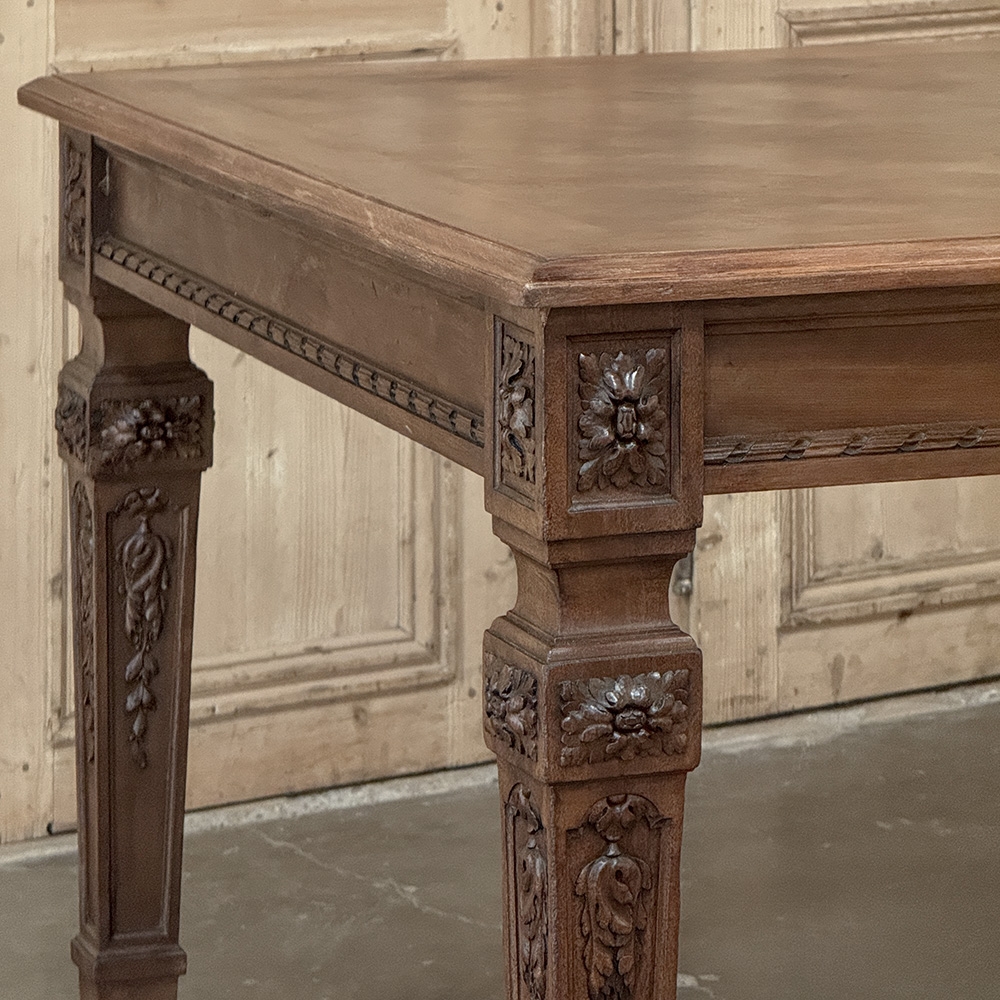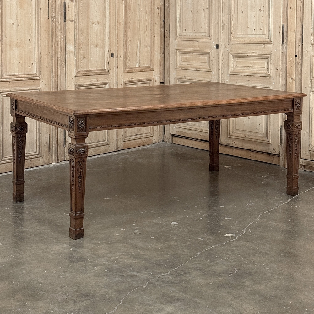 French Louis XVI Style Walnut Dining Table with Parquetry Top is beautifully proportioned dining table inspired by the refined symmetry of the Louis XVI tradition, and crafted in rich walnut with a warm, time-softened patina. The top is laid in understated parquetry, lending quiet texture and depth while maintaining a tailored, elegant surface.
