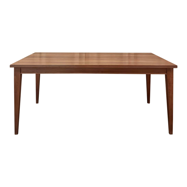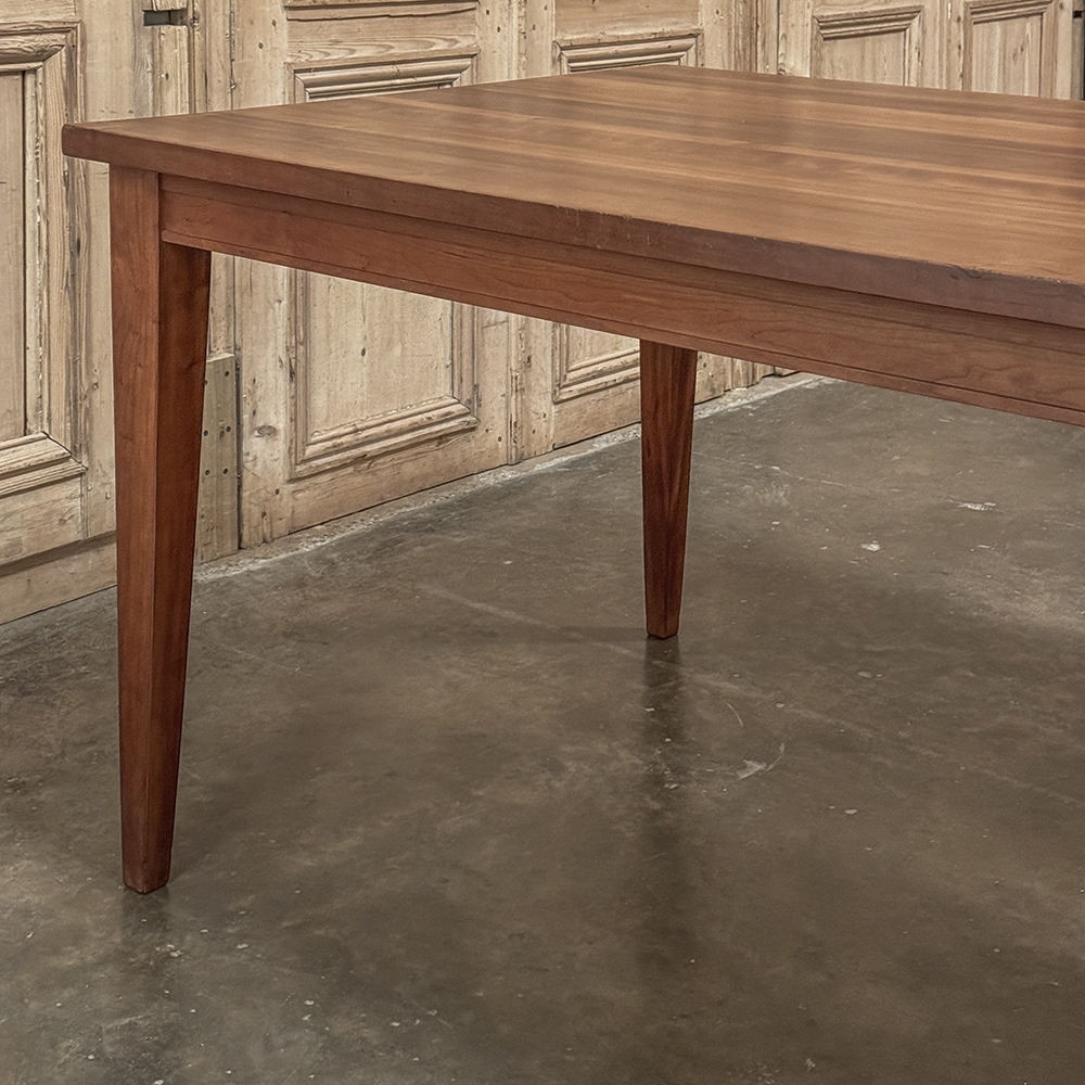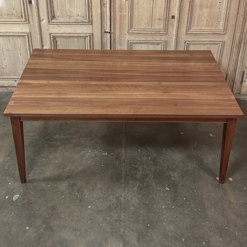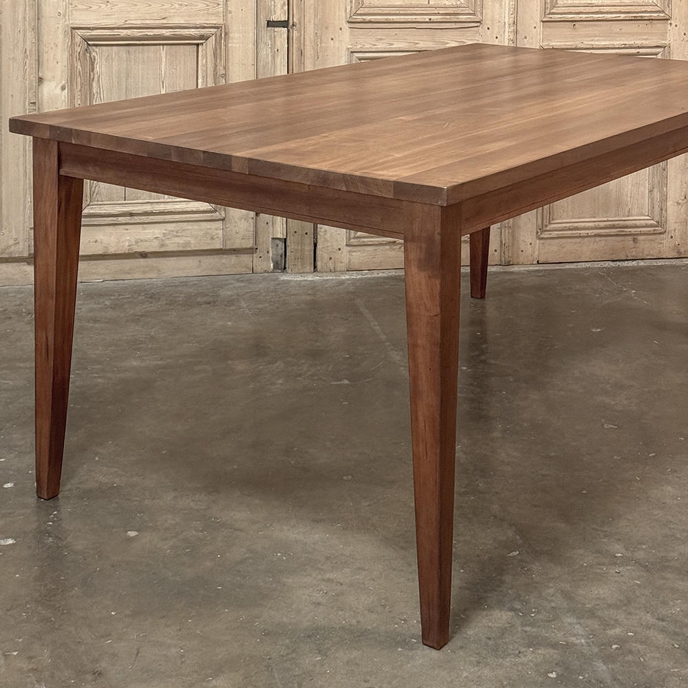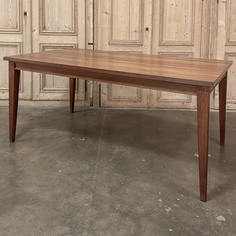 Mid-Century French Walnut Dining Table reflects the tailored architecture of the movement, with a straightforward approach to design that results in a simplistic beauty all its own! The rich grain and natural coloration of the wood shines forth in the finish, with a thick plank top reinforced by an apron that allows for more knee room than most older tables. The tapered post legs on each corner allow maximum room between the legs for your chairs, with lots of room on each end.