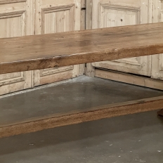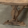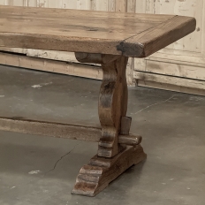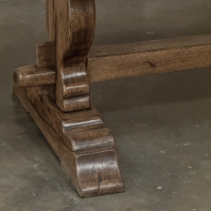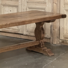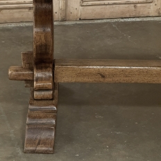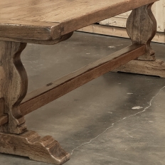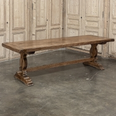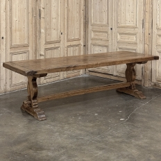 Rustic Antique Dining Table ~ Trestle Table in Solid Oak is the perfect choice for any family, being virtually indestructible while still affording more seating room than most tables due to its width over eight feet!  Knee room is maximized since the one and a half inch thick top planks need no supporting apron.  The lyre shape of the legs is also a very strong design, enhanced even further by a trestle shimmed into place, with the feet at the bottom elegantly contoured to eliminate sharp corners and snagging your shoes as you get up from the table.  A timeless, classic design executed in solid, durable oak that your entire family can enjoy for generations!