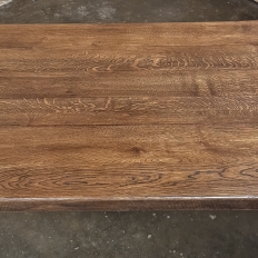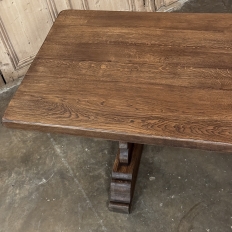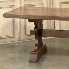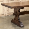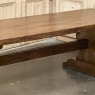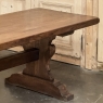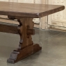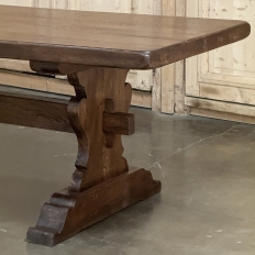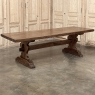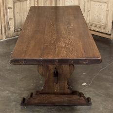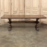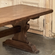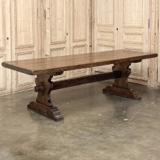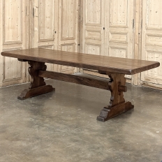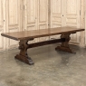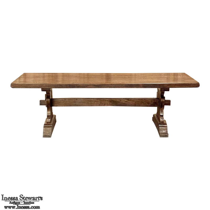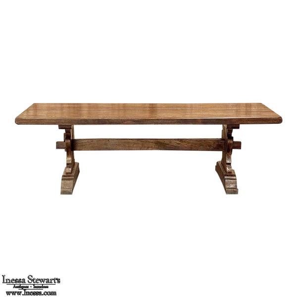 Rustic Antique Dining Table ~ Trestle Table in Solid Oak is yet another perfect choice for any family, being virtually indestructible while still affording more seating room than most tables due to its width over eight feet! Knee room is maximized since the one and a half inch thick top planks need no supporting apron. The lyre shape of the legs cut in the Italian style is also a very strong design, enhanced even further by a trestle shimmed into place, with the feet at the bottom elegantly contoured to eliminate sharp corners and snagging your shoes as you get up from the table. Lots of overhang on the ends makes the Lord and Lady of the Manoir more comfortable. A timeless, classic design executed in solid, durable oak that your entire family can enjoy for generations!