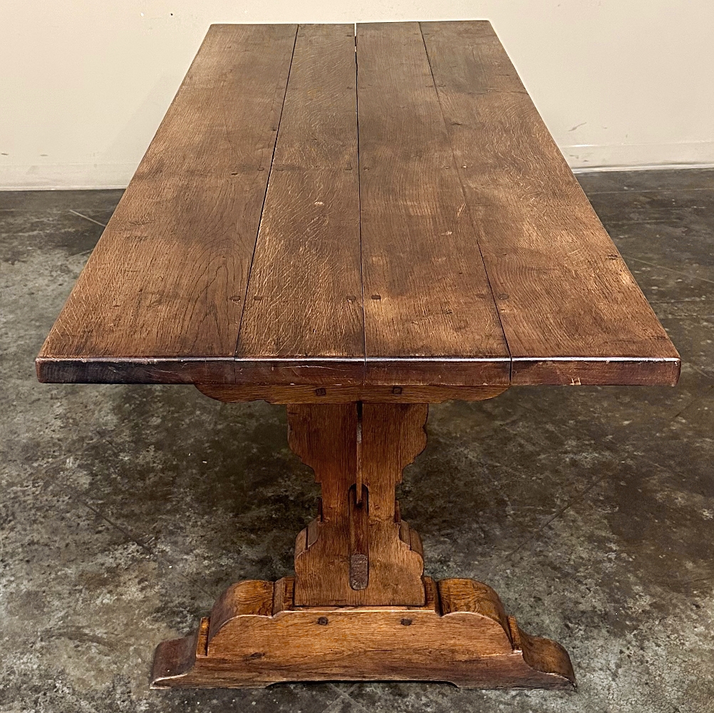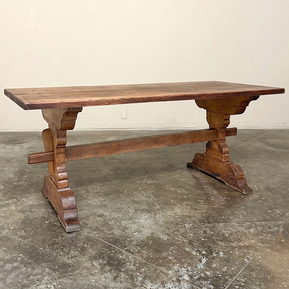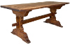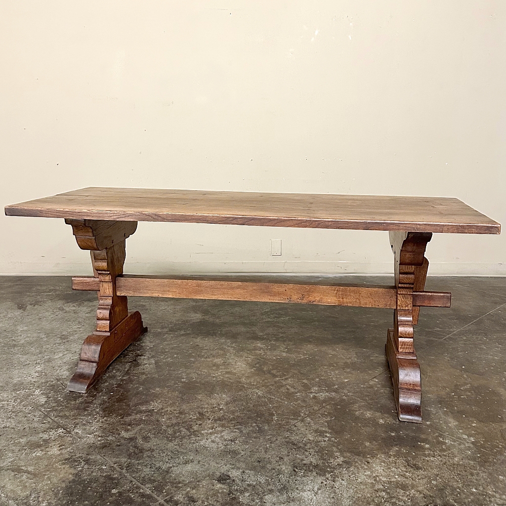 Rustic Trestle Dining Table was crafted from thick planks of solid oak to literally last for generations. The plank top is so sturdy, a supporting apron is unnecessary, providing more knee clearance than other designs. Support is provided by massive side structures gracefully cut to provide the necessary solidity of the table while still amplifying leg and foot room. Even the trestle which is fully mortised and shimmed into place, is raised up to allow more space close to the floor while still adding to the stability of the table. An ingenious design that has been handed down from generation to generation, such trestle tables as this are destined to become instant family heirlooms!