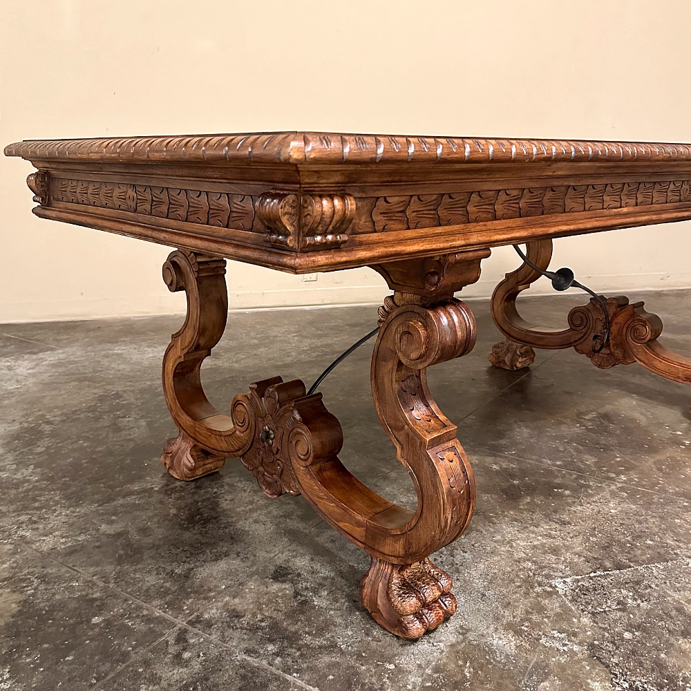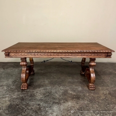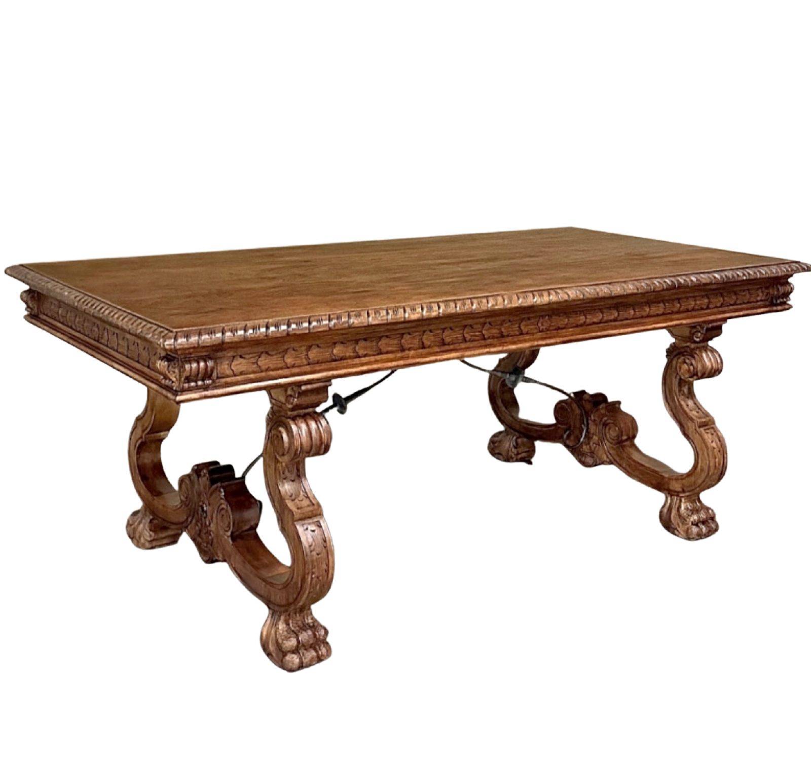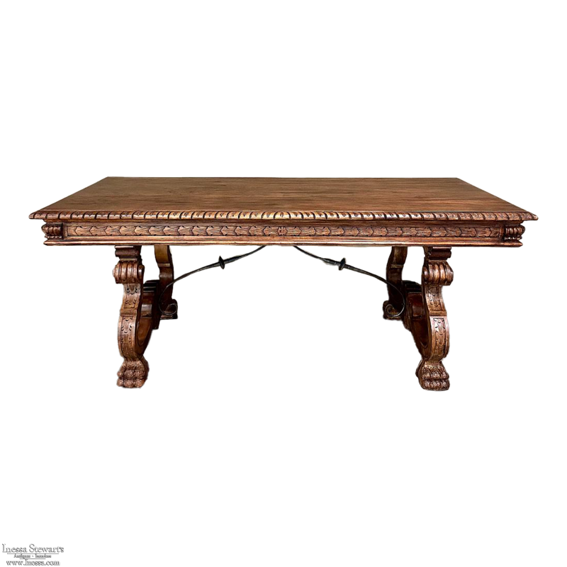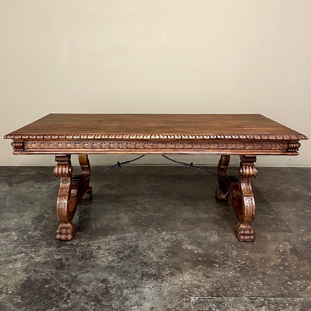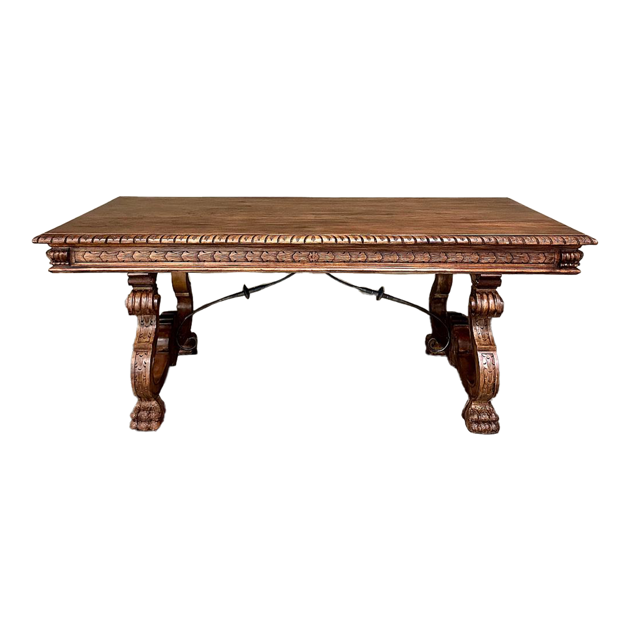 SaleVintage Spanish Renaissance Dining Table recalls the glory years of the Renaissance, with exuberantly carved leg supports on each side in the shape of a complex lyre form, situated atop elegantly flourished feet, and connected via a beam to the underside of the top, as well as with scrolled wrought iron stretchers that connect to the center of the lyre forms inside. Such a design is centuries old, and still represents an ingenious design that is truly timeless! The table top itself is lavished with thick walnut veneering for a subtle contrast, with gadrooned edge overlooking an apron subtly carved with an overlay design, and side-by side corbels on each corner. The stripped finish creates a soft visual appearance that is perfect for today's more casual decors, and the sheer quality of the materials and construction will ensure decade after decade of enjoyment!