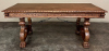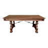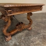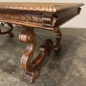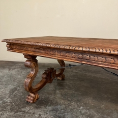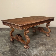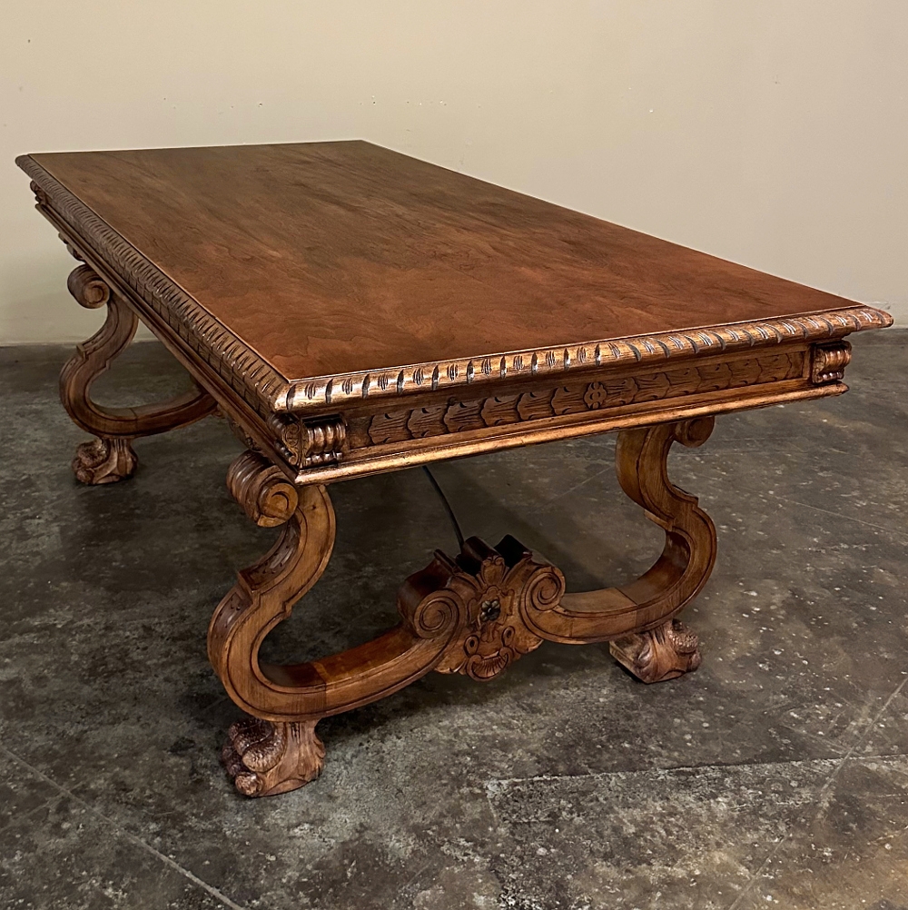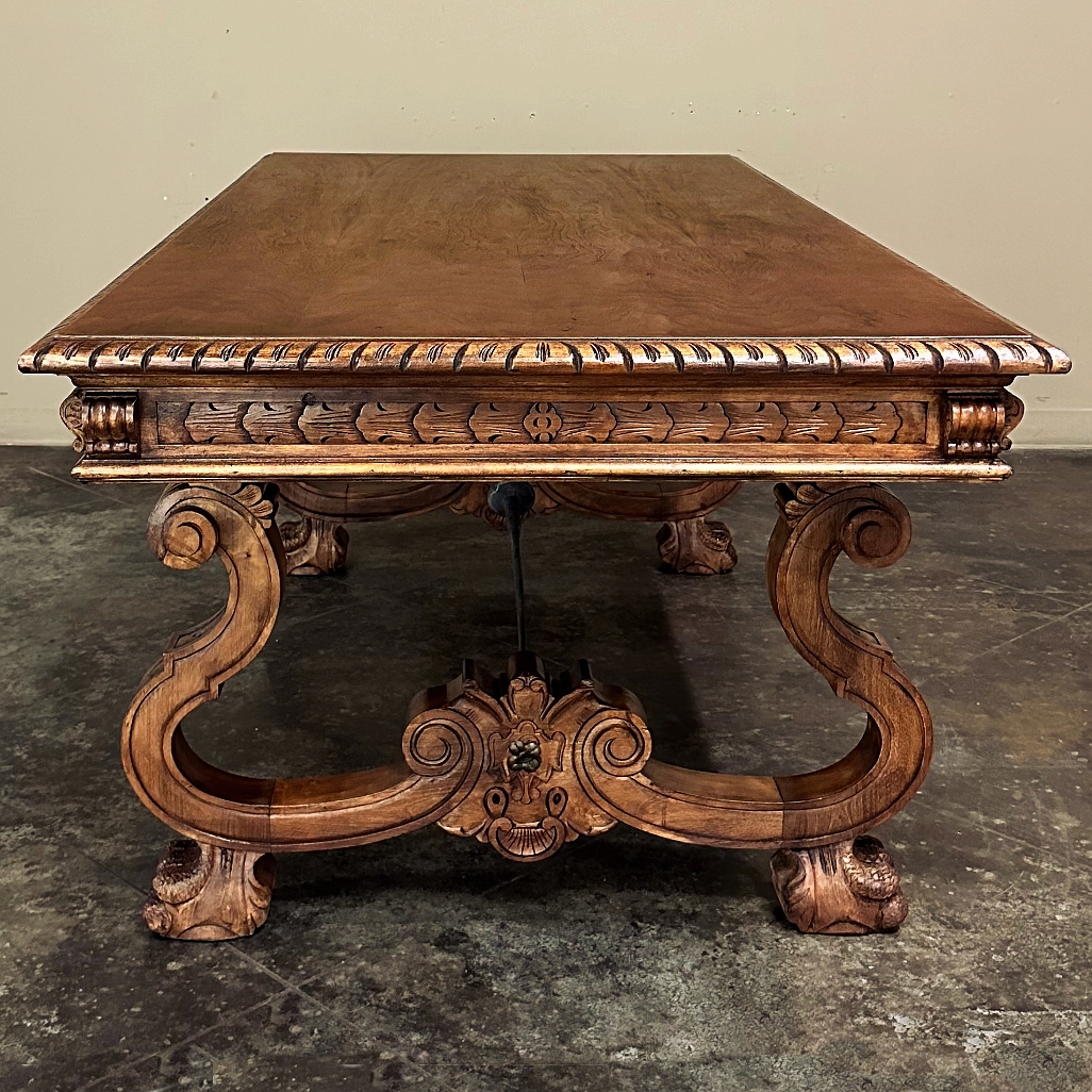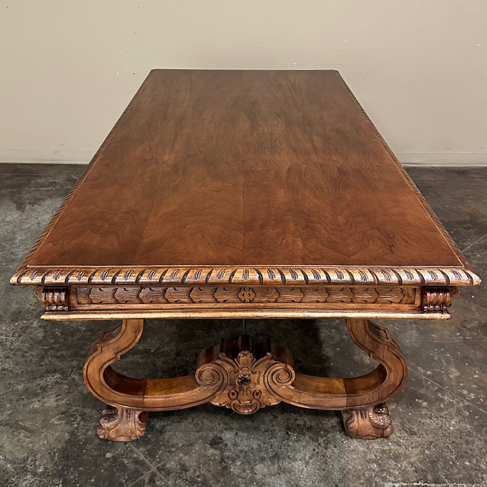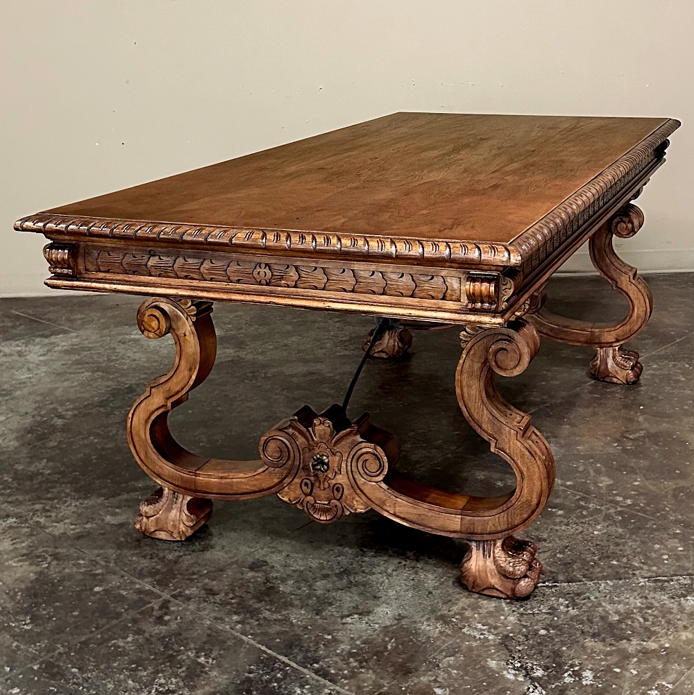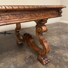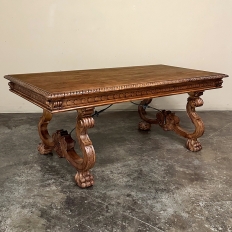 SaleVintage Spanish Renaissance Dining Table recalls the glory years of the Renaissance, with exuberantly carved leg supports on each side in the shape of a complex lyre form, situated atop elegantly flourished feet, and connected via a beam to the underside of the top, as well as with scrolled wrought iron stretchers that connect to the center of the lyre forms inside. Such a design is centuries old, and still represents an ingenious design that is truly timeless! The table top itself is lavished with thick walnut veneering for a subtle contrast, with gadrooned edge overlooking an apron subtly carved with an overlay design, and side-by side corbels on each corner. The stripped finish creates a soft visual appearance that is perfect for today's more casual decors, and the sheer quality of the materials and construction will ensure decade after decade of enjoyment!