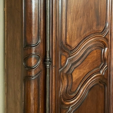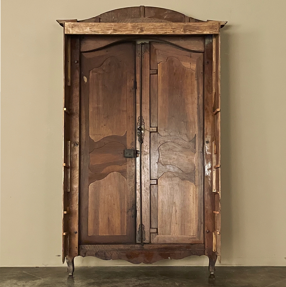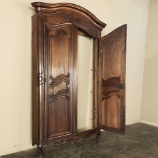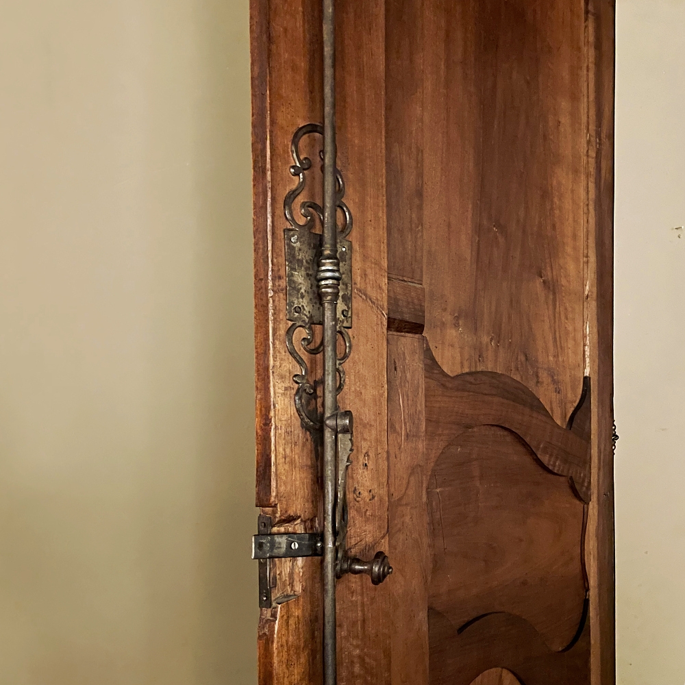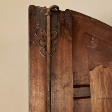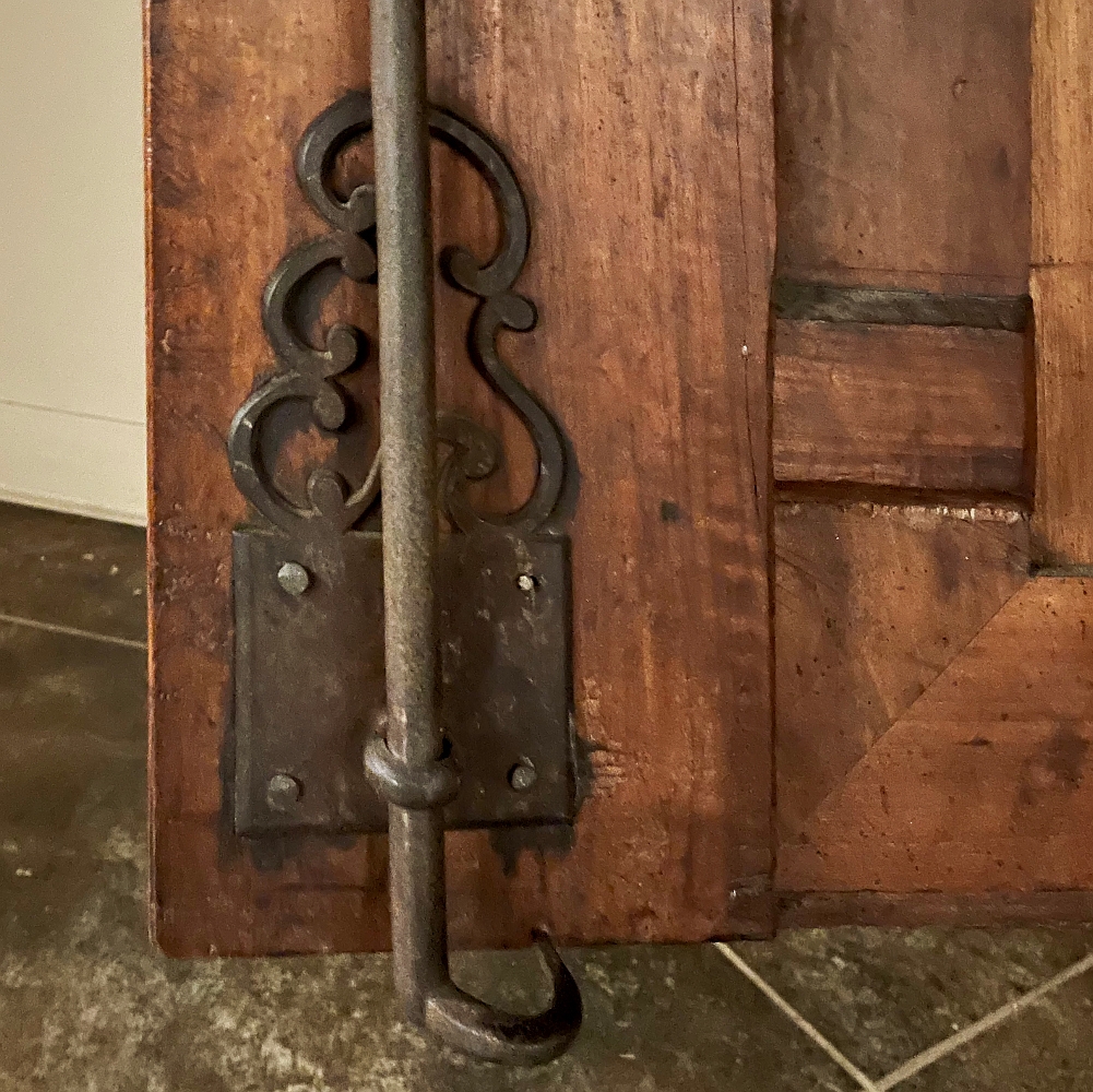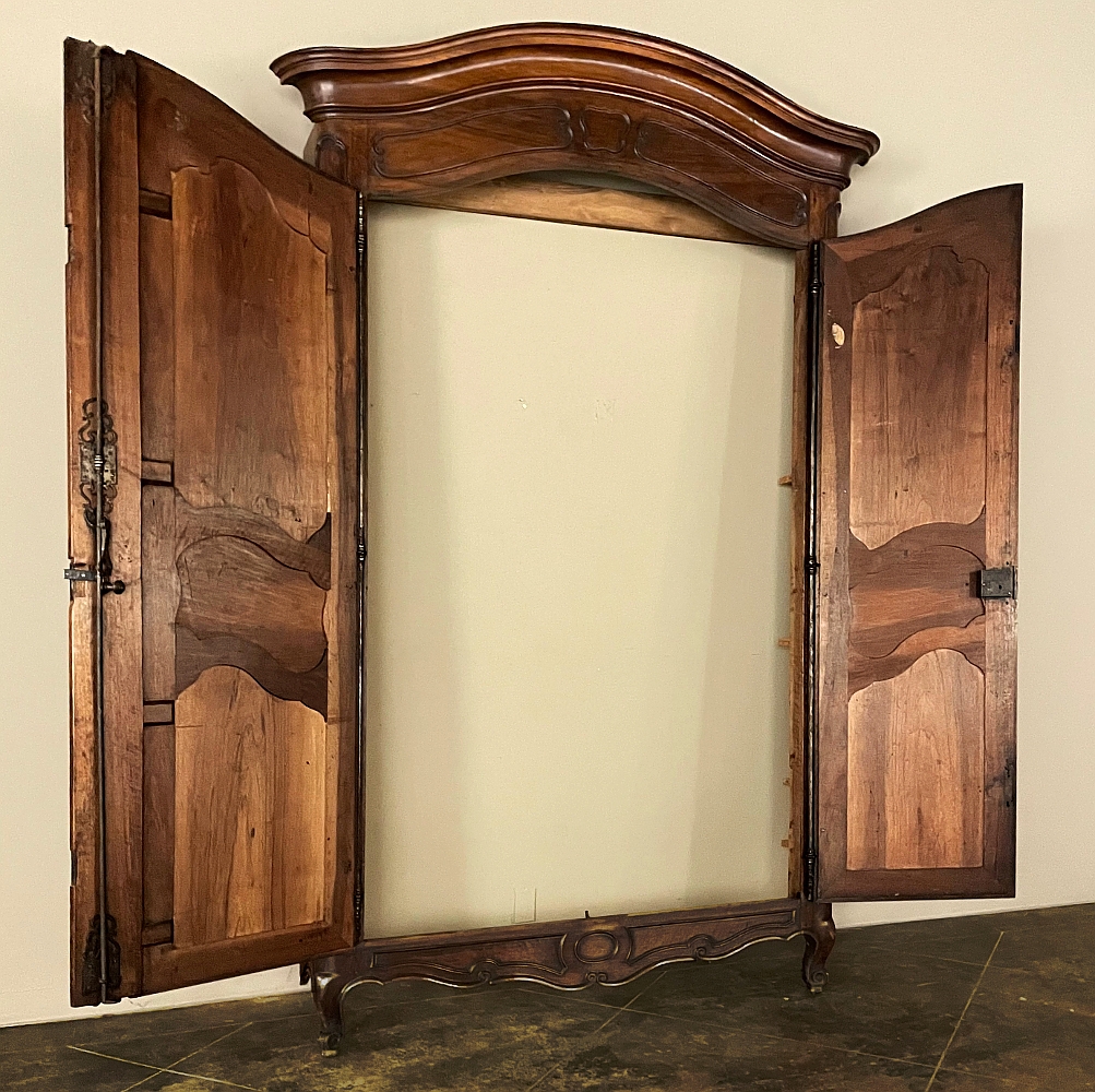 SalePair Grand 18th Century Country French Walnut Doors ~ Plaquards in Frame are ideal for creating a wall accent or for using in your architectural plan to add interest that simply cannot be duplicated with today's materials and craftsmanship! Fine French scrollwork is evident in the raised & recessed panel work which is enhanced by carved molding detail. The frame includes the original corner posts with full length barrel hinges that lead the eye up to the impressive chapeau de gendarme cornice & crown on top. Unmistakably French in design, the doors open wide to reveal the original locking mechanism on the left door, with a replacement lock on the right installed about a century ago. Ideal for creating a one-of-a-kind built-in cabinet opening in the kitchen, family room or bedroom, and great for concealing an entertainment center recessed into the wall!