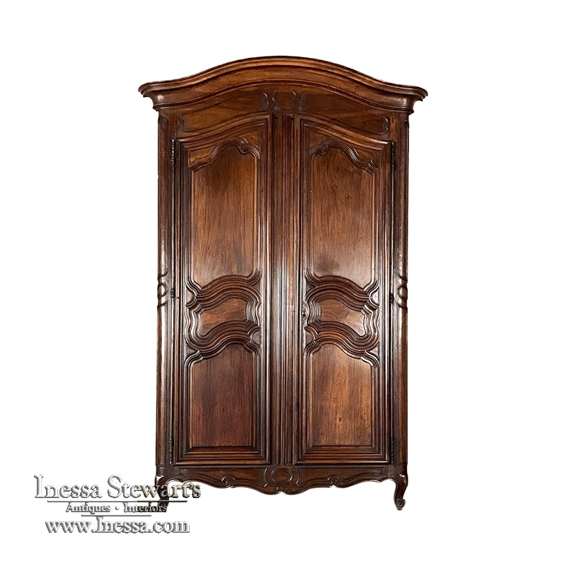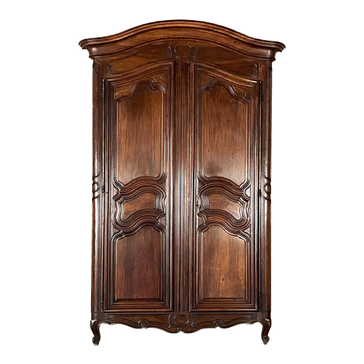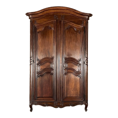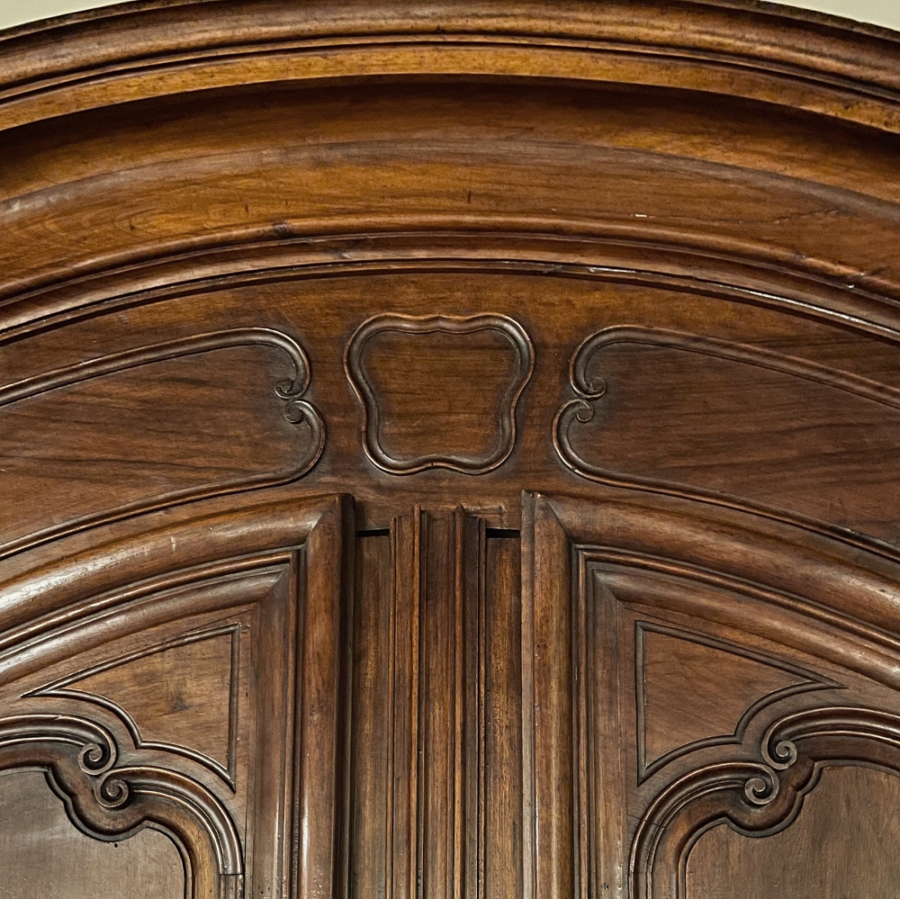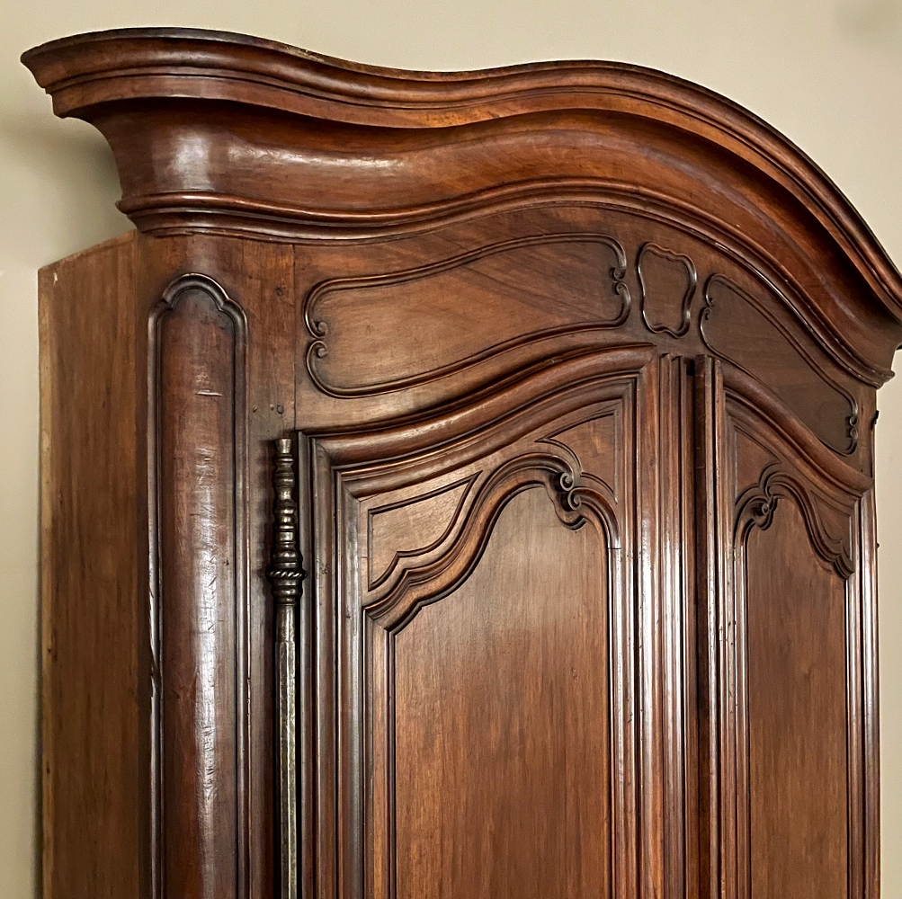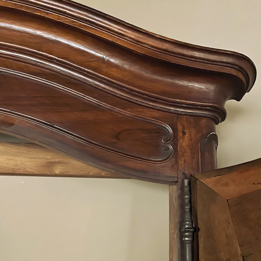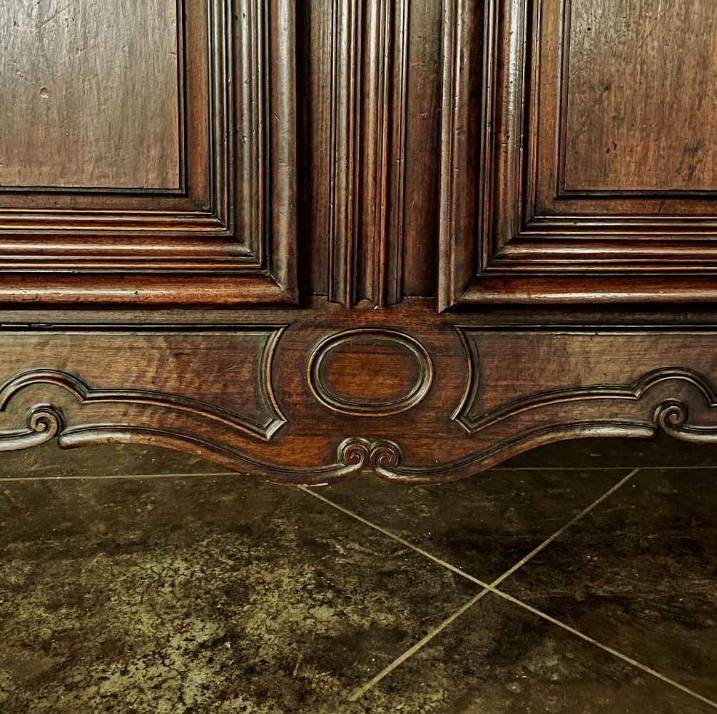 SalePair Grand 18th Century Country French Walnut Doors ~ Plaquards in Frame are ideal for creating a wall accent or for using in your architectural plan to add interest that simply cannot be duplicated with today's materials and craftsmanship! Fine French scrollwork is evident in the raised & recessed panel work which is enhanced by carved molding detail. The frame includes the original corner posts with full length barrel hinges that lead the eye up to the impressive chapeau de gendarme cornice & crown on top. Unmistakably French in design, the doors open wide to reveal the original locking mechanism on the left door, with a replacement lock on the right installed about a century ago. Ideal for creating a one-of-a-kind built-in cabinet opening in the kitchen, family room or bedroom, and great for concealing an entertainment center recessed into the wall!