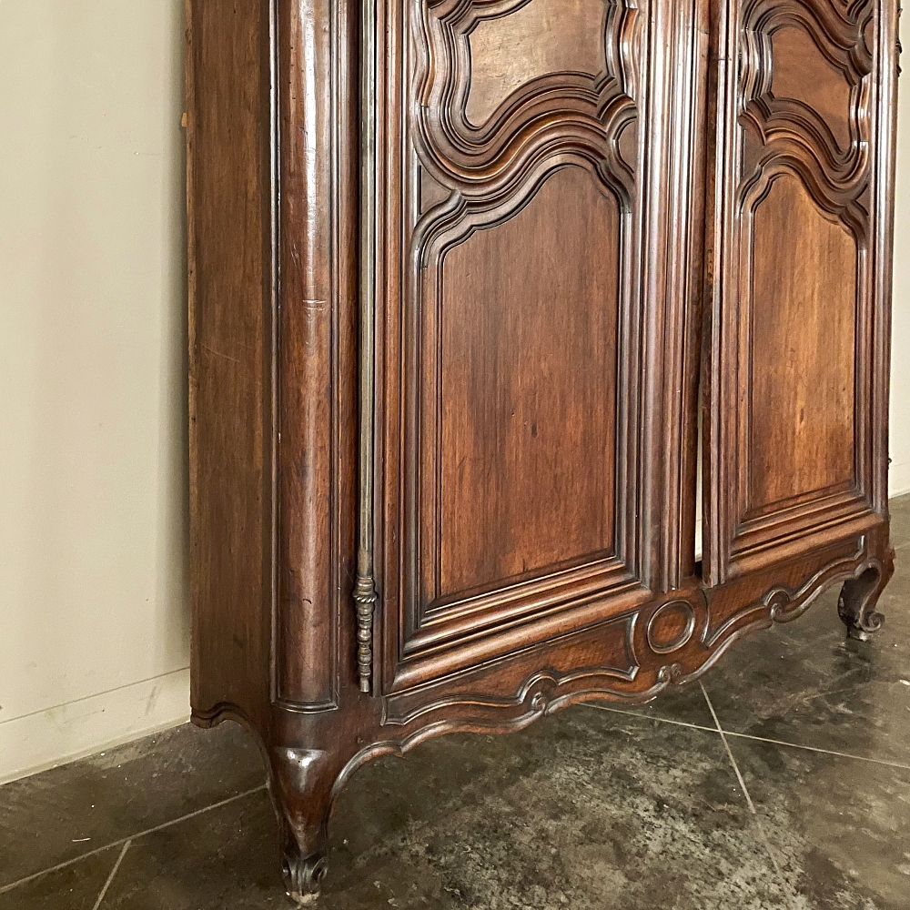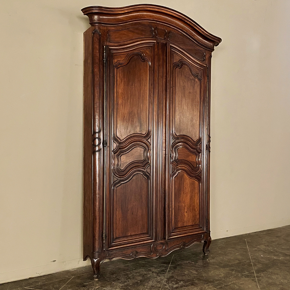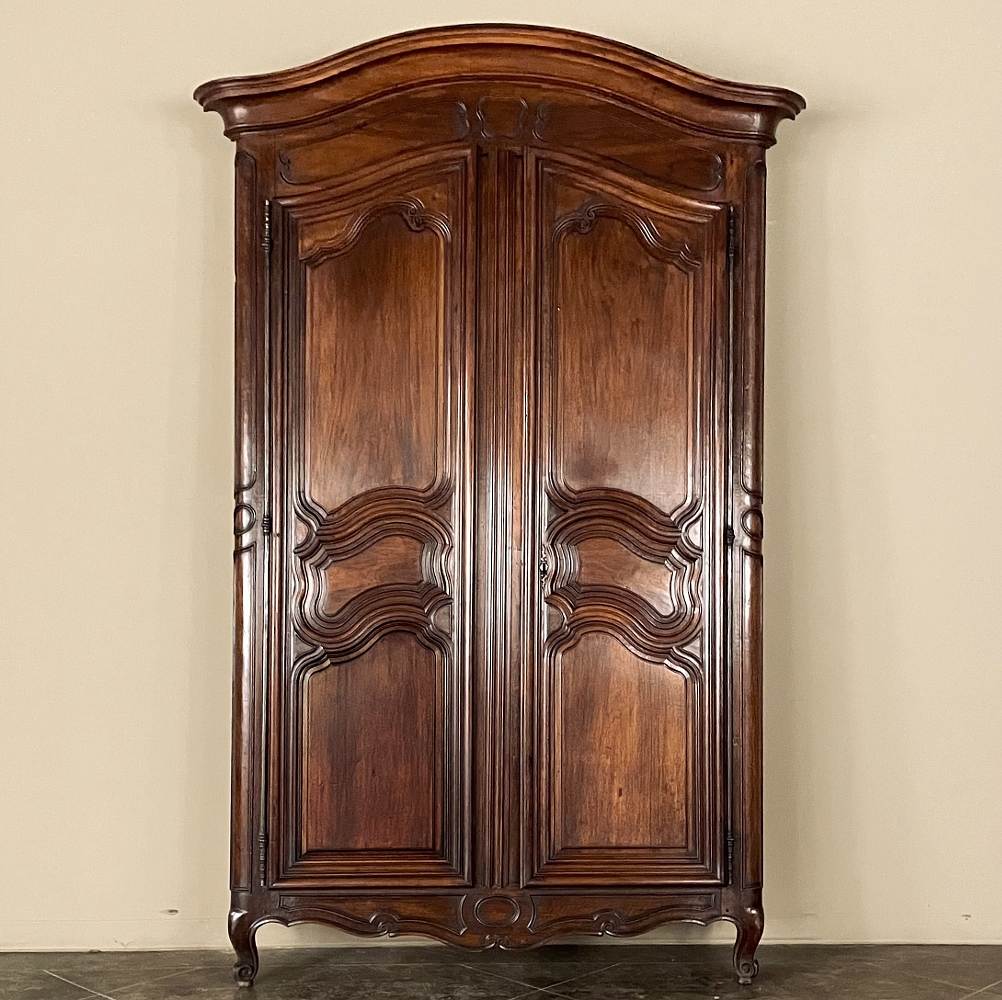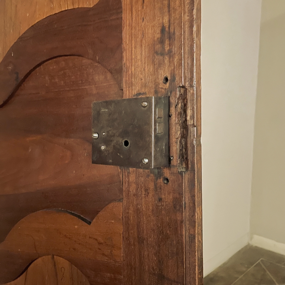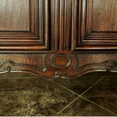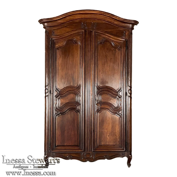 SalePair Grand 18th Century Country French Walnut Doors ~ Plaquards in Frame are ideal for creating a wall accent or for using in your architectural plan to add interest that simply cannot be duplicated with today's materials and craftsmanship! Fine French scrollwork is evident in the raised & recessed panel work which is enhanced by carved molding detail. The frame includes the original corner posts with full length barrel hinges that lead the eye up to the impressive chapeau de gendarme cornice & crown on top. Unmistakably French in design, the doors open wide to reveal the original locking mechanism on the left door, with a replacement lock on the right installed about a century ago. Ideal for creating a one-of-a-kind built-in cabinet opening in the kitchen, family room or bedroom, and great for concealing an entertainment center recessed into the wall!