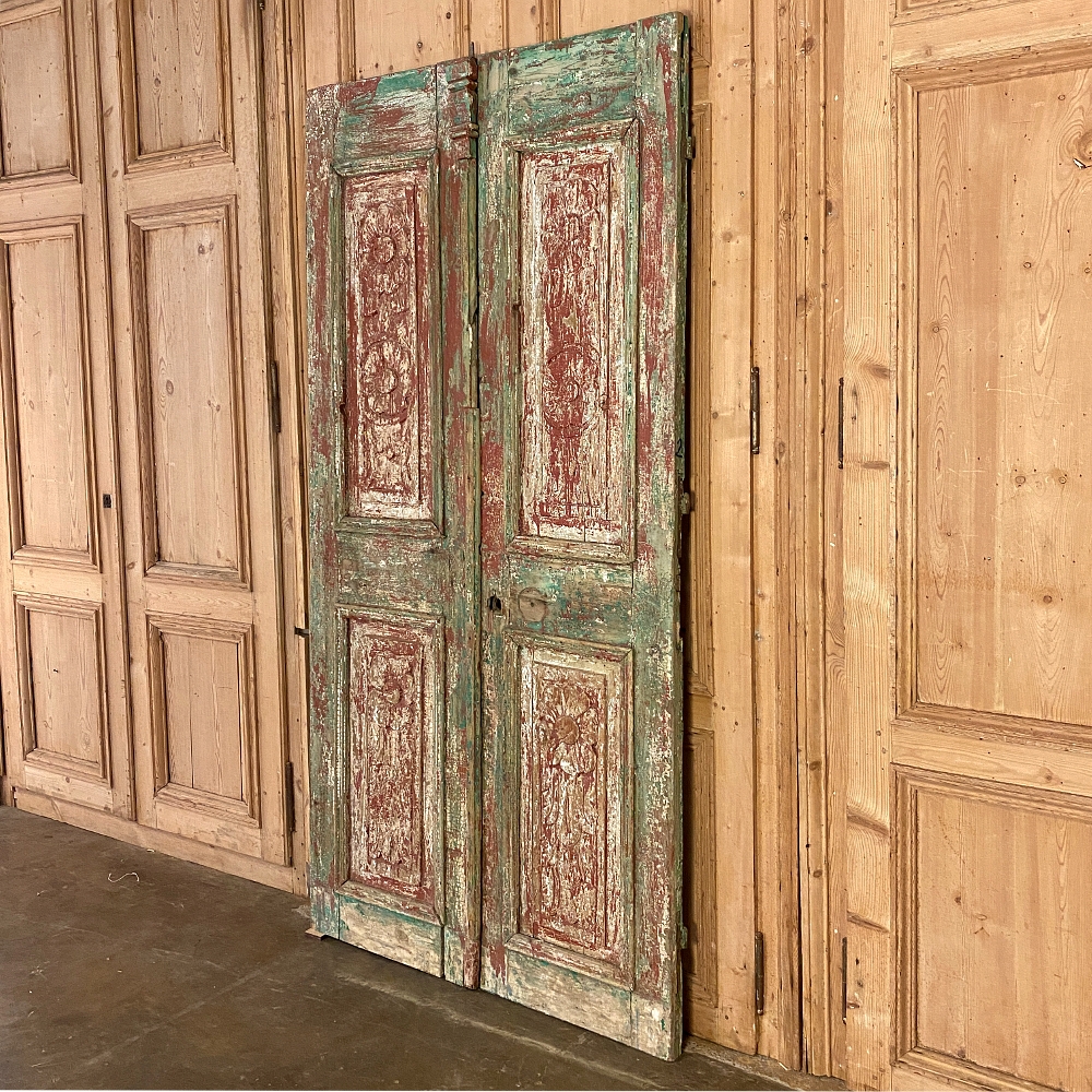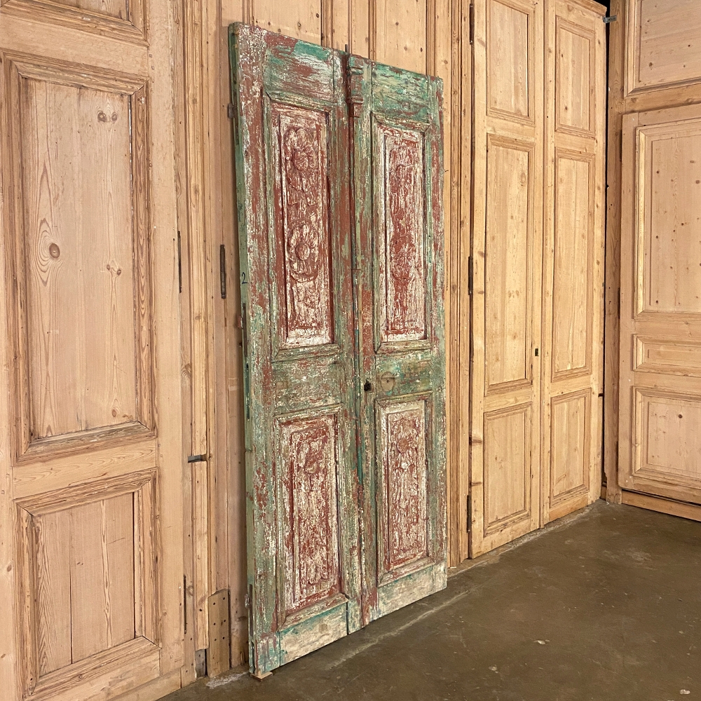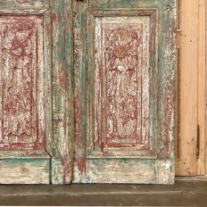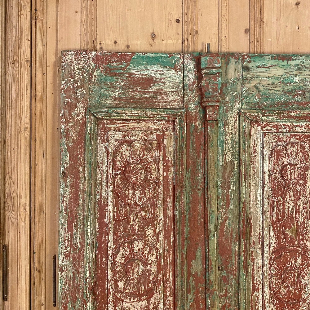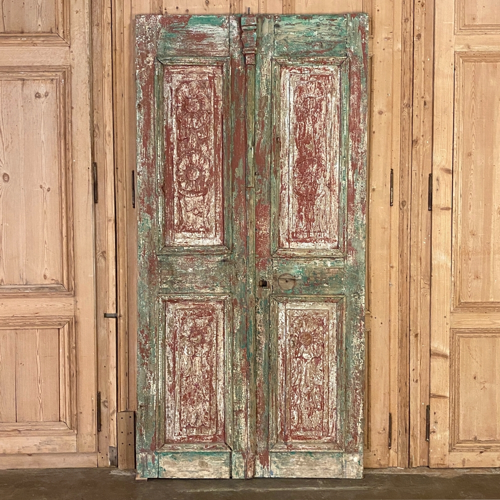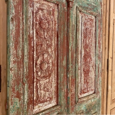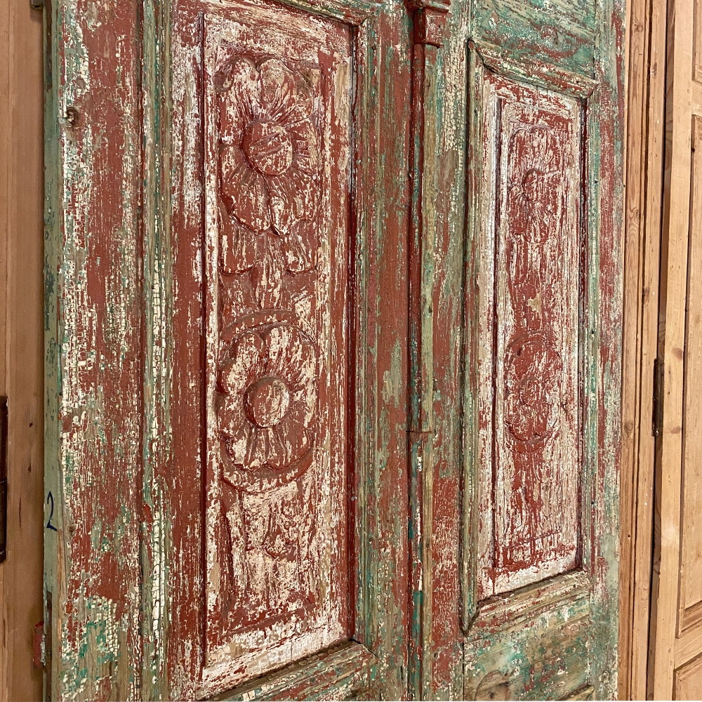 SalePair 19th Century Country French Painted Doors will make a delightful entryway or passageway and can even be used to create visual interest just placed on a blank wall! Hand-crafted using centuries-old techniques, each features raised & recessed panels with quaint floral and foliage carved into the front face. Several decades of painted finishes are evident in the distressed look, only adding to the charm!
