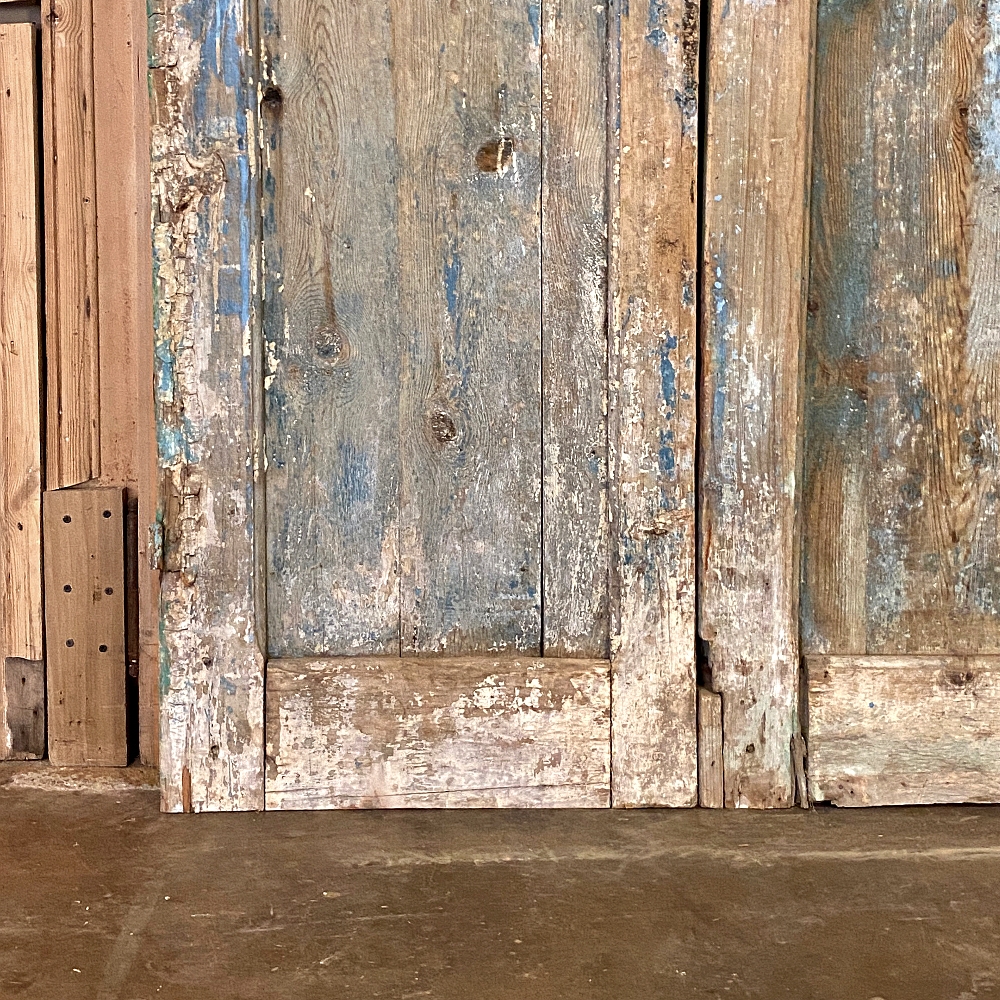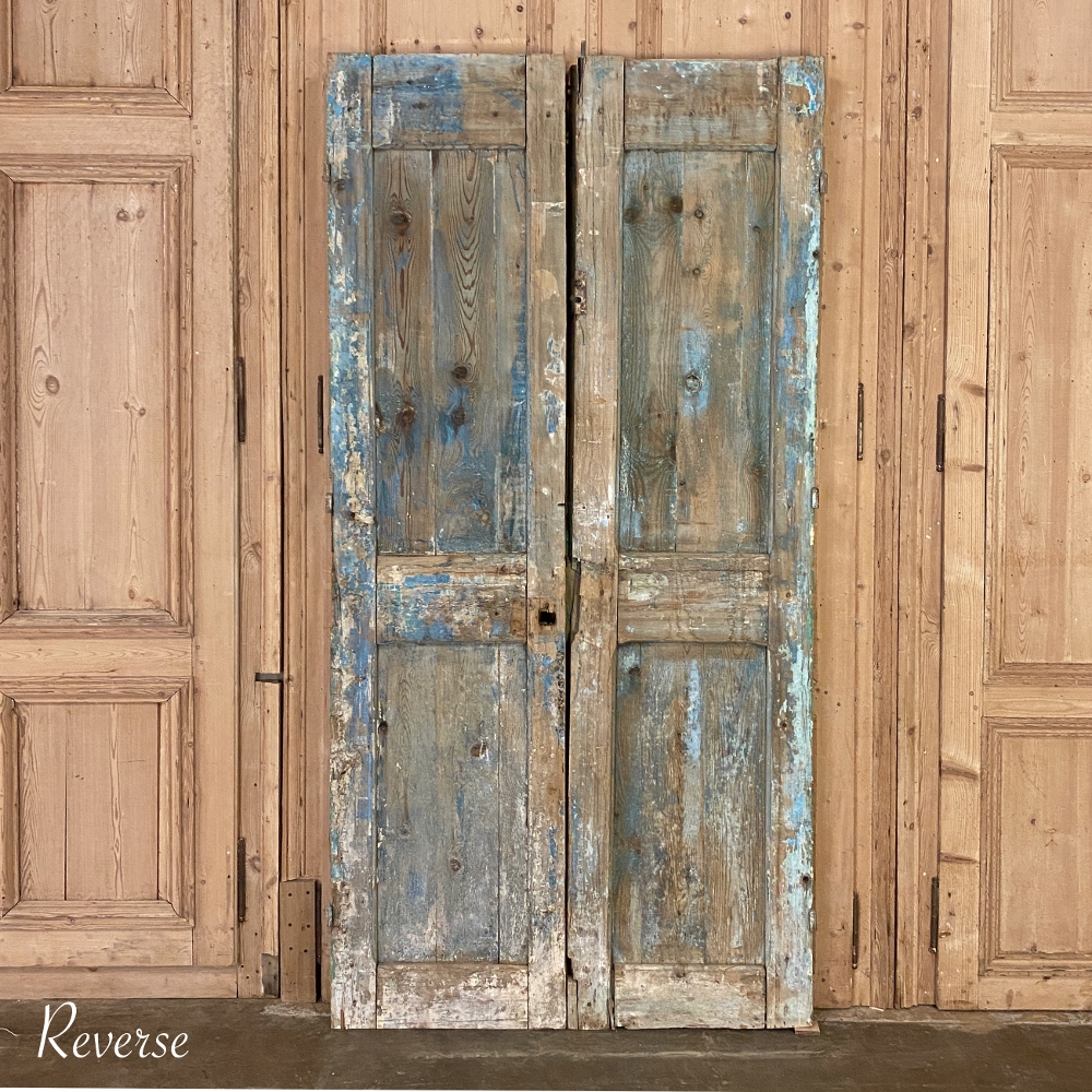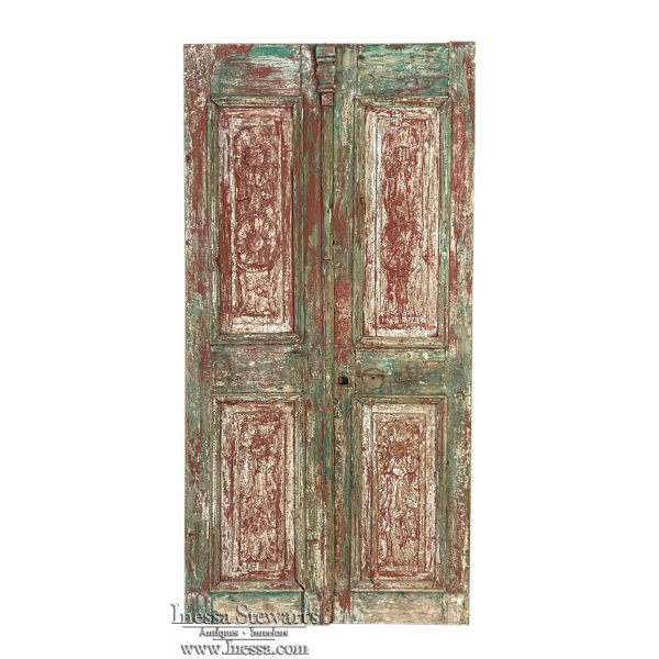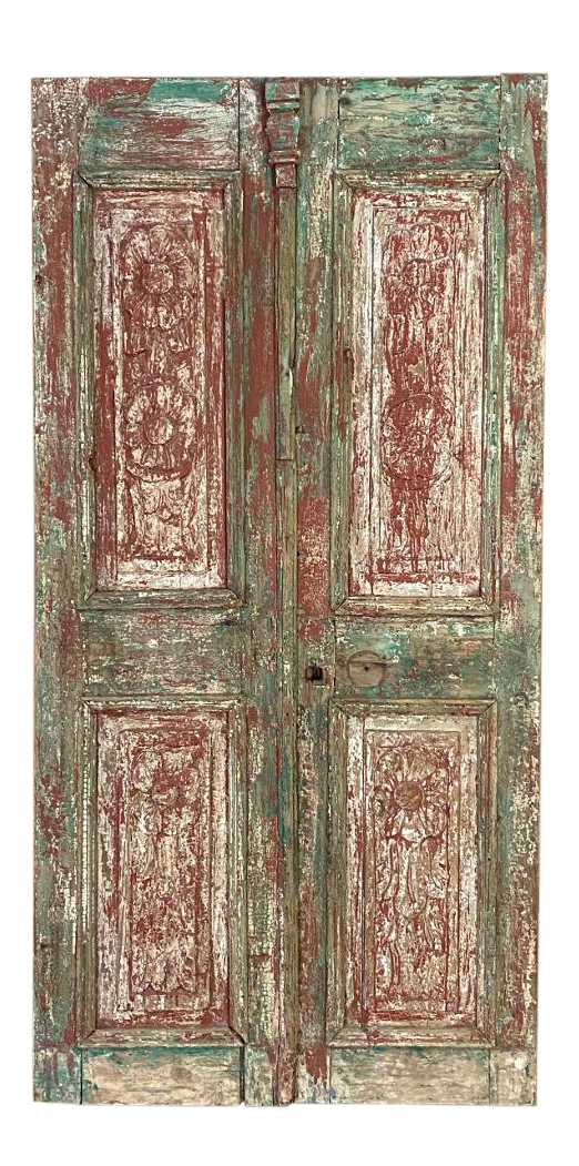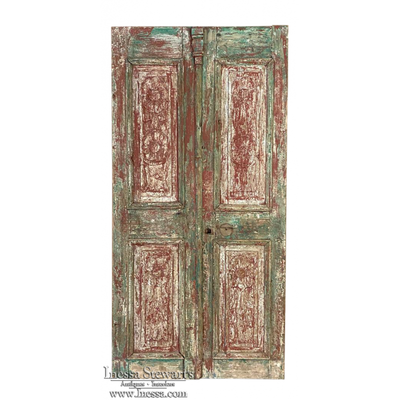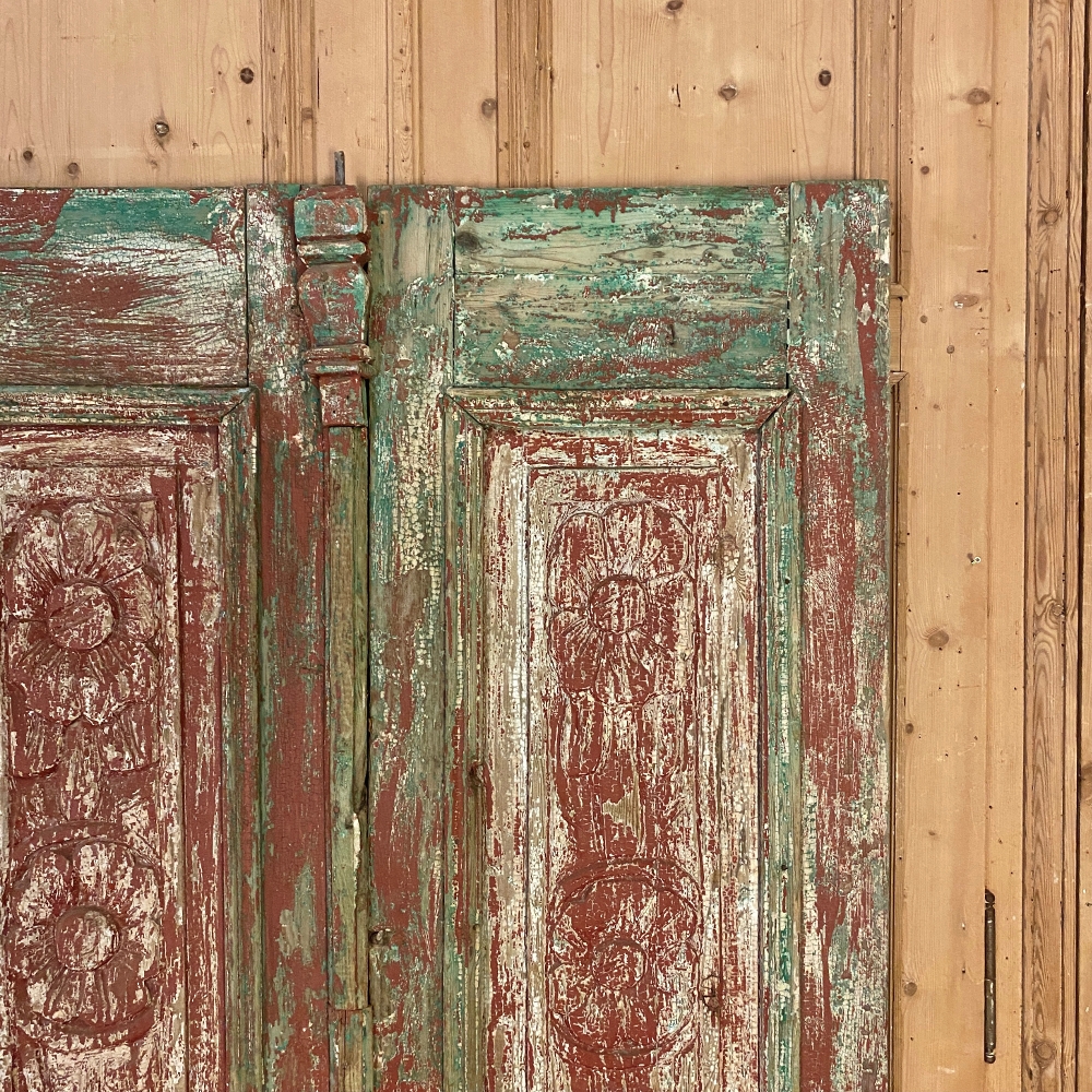 SalePair 19th Century Country French Painted Doors will make a delightful entryway or passageway and can even be used to create visual interest just placed on a blank wall! Hand-crafted using centuries-old techniques, each features raised & recessed panels with quaint floral and foliage carved into the front face. Several decades of painted finishes are evident in the distressed look, only adding to the charm!