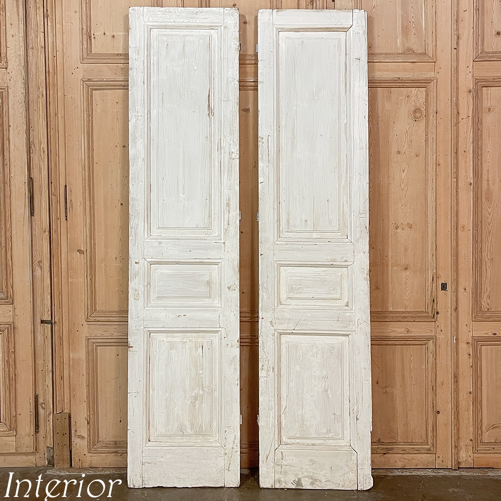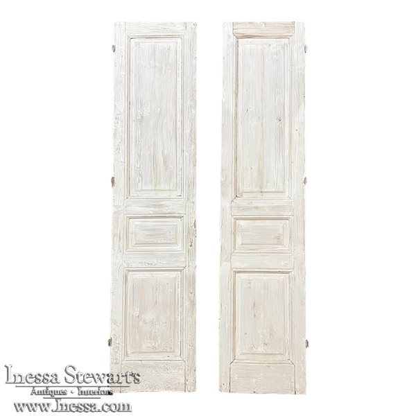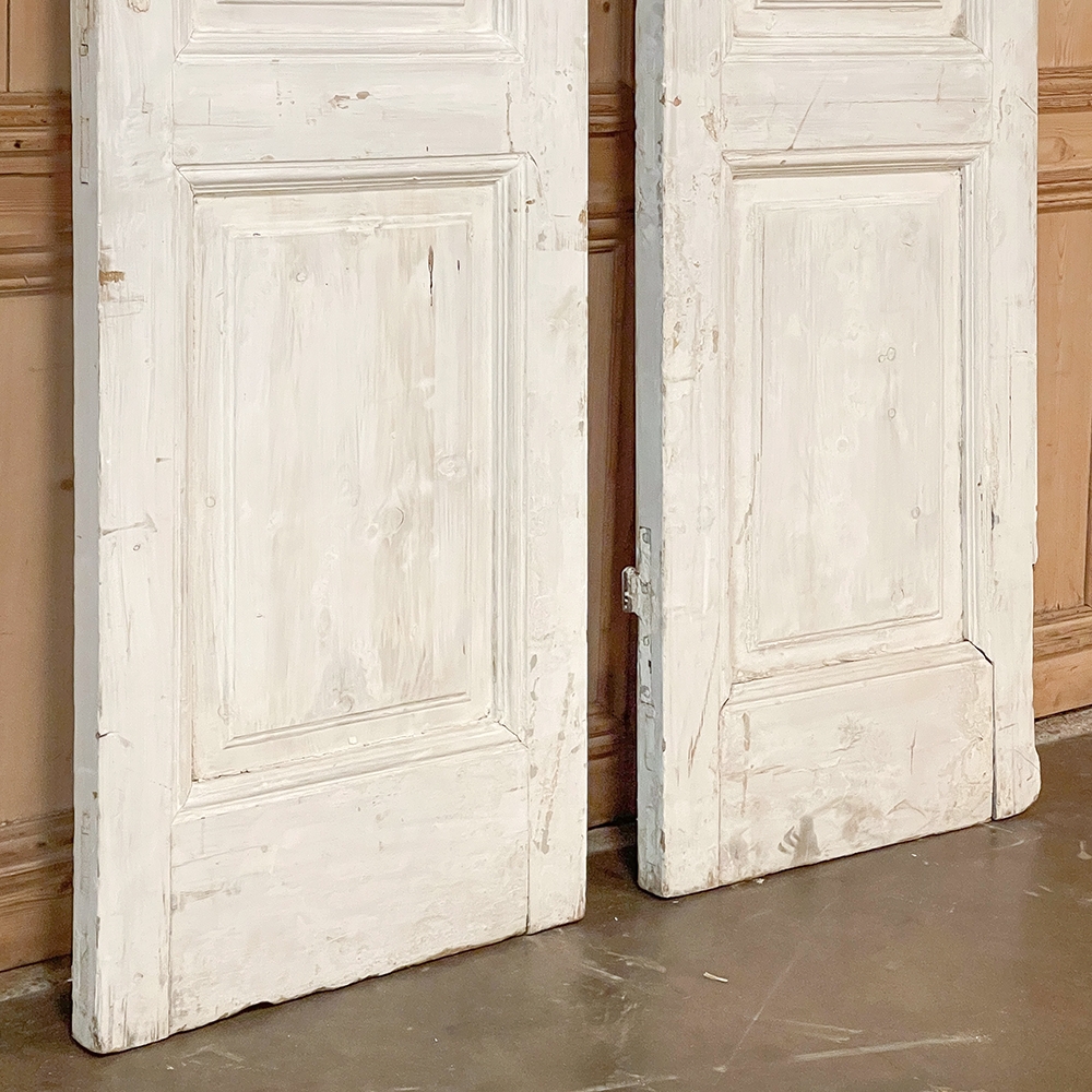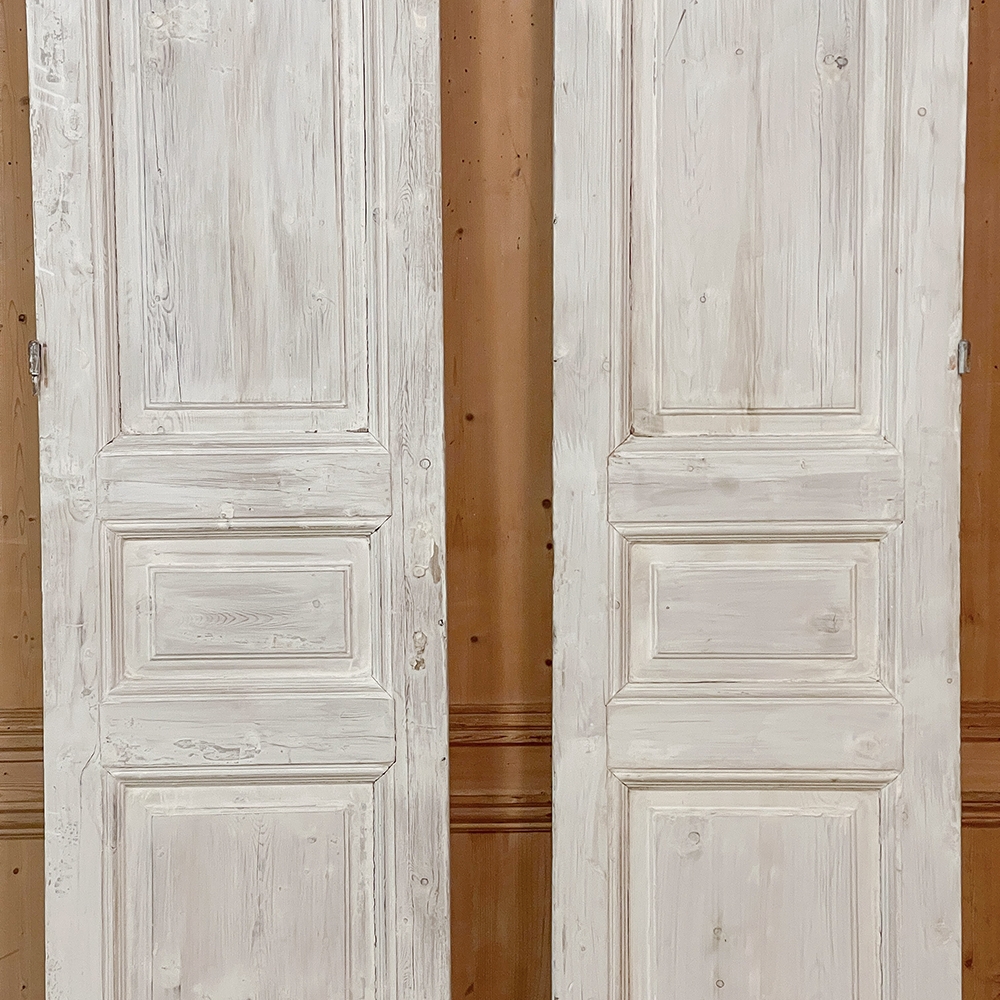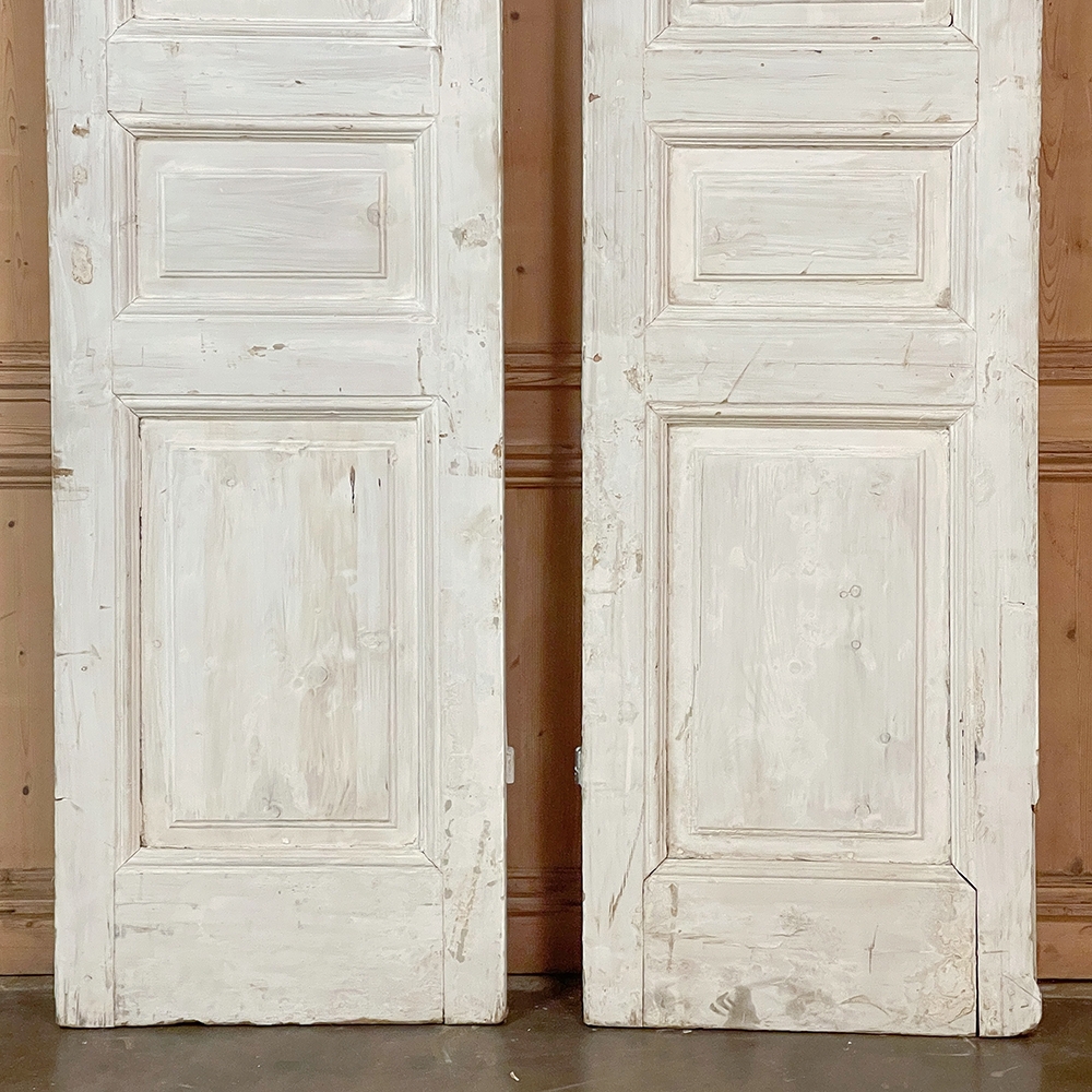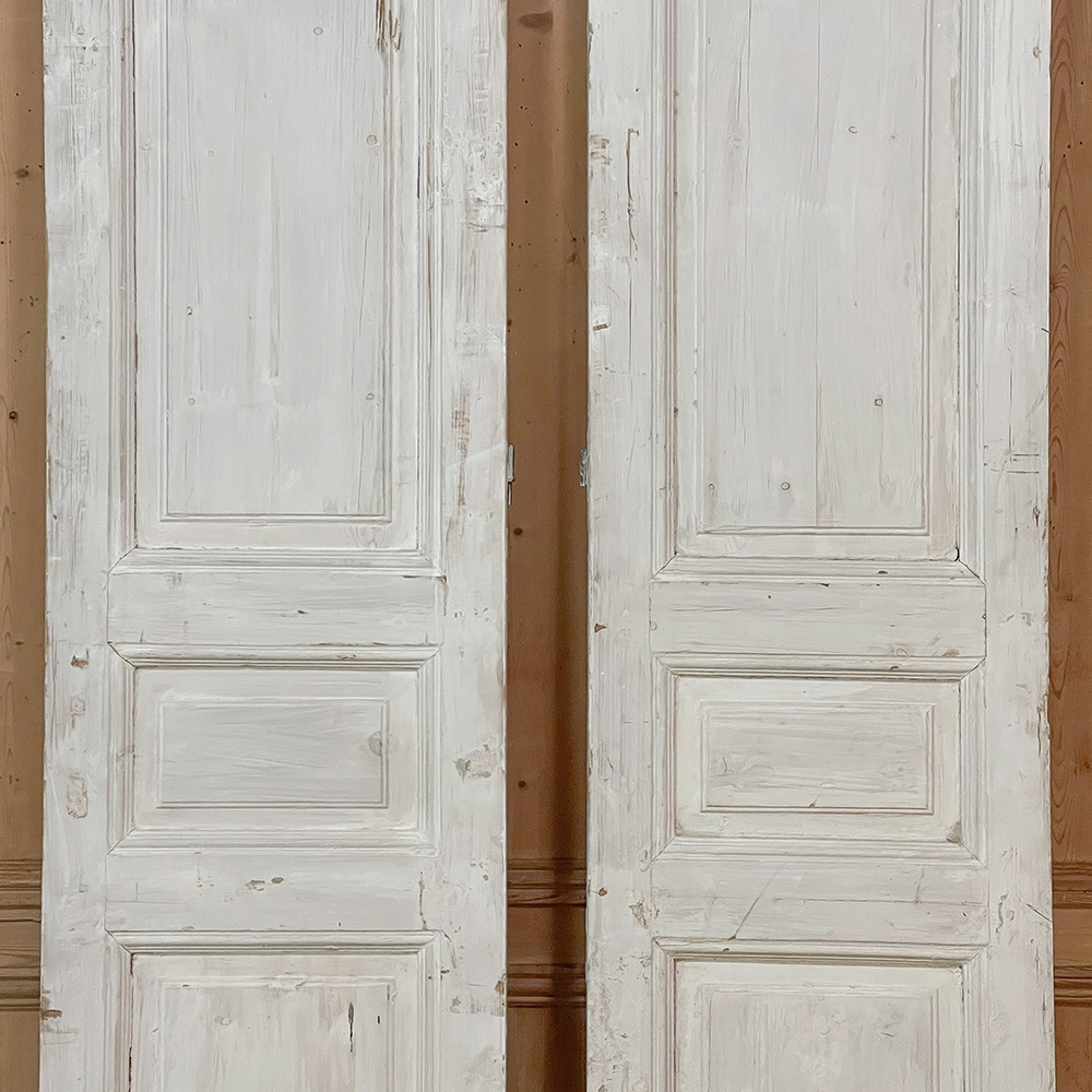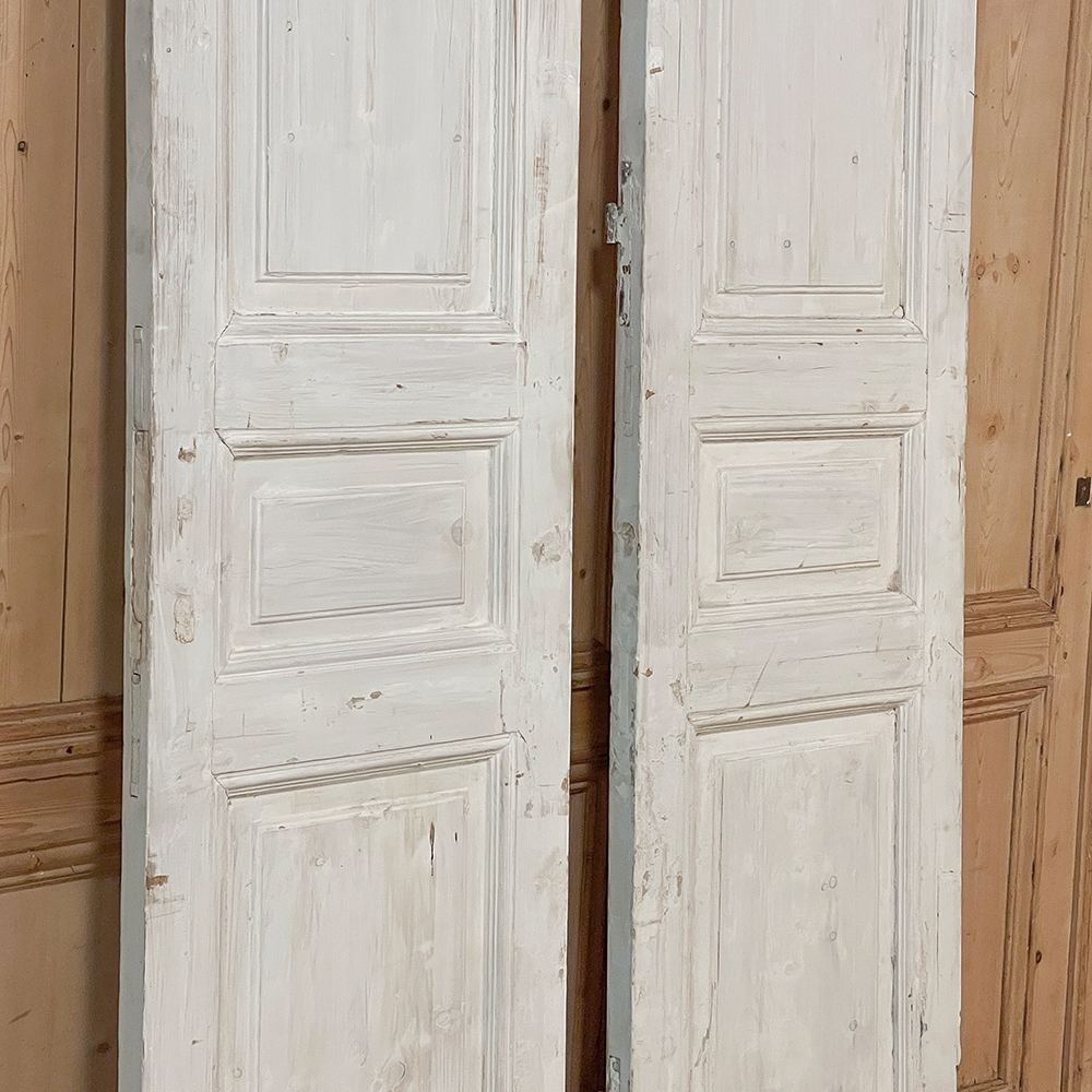 Pair 19th Century Interior French Doors will make a great addition to any room! Crafted by hand from solid pine, each features tailored raised & recessed panels for a tailored look, and sport a coat of paint perfect as a base for you to color coordinate with your room.