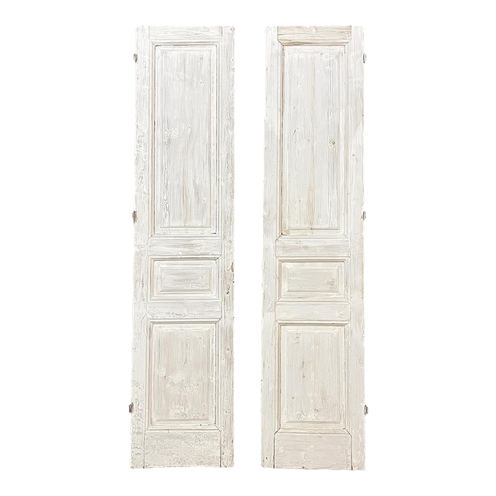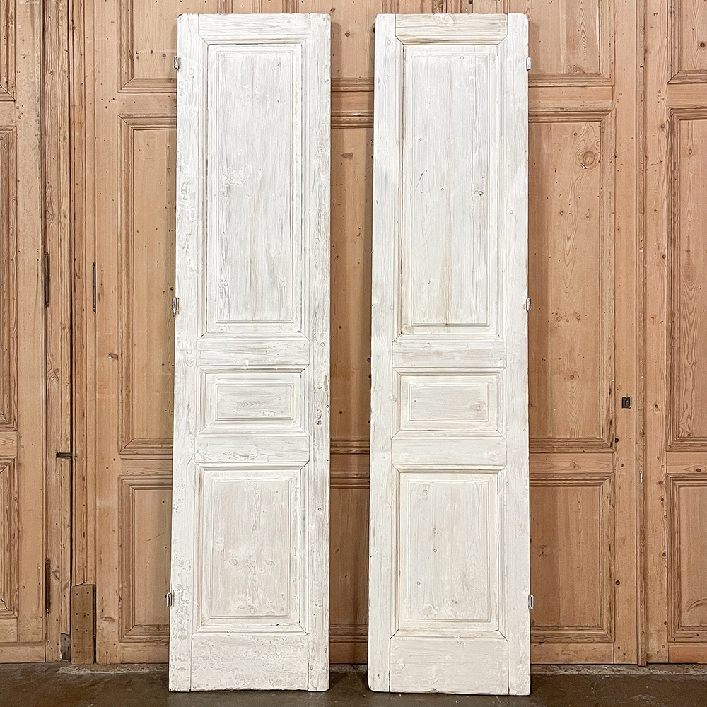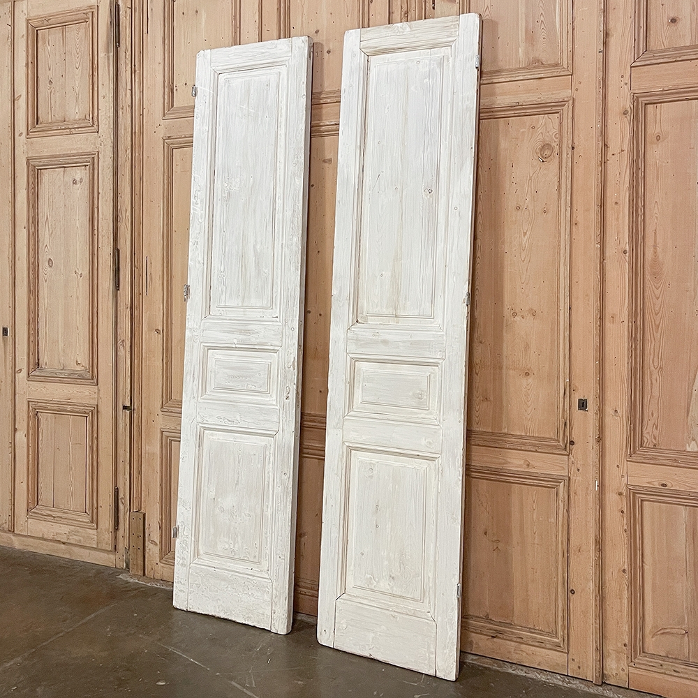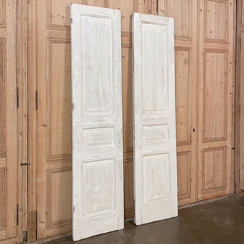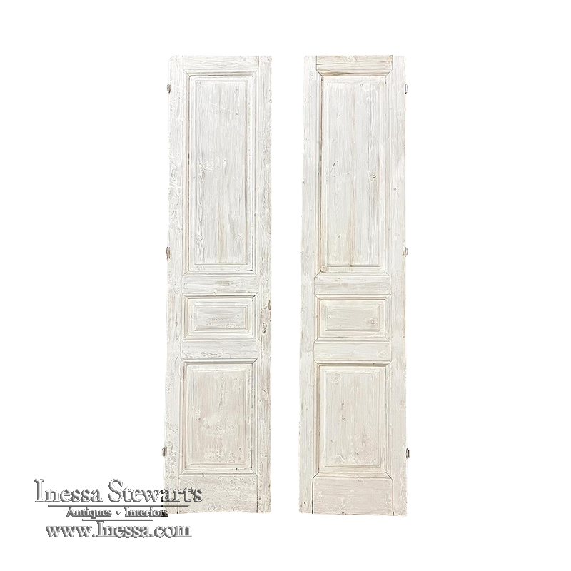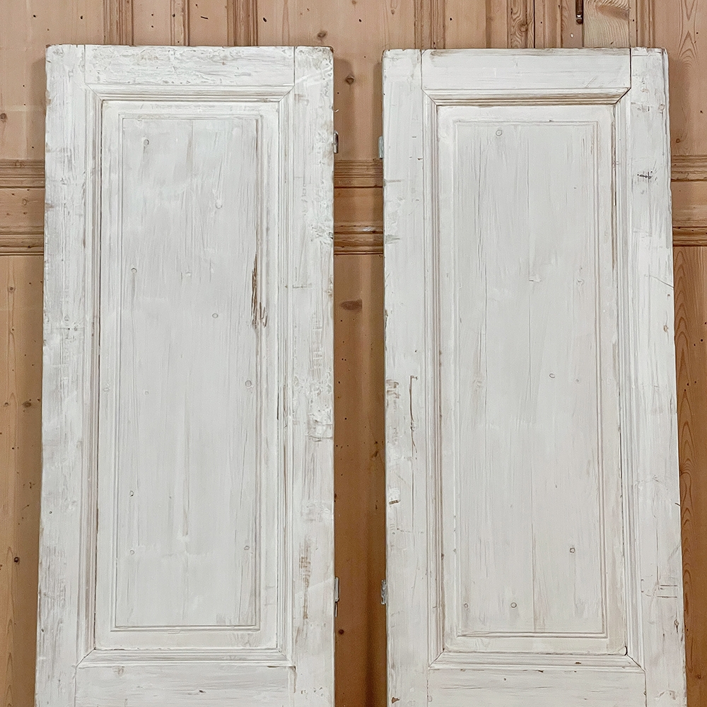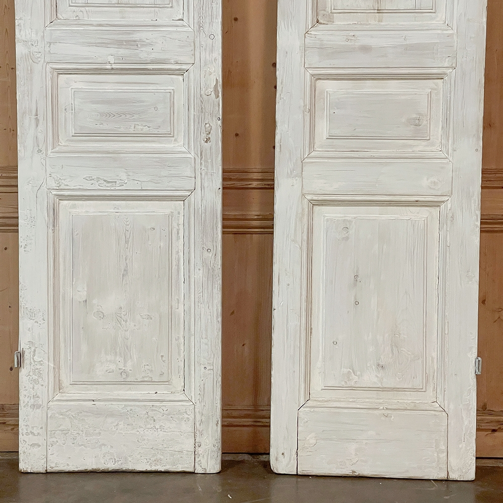 Pair 19th Century Interior French Doors will make a great addition to any room! Crafted by hand from solid pine, each features tailored raised & recessed panels for a tailored look, and sport a coat of paint perfect as a base for you to color coordinate with your room.