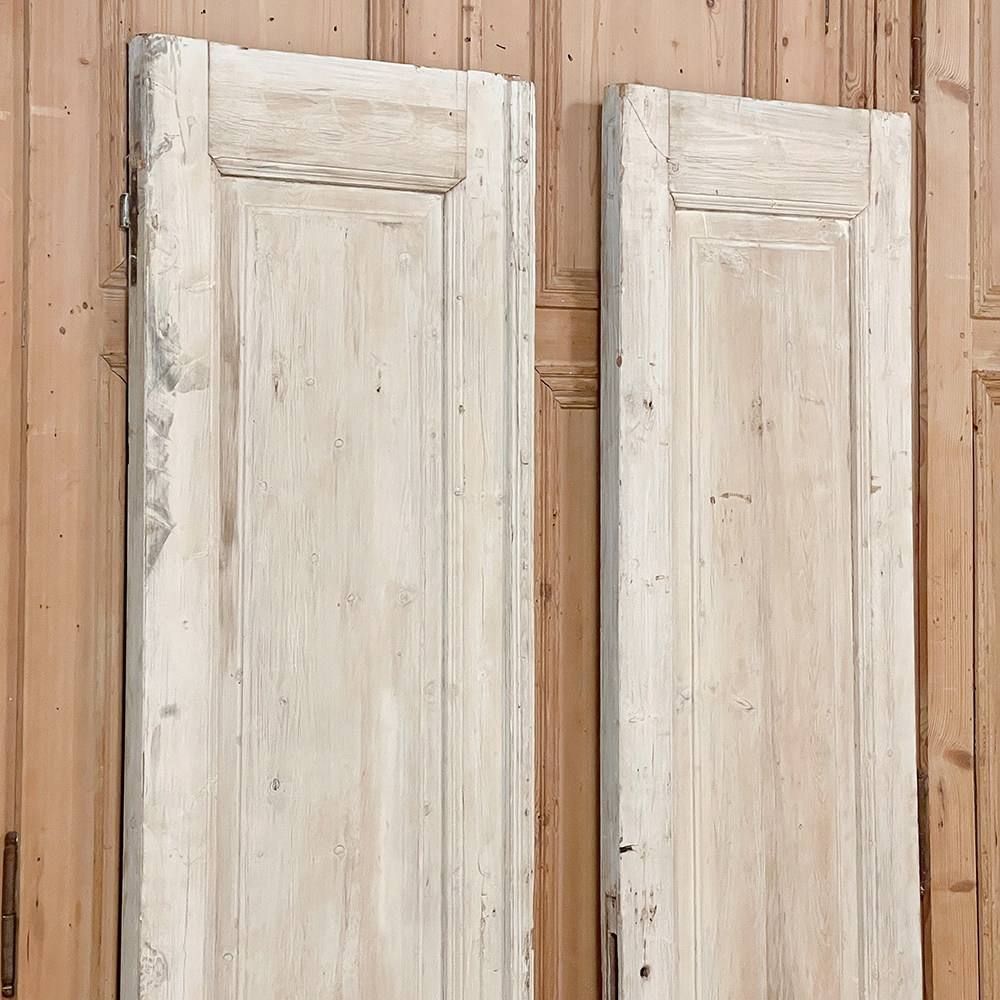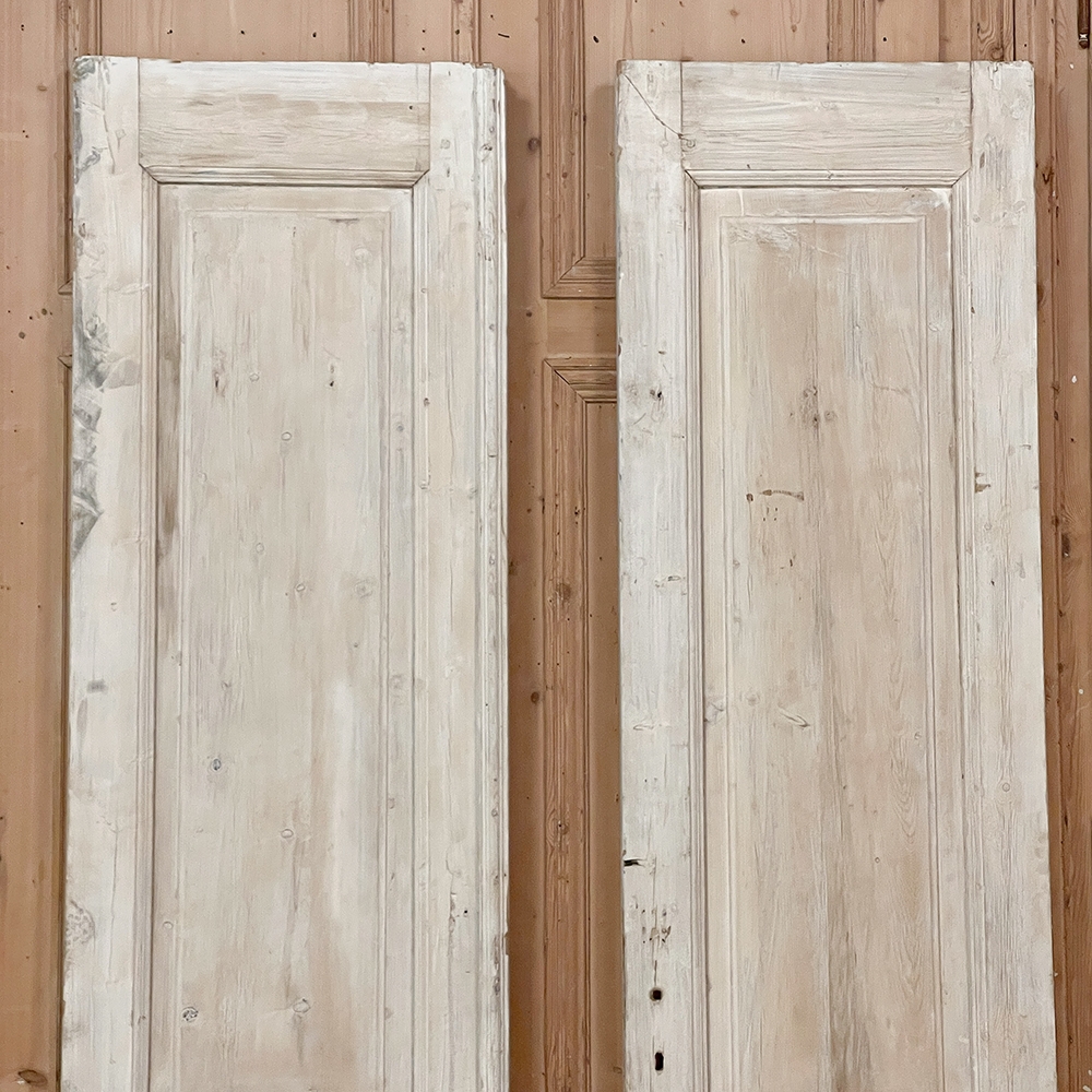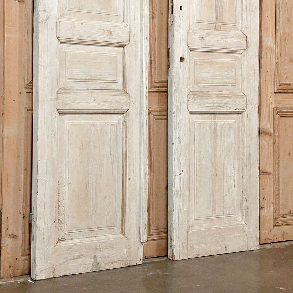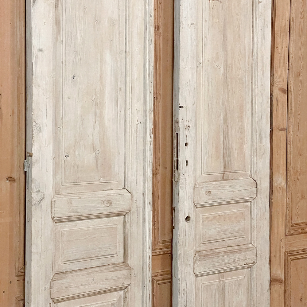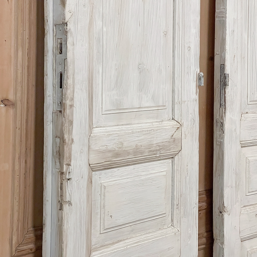 Pair 19th Century Interior French Doors will make a great addition to any room! Crafted by hand from solid pine, each features tailored raised & recessed panels for a tailored look, and sport a coat of paint perfect as a base for you to color coordinate with your room.