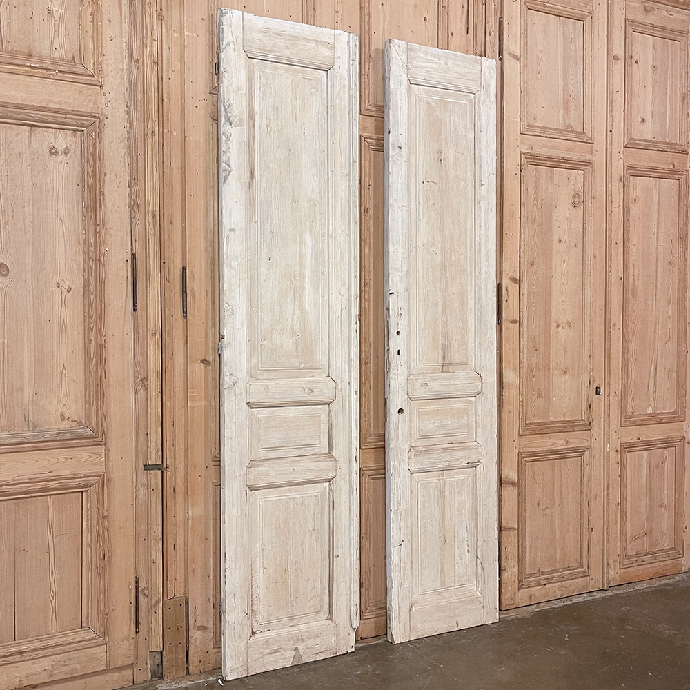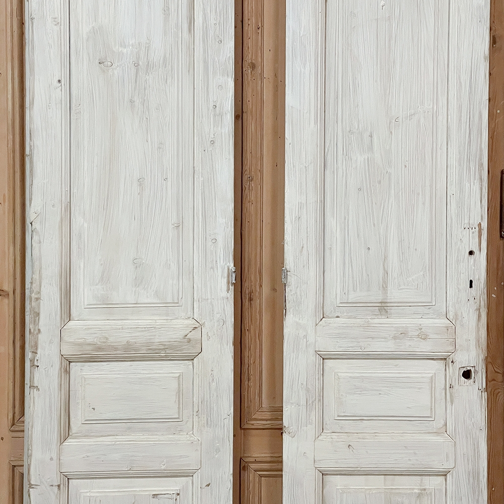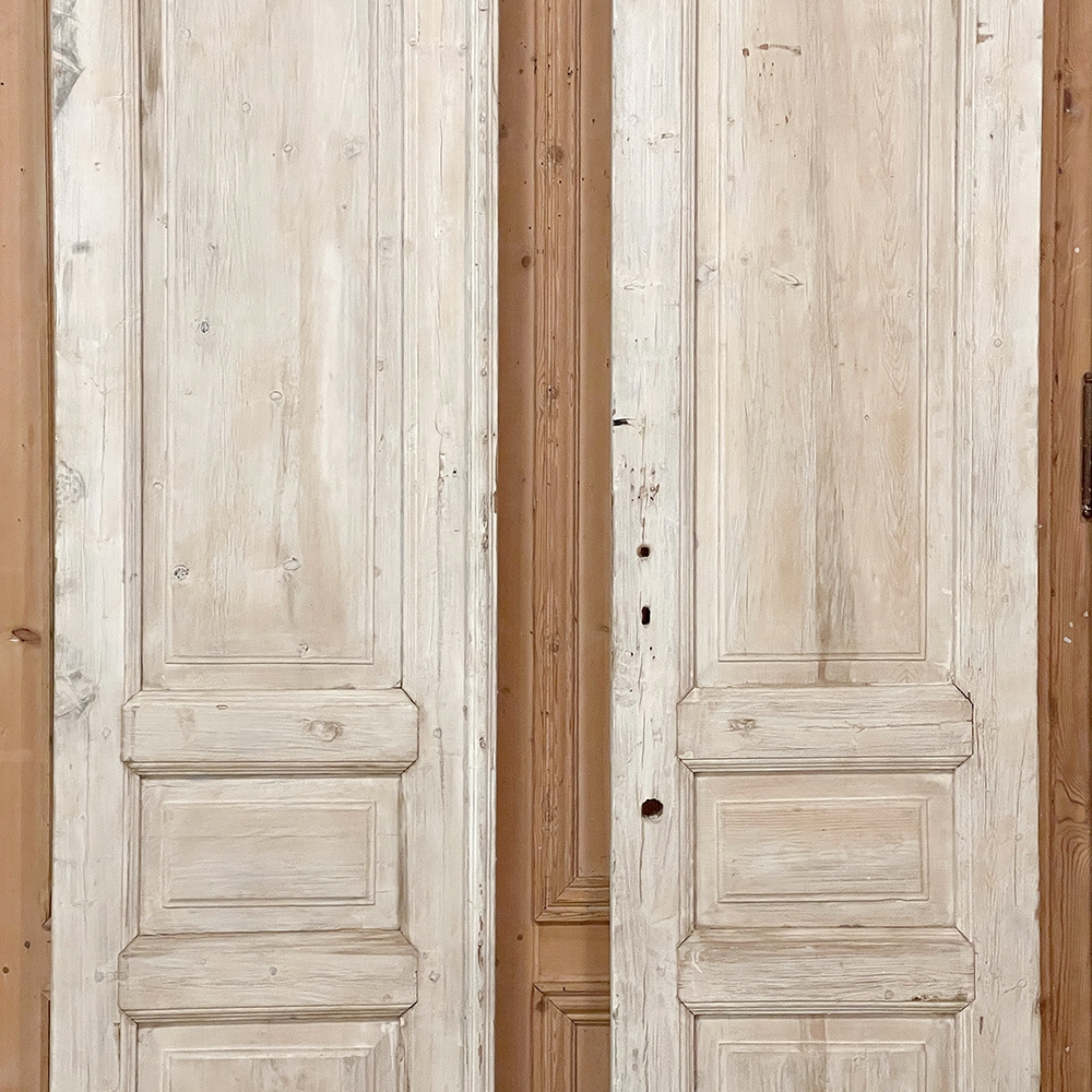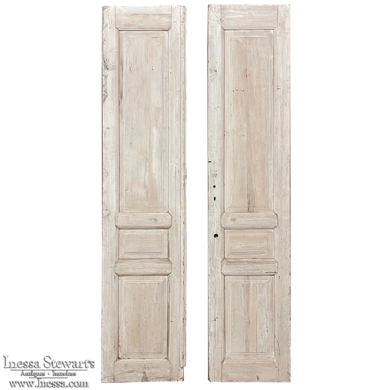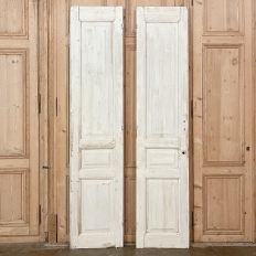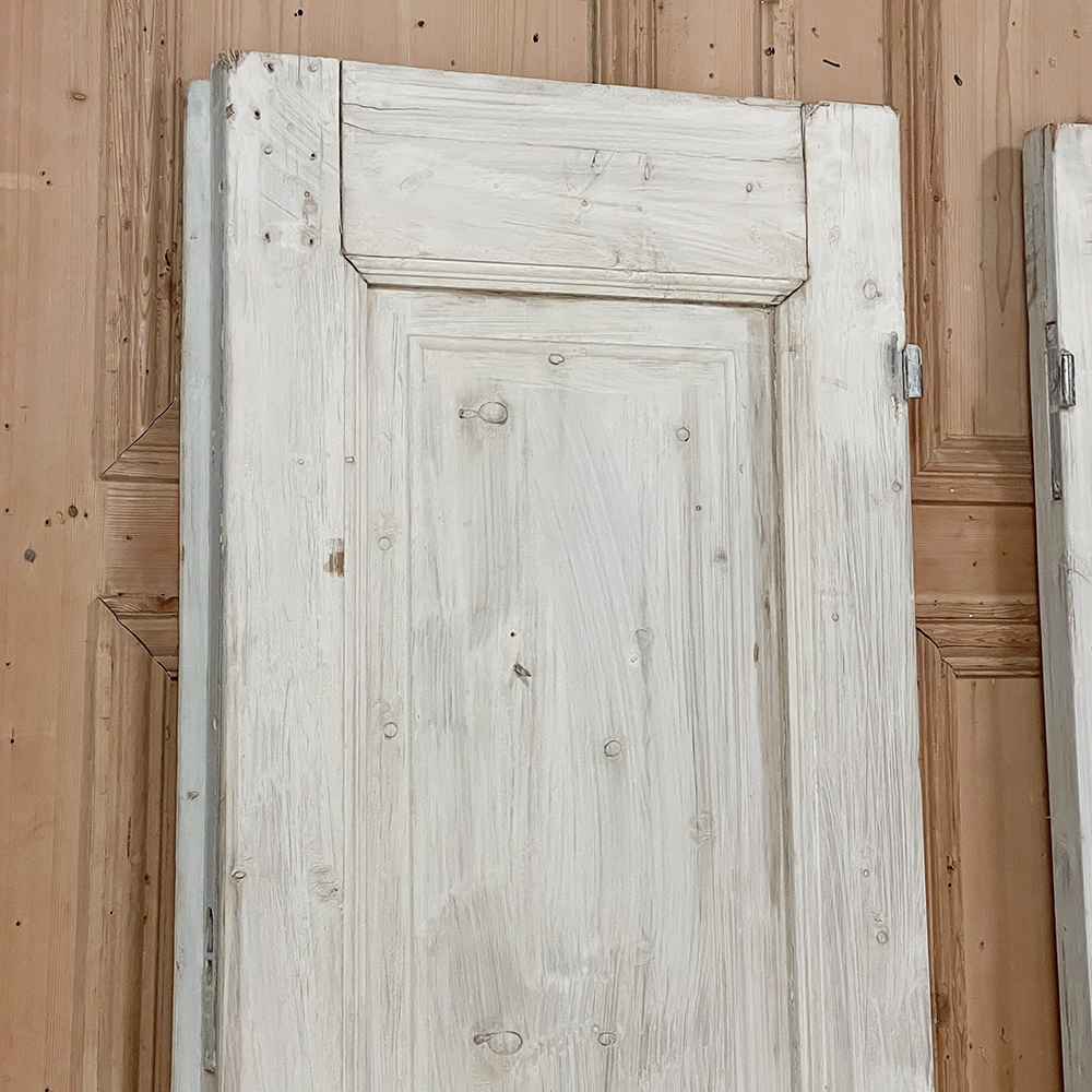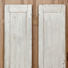 Pair 19th Century Interior French Doors will make a great addition to any room! Crafted by hand from solid pine, each features tailored raised & recessed panels for a tailored look, and sport a coat of paint perfect as a base for you to color coordinate with your room.