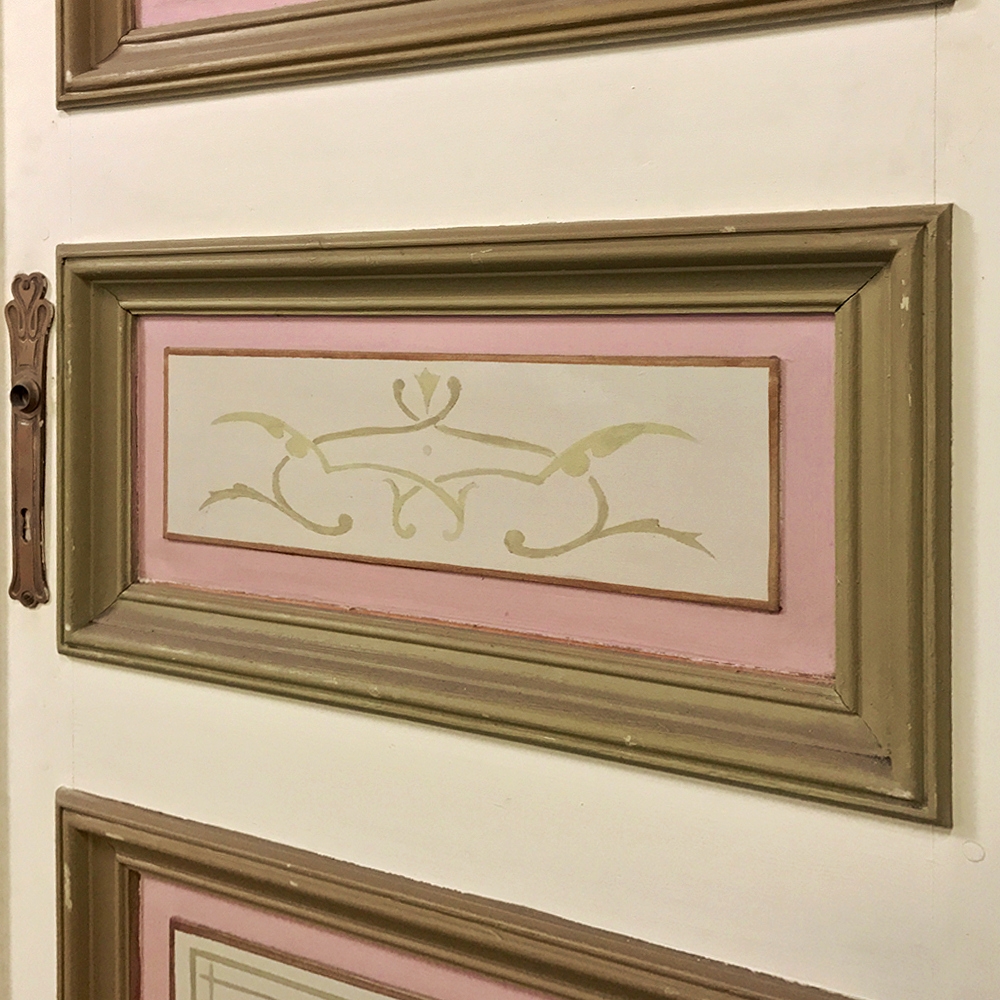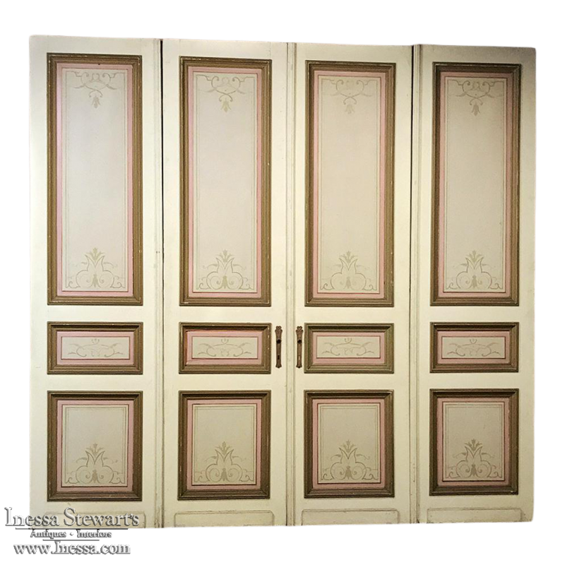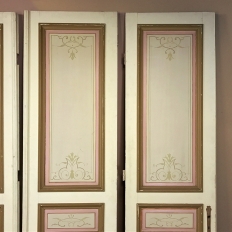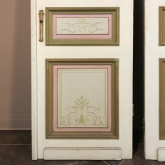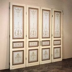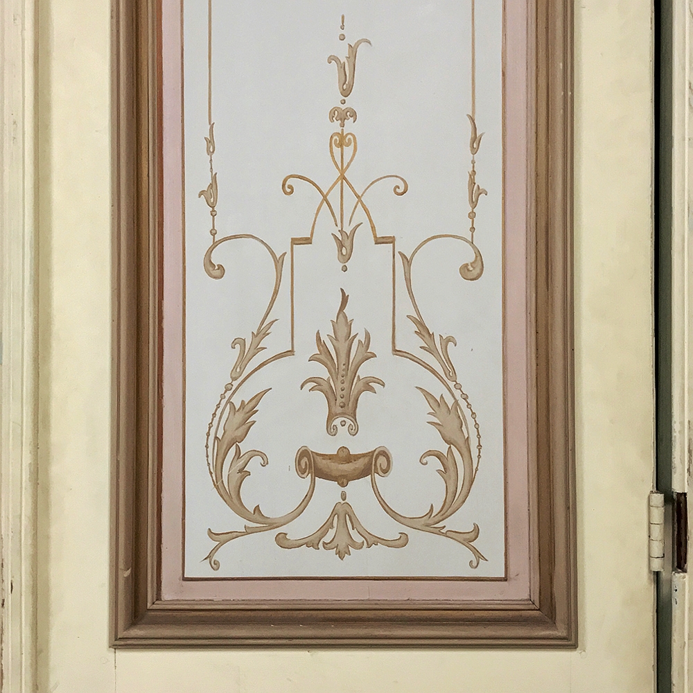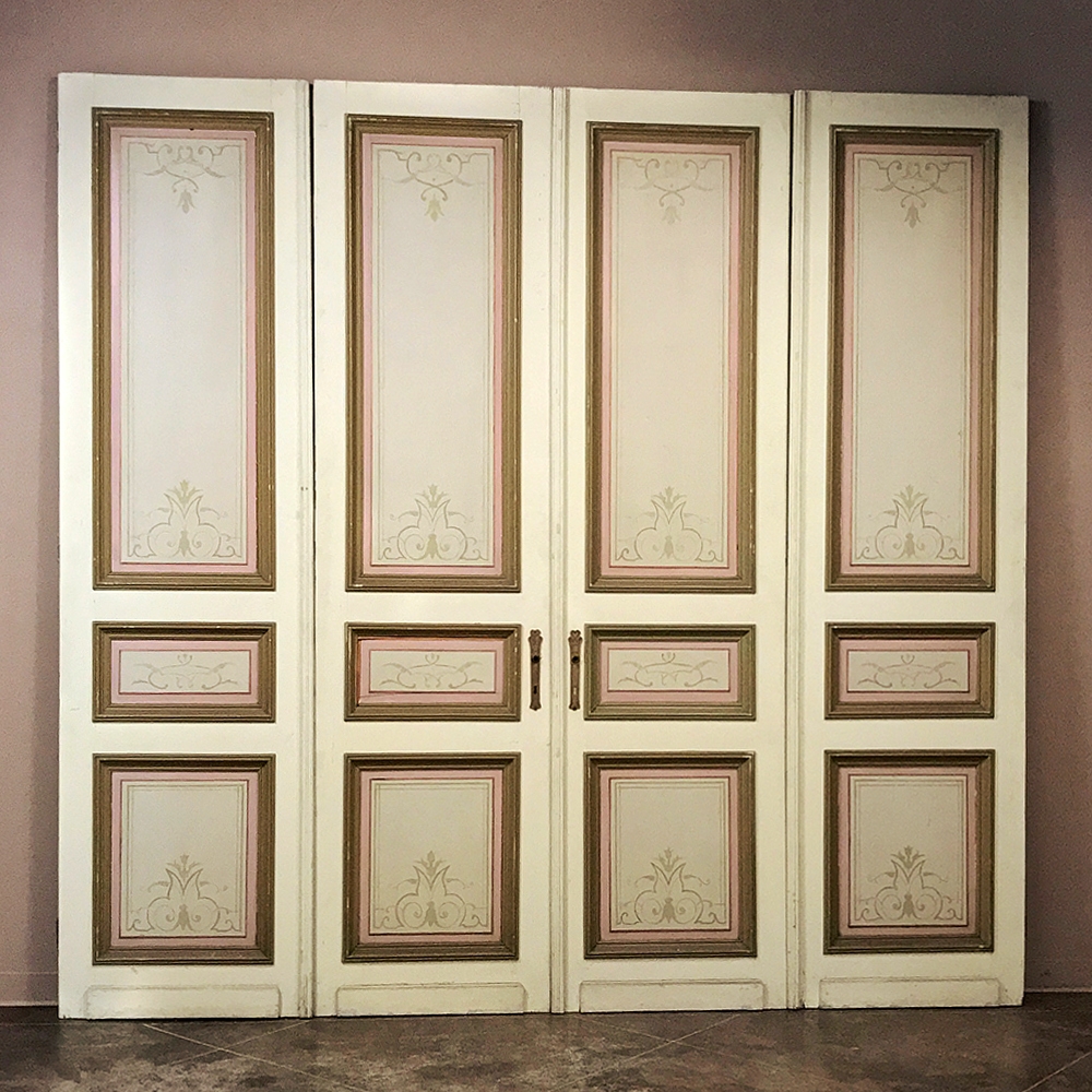 Set of Four 19th Century Art Nouveau Period Hand Painted French Doors are ideal for finishing out a room, whether one needs actual doors, or wishes to create an interesting visual effect as static panels, or perhaps using as room dividers. Even the back sides of the doors are hand painted with the classic style, providing visual appeal from any direction! Very rare to find as a set of four!