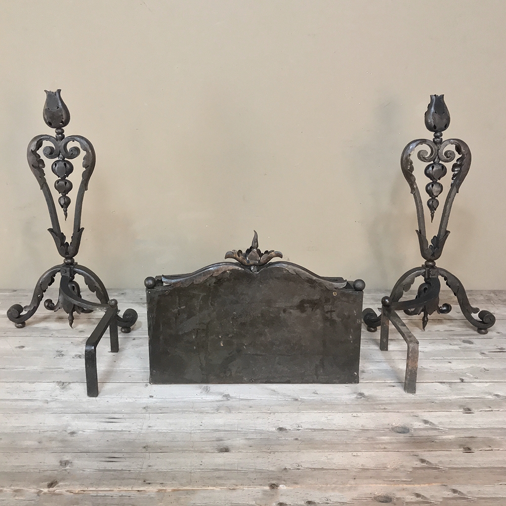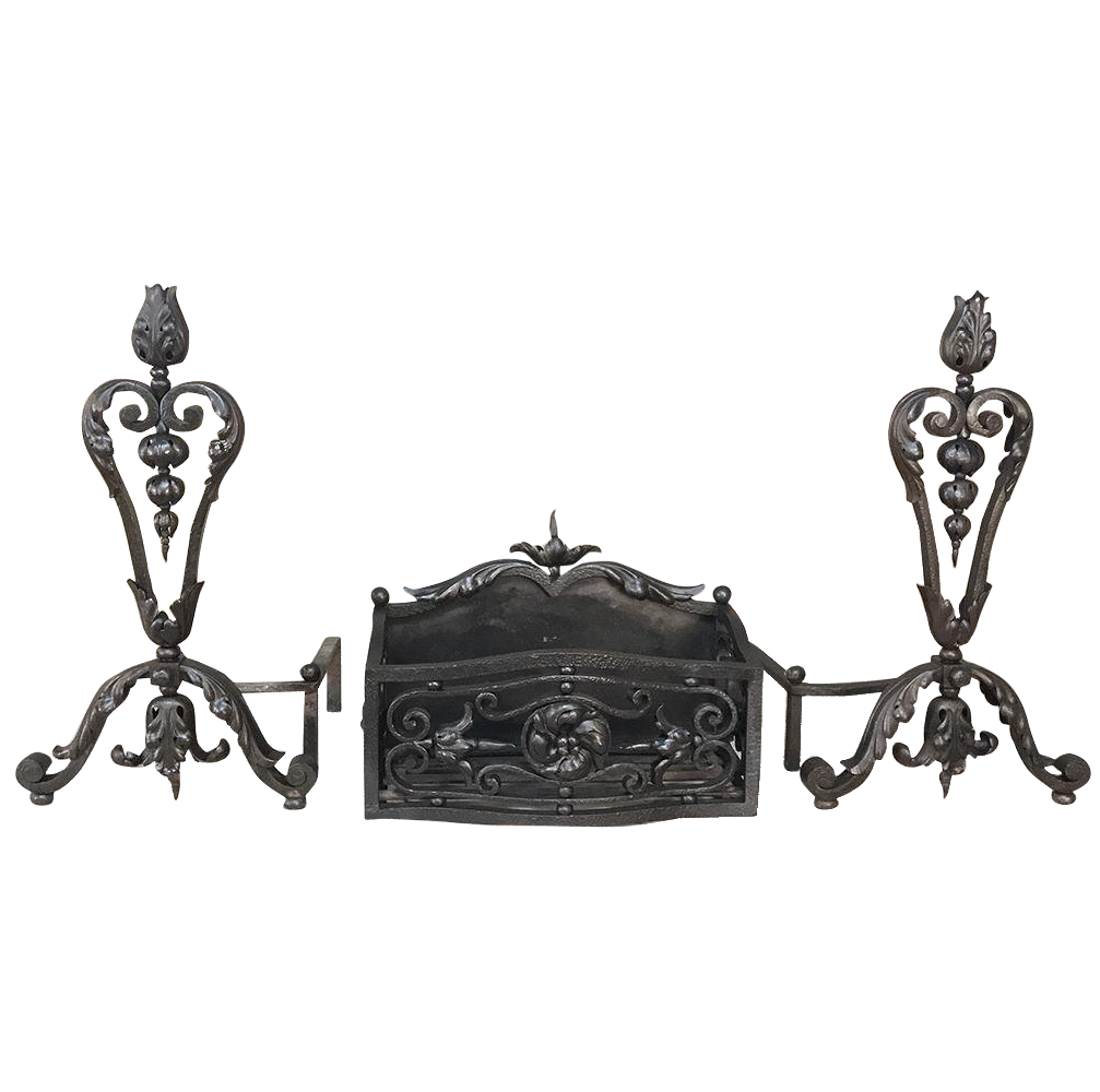 19th Century Wrought Iron Andiron & Firebox Set