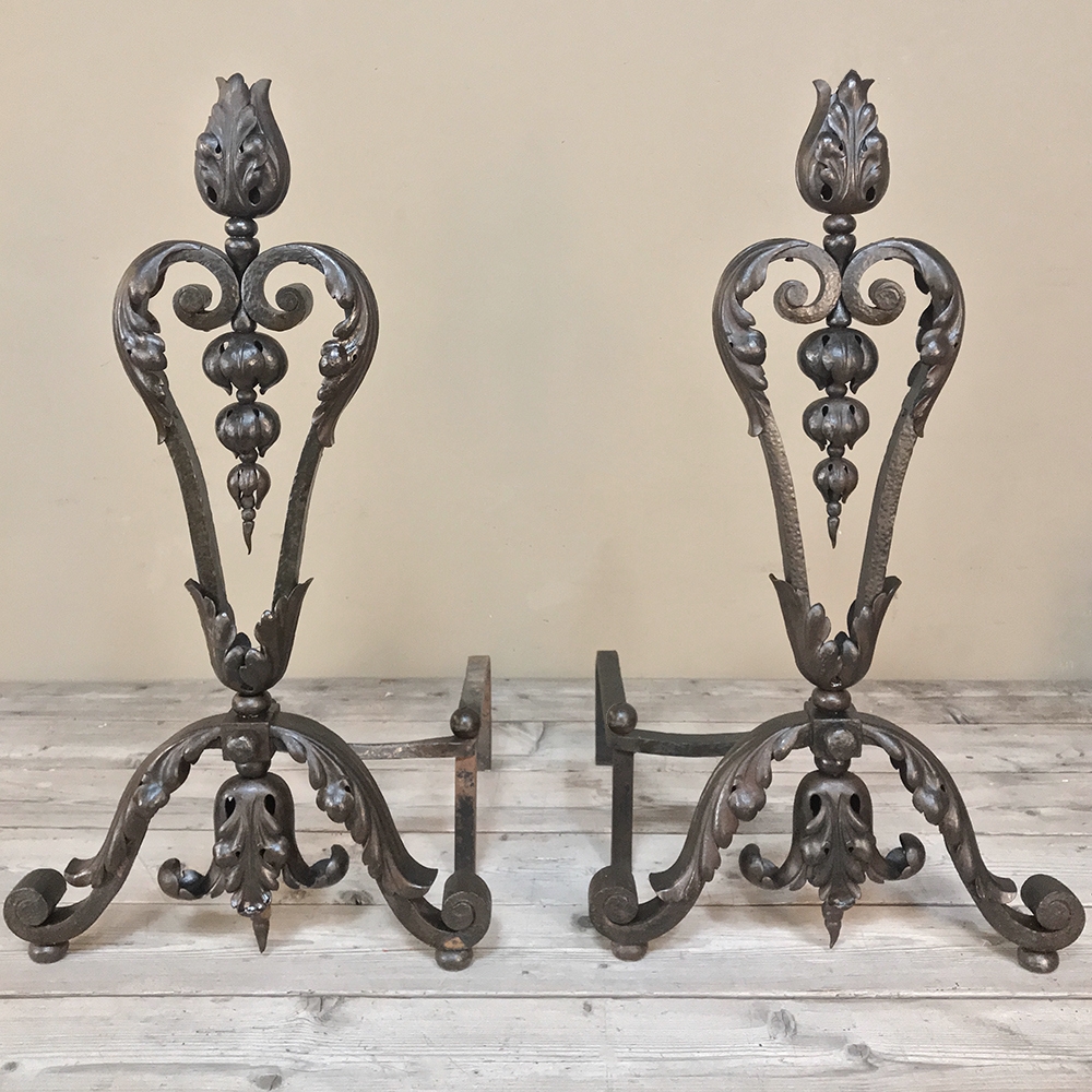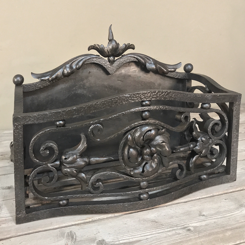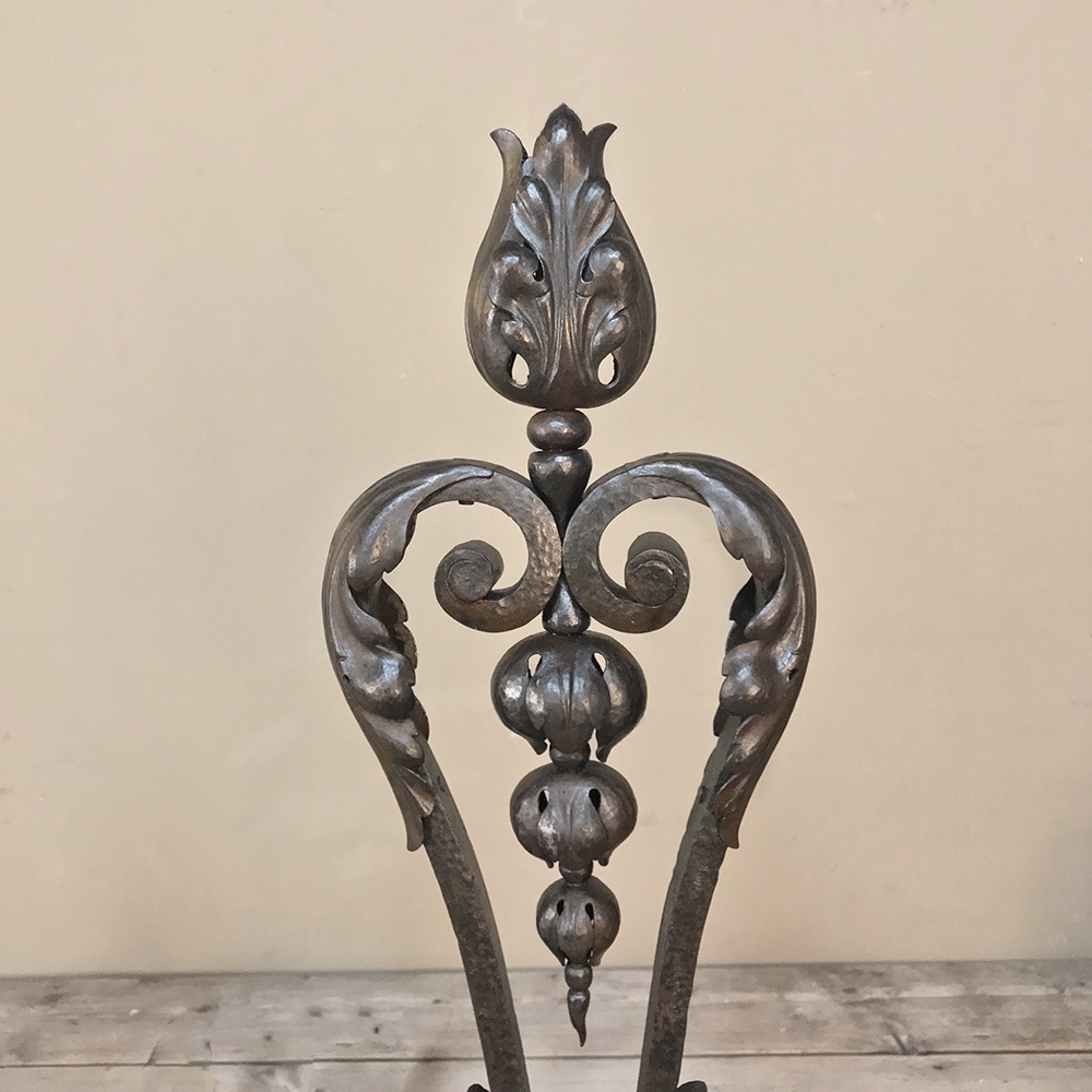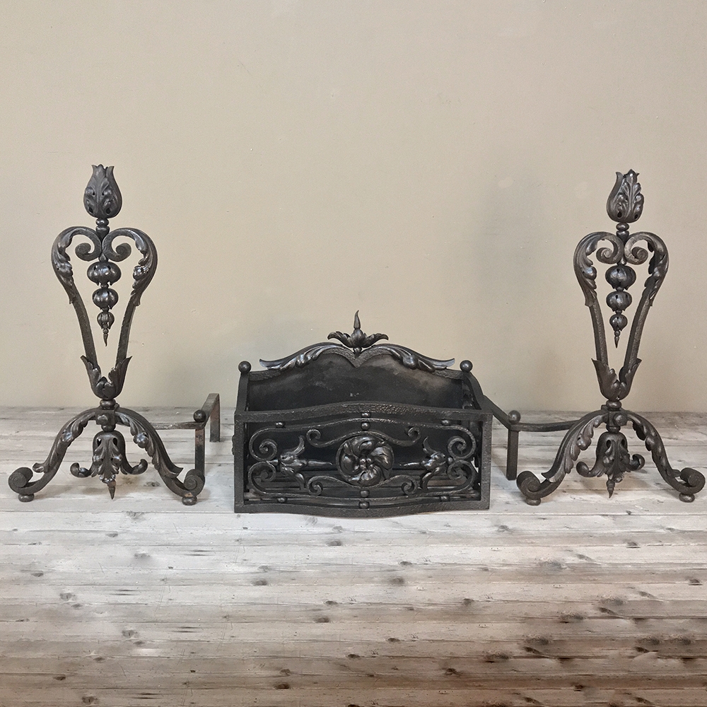 19th Century Wrought Iron Andiron & Firebox Set is a master work of the blacksmith's art, forged from red-hot iron to last several lifetimes! The intricate scrollwork and foliate motifs are the mark of a true master craftsman! The firebox is a completely separate unit so is optional to use. A rosette is centered on the firebox, which is enclosed on all sides and finished on the back panel with acanthus flourishes. Complementary flourishes comprise the andiron design for a beautiful effect.