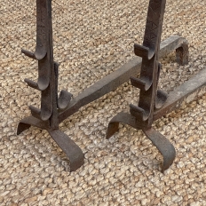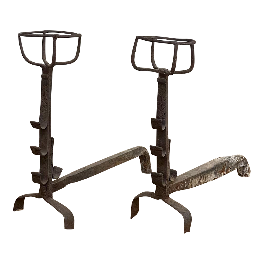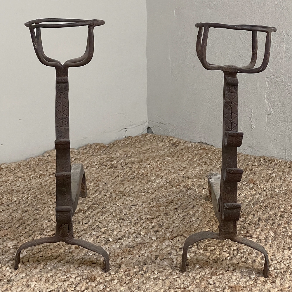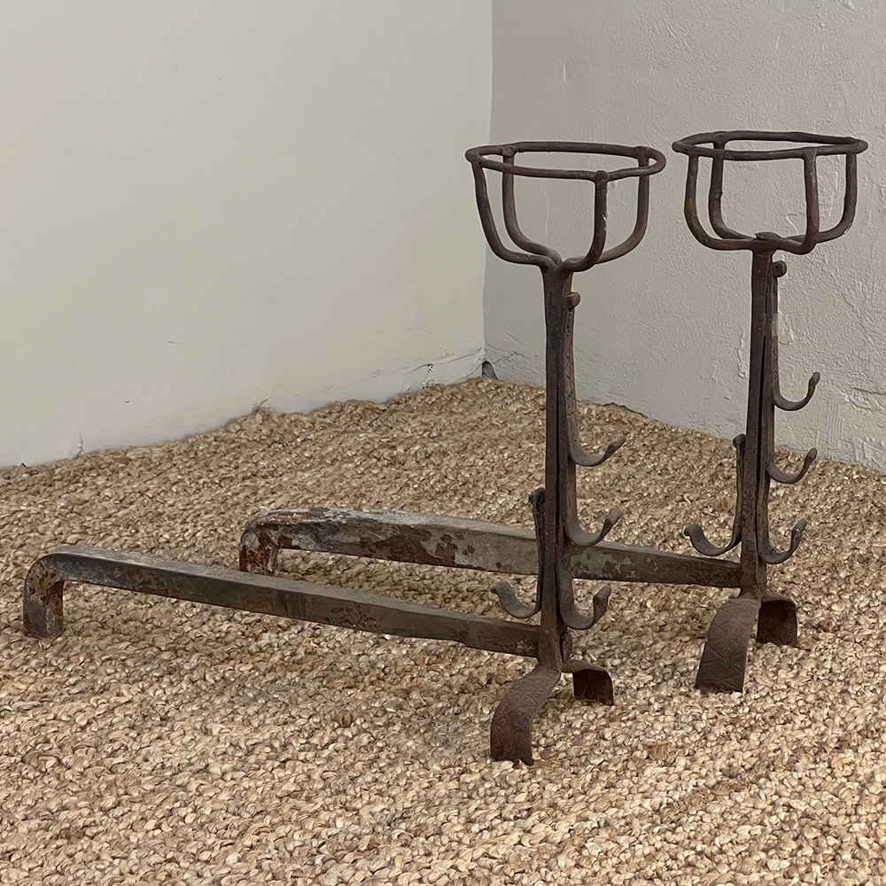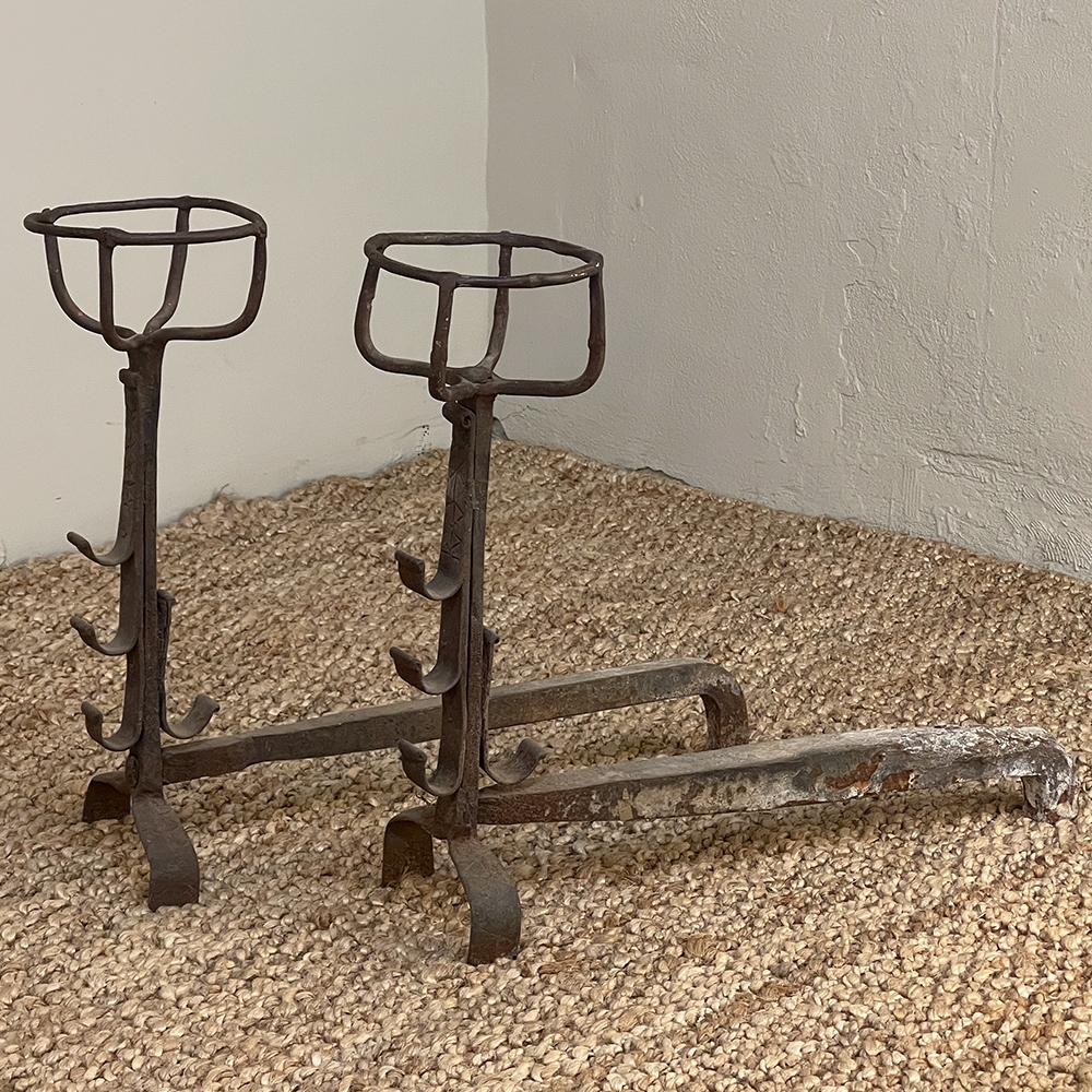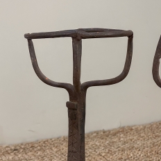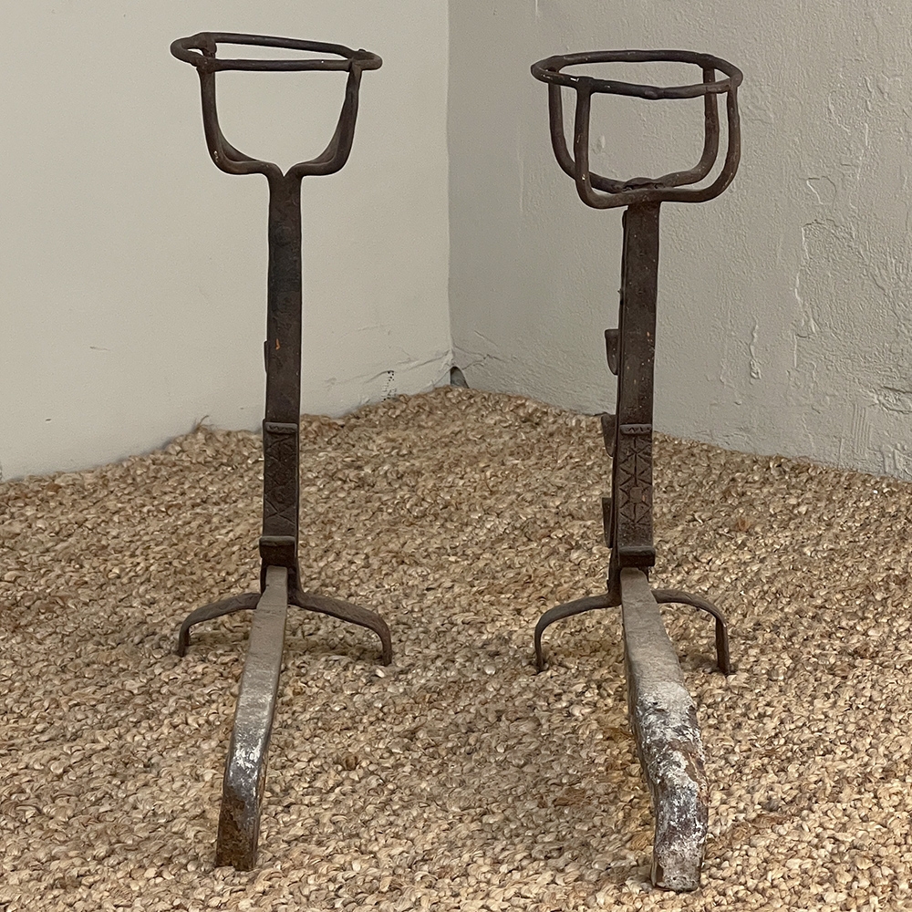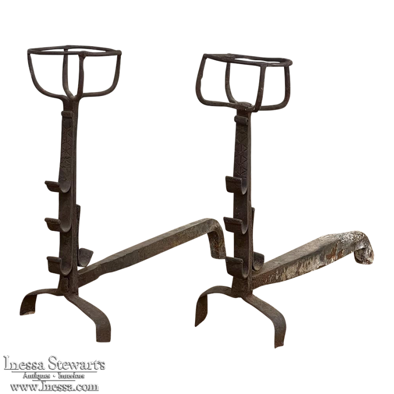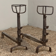 SalePair 18th Century Wrought Iron Andirons were just as functional as they were decorative back in the days before central heating and electric lighting! Forged and hammered by the local blacksmith, they had little cages on top to set vessels of water or soups to keep them warm, with U-shaped hangers on the front side across which an iron rod would be placed to hang other pots and vessels to either cook or warm up by the blazing fire. Heat could be adjusted based on the position the vessel or pot was placed on the improvised rack. In the summertime, the cages on top could hold big pillar candles so that some light could emanate from the fireplace no matter the season!