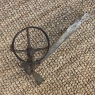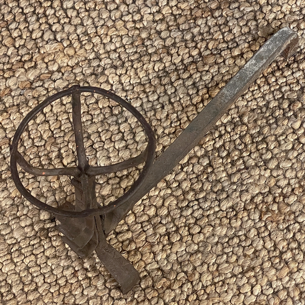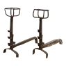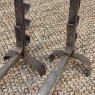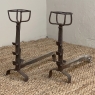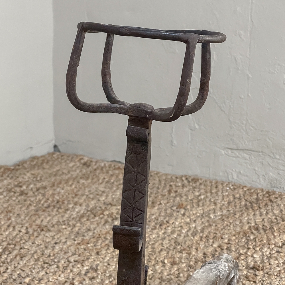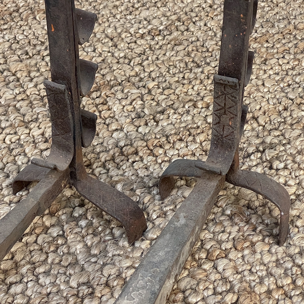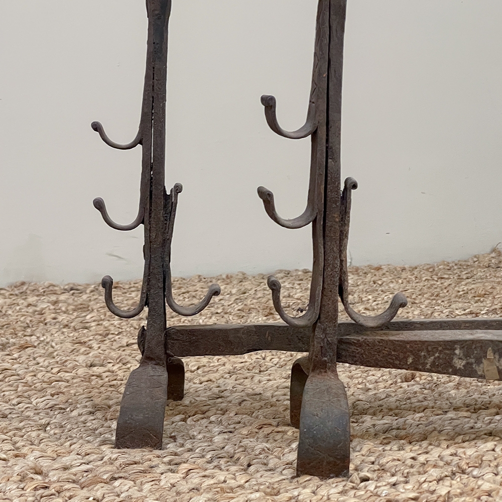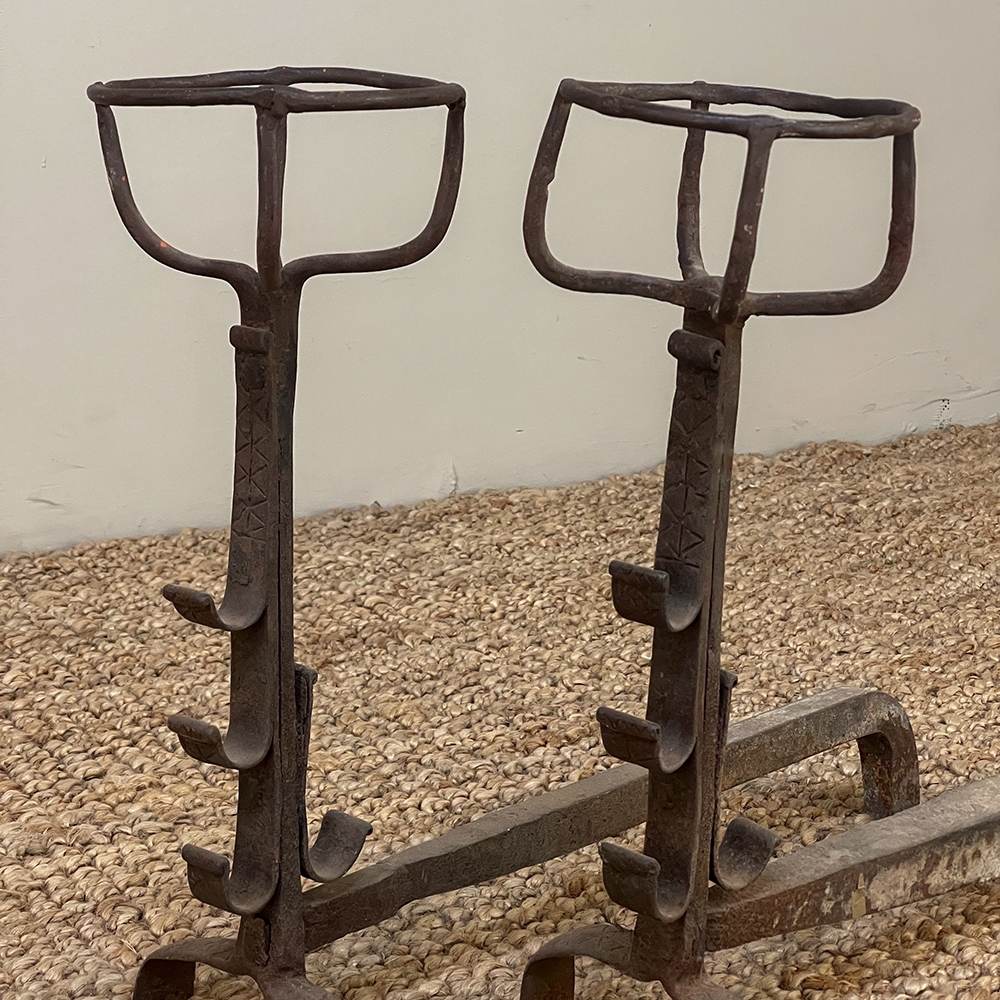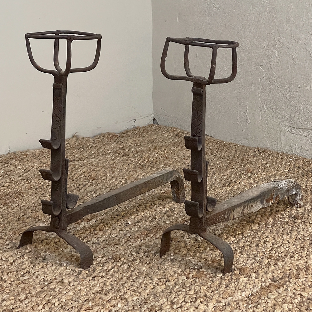 SalePair 18th Century Wrought Iron Andirons were just as functional as they were decorative back in the days before central heating and electric lighting! Forged and hammered by the local blacksmith, they had little cages on top to set vessels of water or soups to keep them warm, with U-shaped hangers on the front side across which an iron rod would be placed to hang other pots and vessels to either cook or warm up by the blazing fire. Heat could be adjusted based on the position the vessel or pot was placed on the improvised rack. In the summertime, the cages on top could hold big pillar candles so that some light could emanate from the fireplace no matter the season!