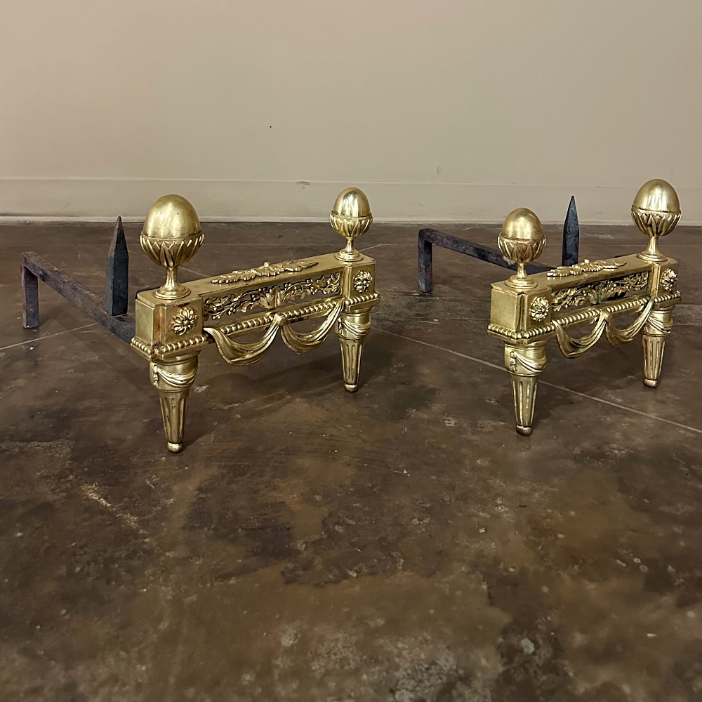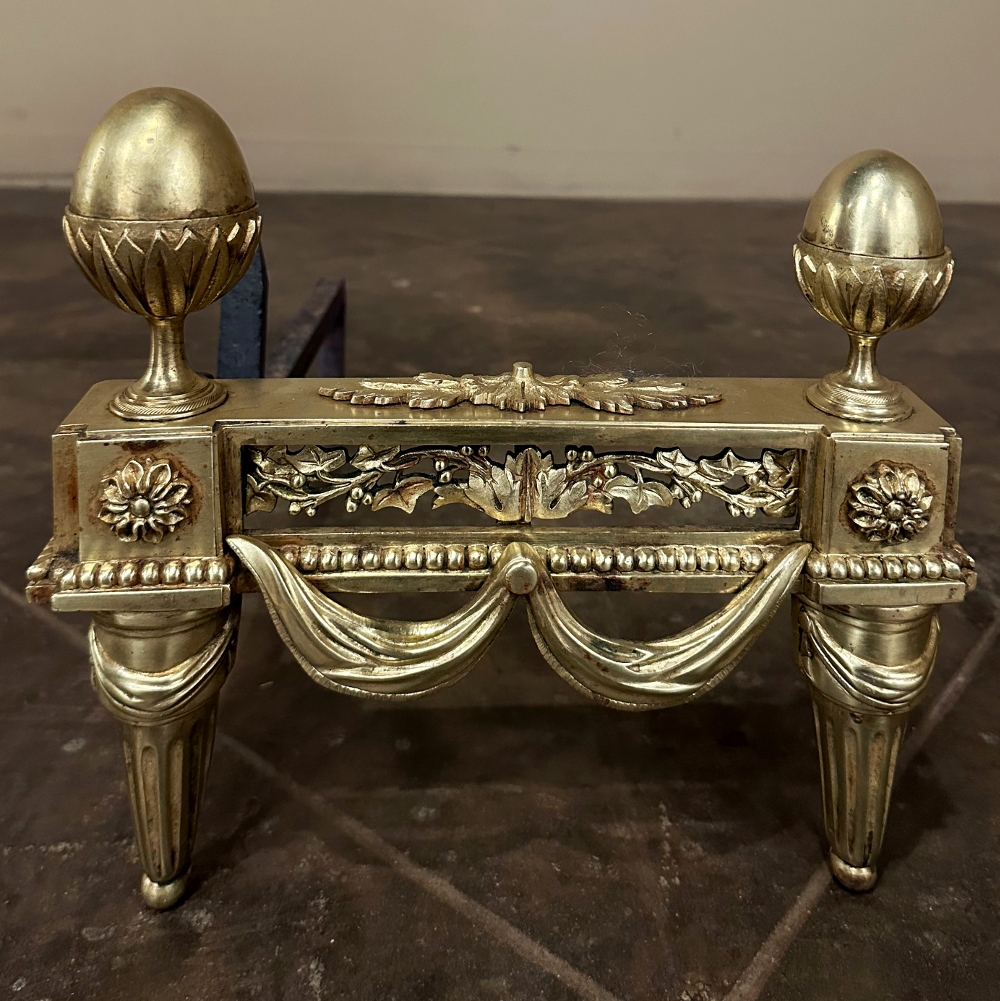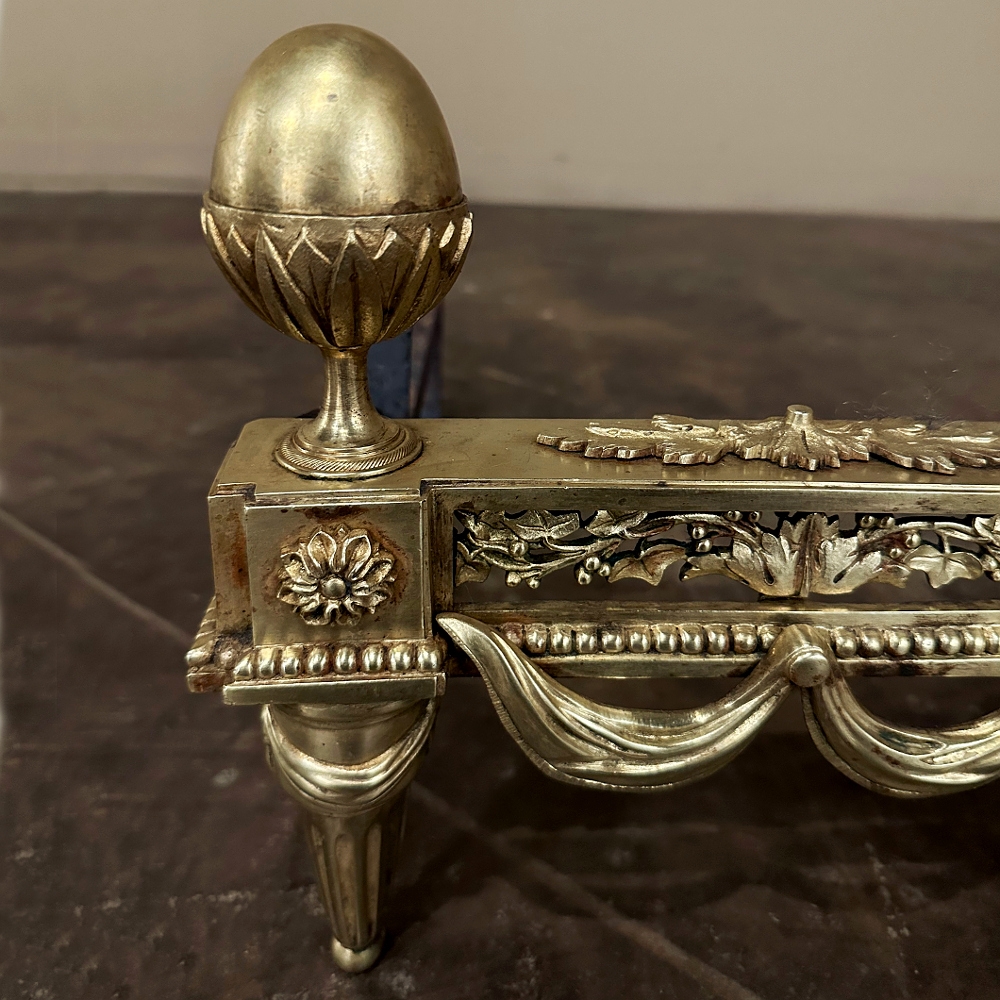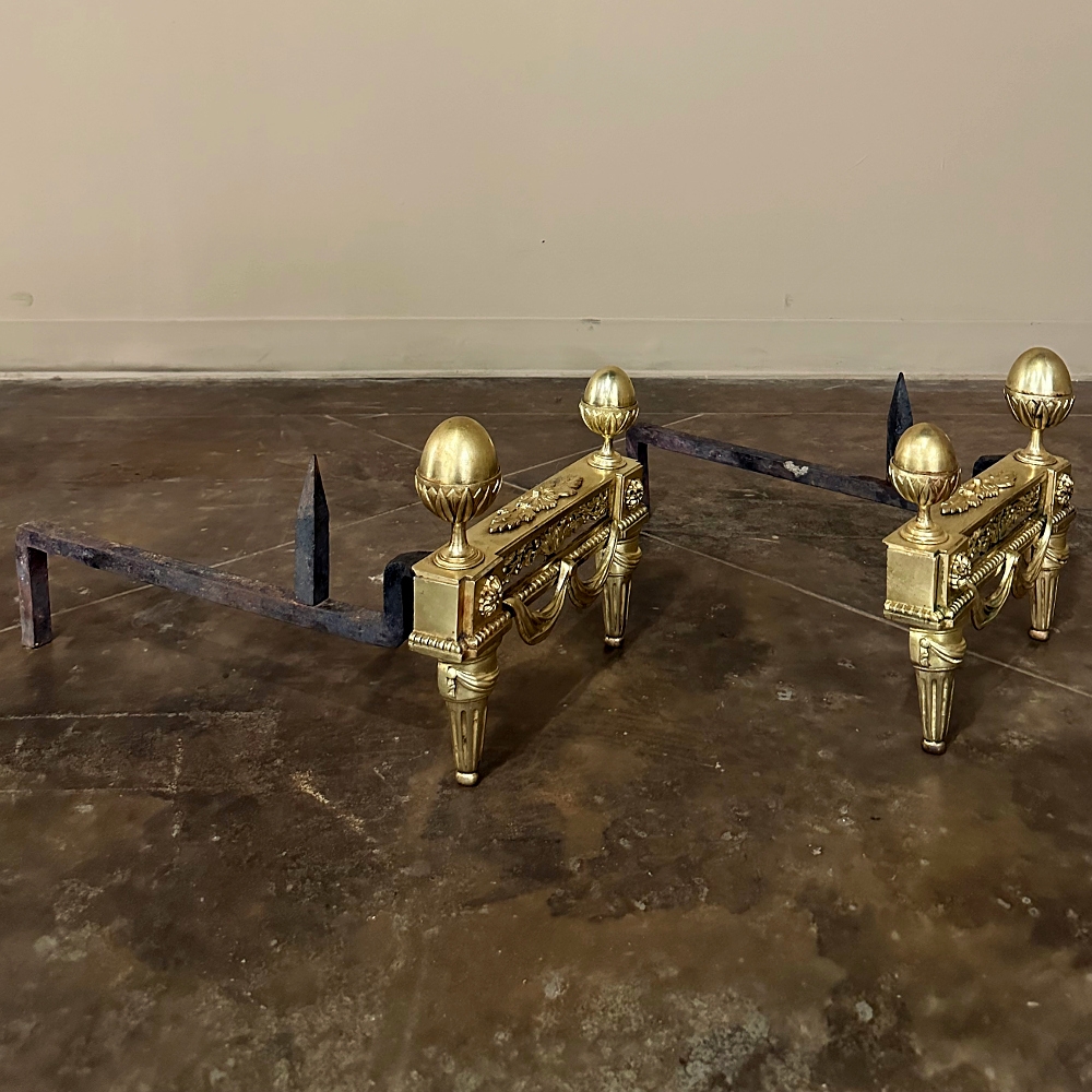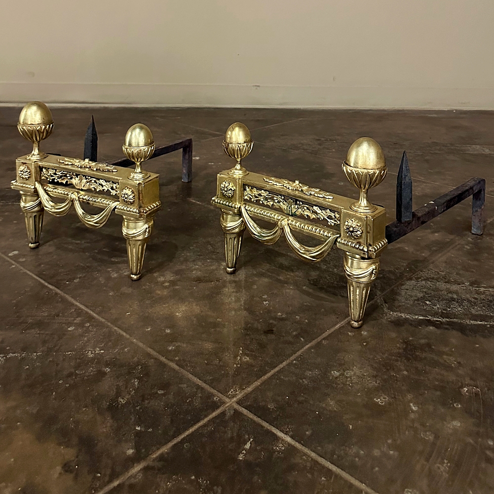 Pair 19th Century French Louis XVI Neoclassical Bronze Andirons will make an exceptional finishing touch to your hearth! Cast in solid bronze, each features a variety of classical motifs that remain truly timeless after three millennia. Most prominent is the egg finials set upon a lotus blossom atop each corner. The body of the andirons in between each finial is an architectural study with projecting corner pediments adorned with rosettes, acanthus leaves and vines with berries, finished off with beaded trim and fabric swags. Each is mounted to a solid wrought iron log support. Many of our customers over the years have had the iron shortened so the andirons could serve as handsome bookends elsewhere in the home.