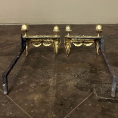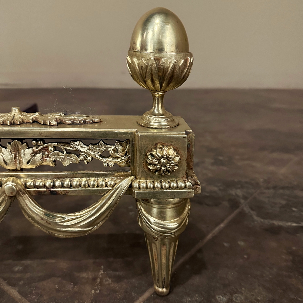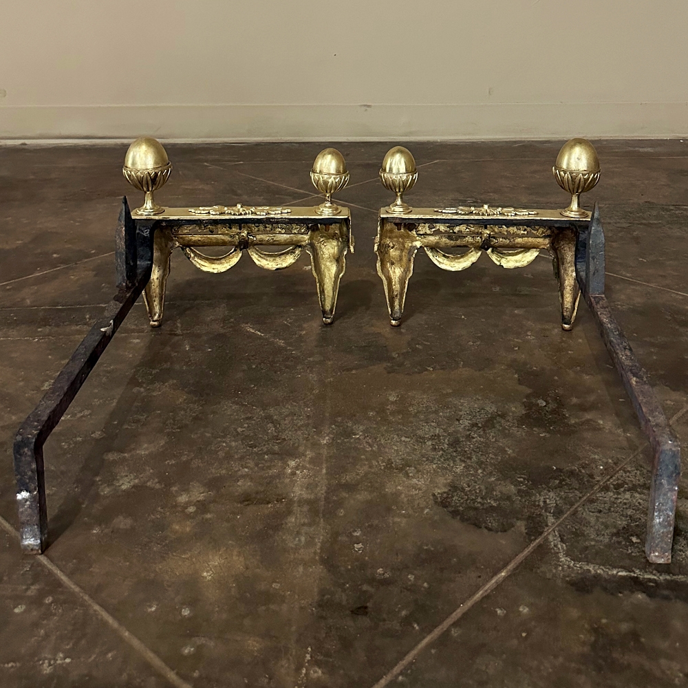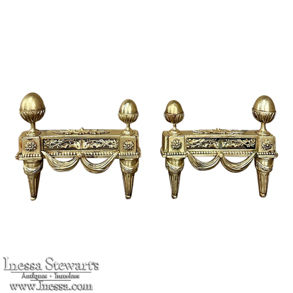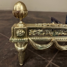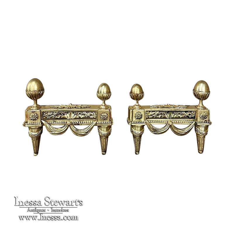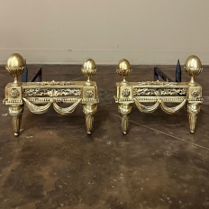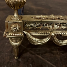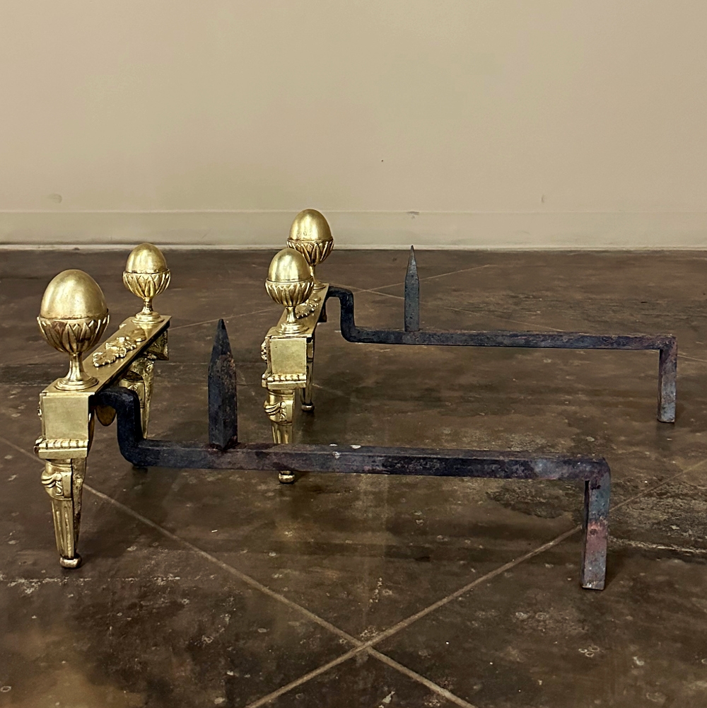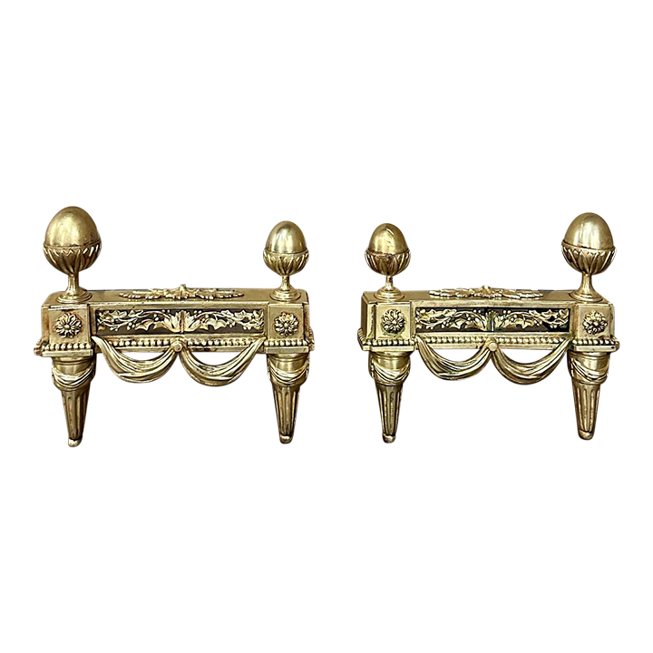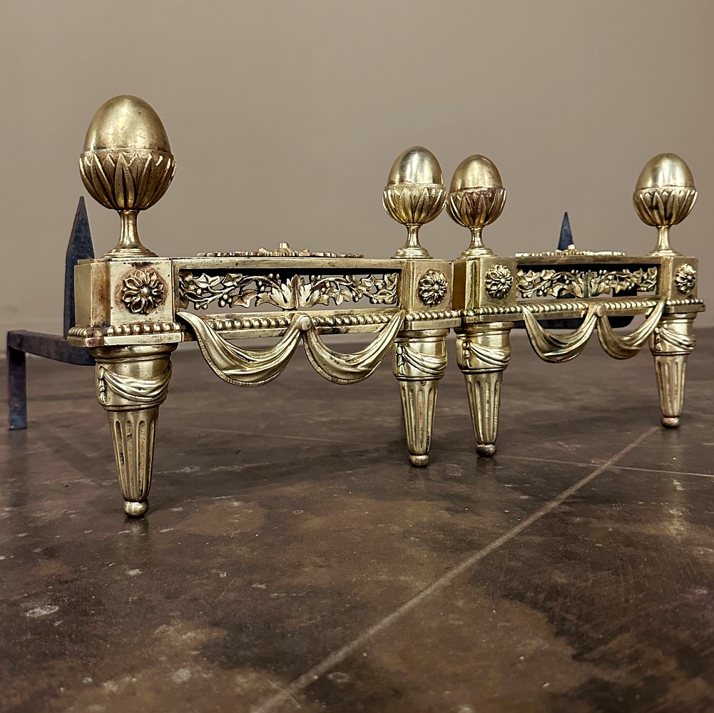 Pair 19th Century French Louis XVI Neoclassical Bronze Andirons will make an exceptional finishing touch to your hearth! Cast in solid bronze, each features a variety of classical motifs that remain truly timeless after three millennia. Most prominent is the egg finials set upon a lotus blossom atop each corner. The body of the andirons in between each finial is an architectural study with projecting corner pediments adorned with rosettes, acanthus leaves and vines with berries, finished off with beaded trim and fabric swags. Each is mounted to a solid wrought iron log support. Many of our customers over the years have had the iron shortened so the andirons could serve as handsome bookends elsewhere in the home.