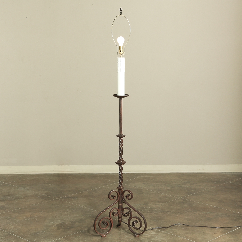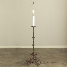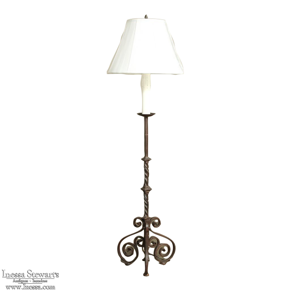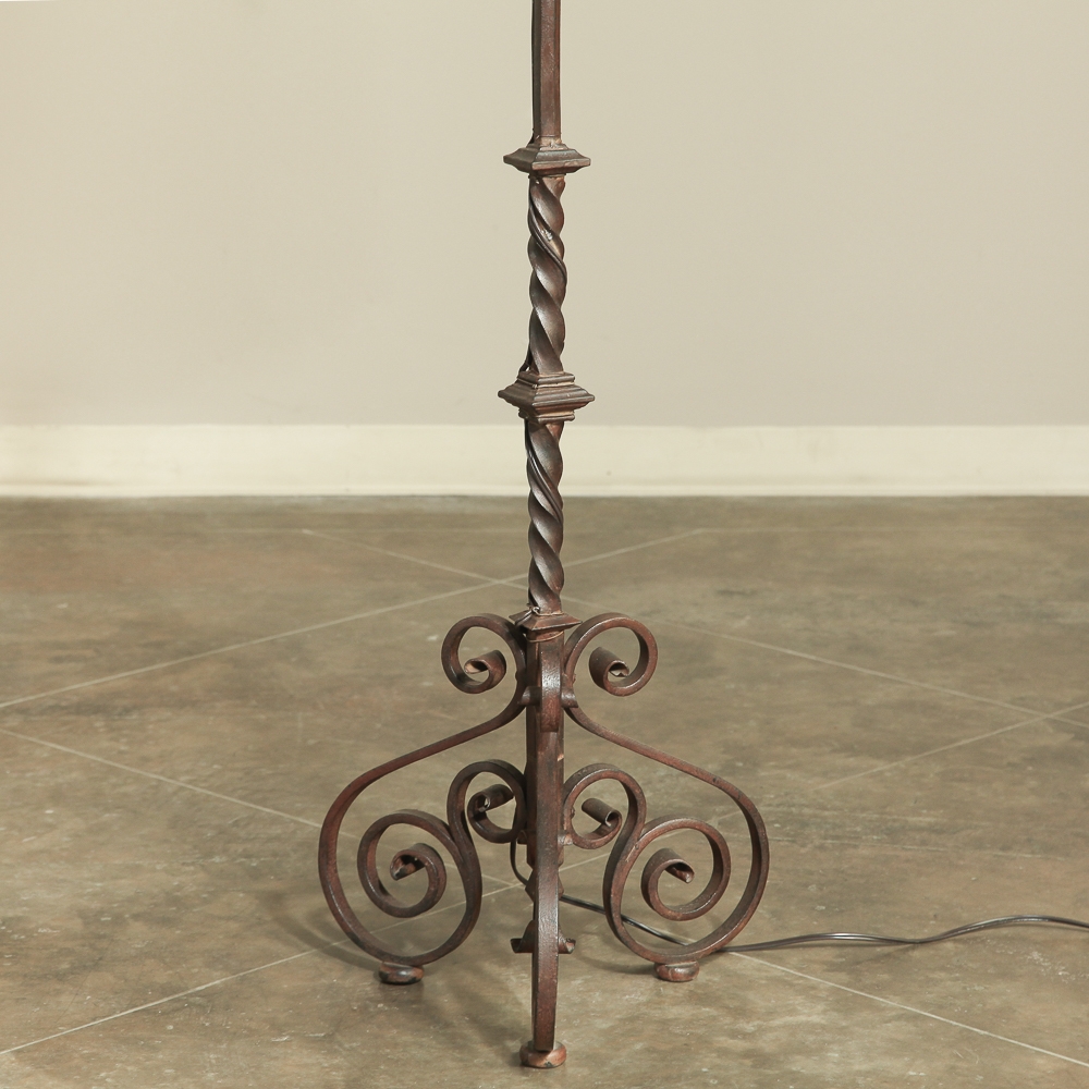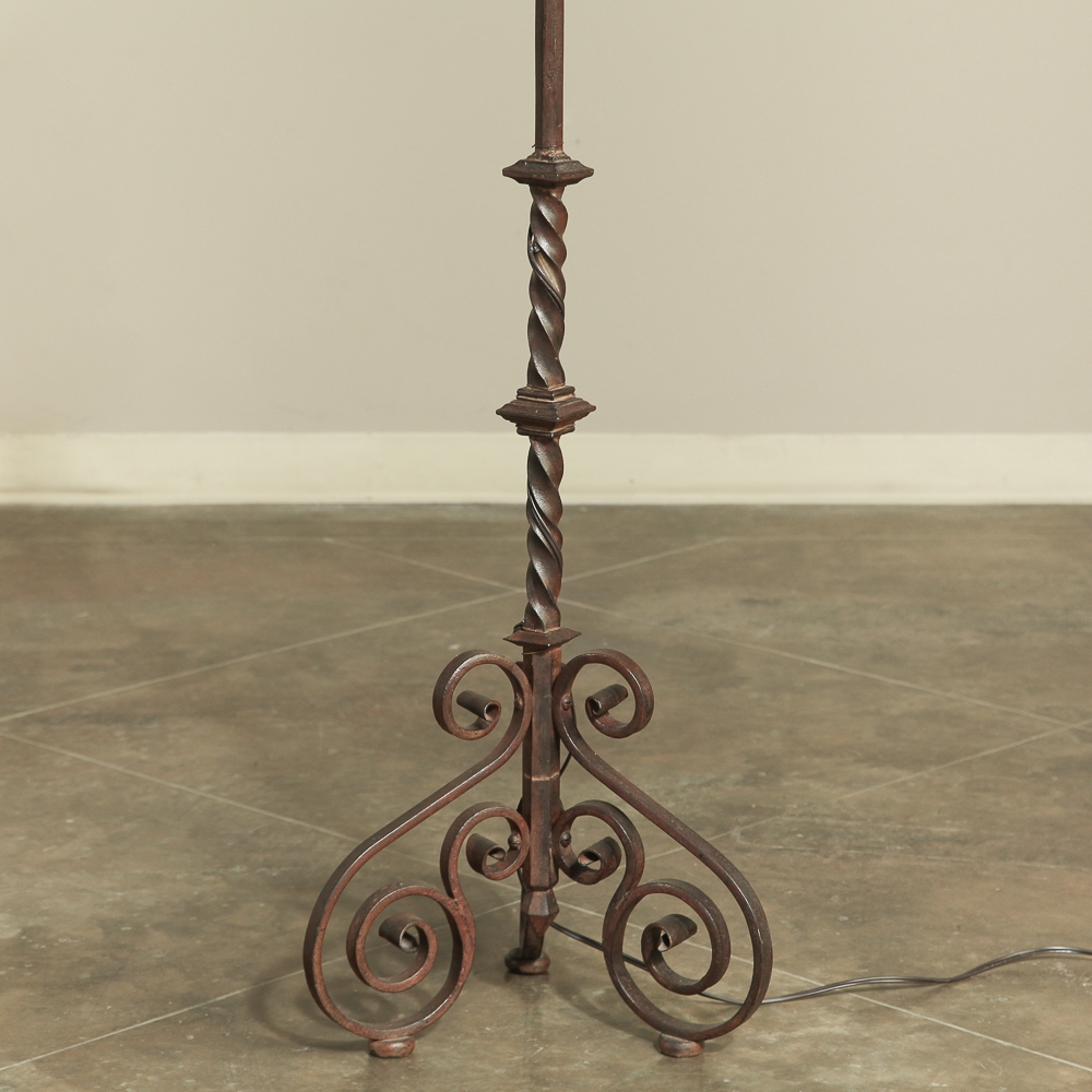 Forged from solid iron and still showing traces of its original painted finish that has achieved a fine patina, this 19th Century French Torchere Wrought Iron Floorlamp was originally designed for a candle, and now is perfect for the Country French decor! The elegant scrolls of the tripod leg structure provide a stable base, with the central shaft consisting of two twisted rod segments and a top extension that supports the original bobeche which was designed to capture dripping candle wax. Newly electrified, the price includes the hand-sewn silk shade as pictured.