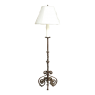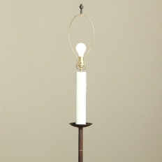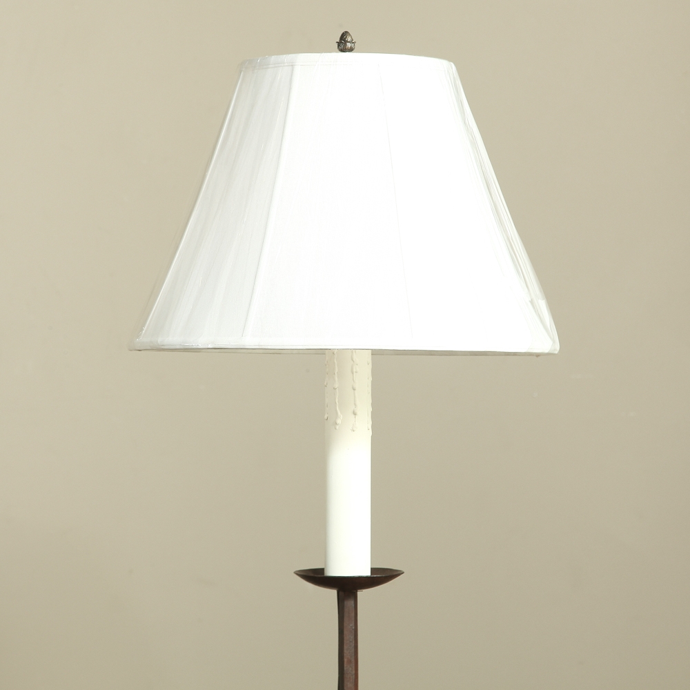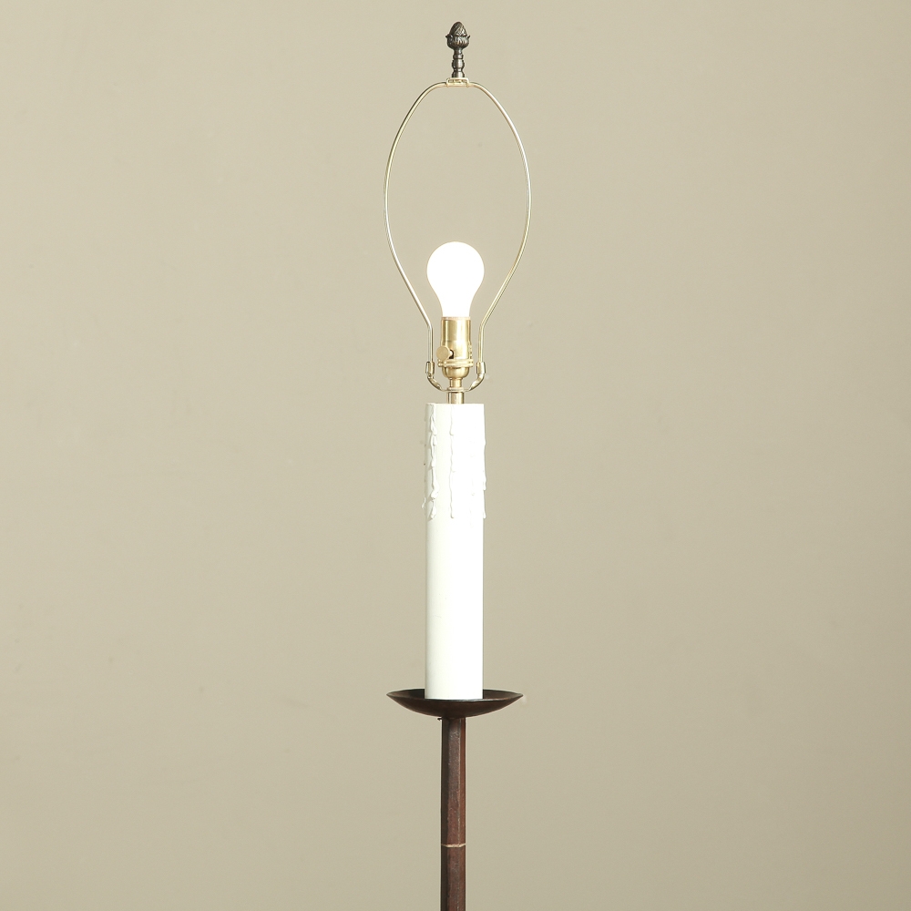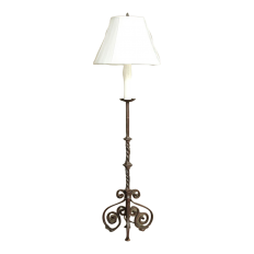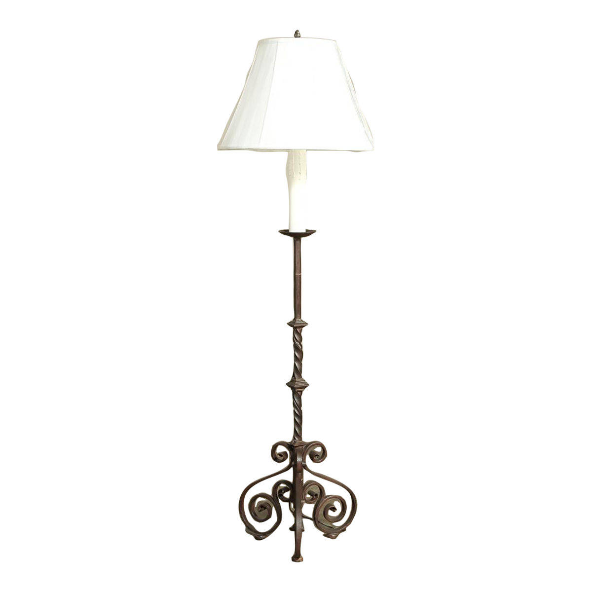 Forged from solid iron and still showing traces of its original painted finish that has achieved a fine patina, this 19th Century French Torchere Wrought Iron Floorlamp was originally designed for a candle, and now is perfect for the Country French decor! The elegant scrolls of the tripod leg structure provide a stable base, with the central shaft consisting of two twisted rod segments and a top extension that supports the original bobeche which was designed to capture dripping candle wax. Newly electrified, the price includes the hand-sewn silk shade as pictured.