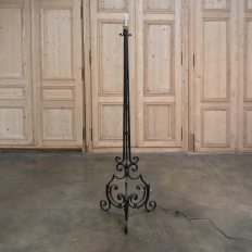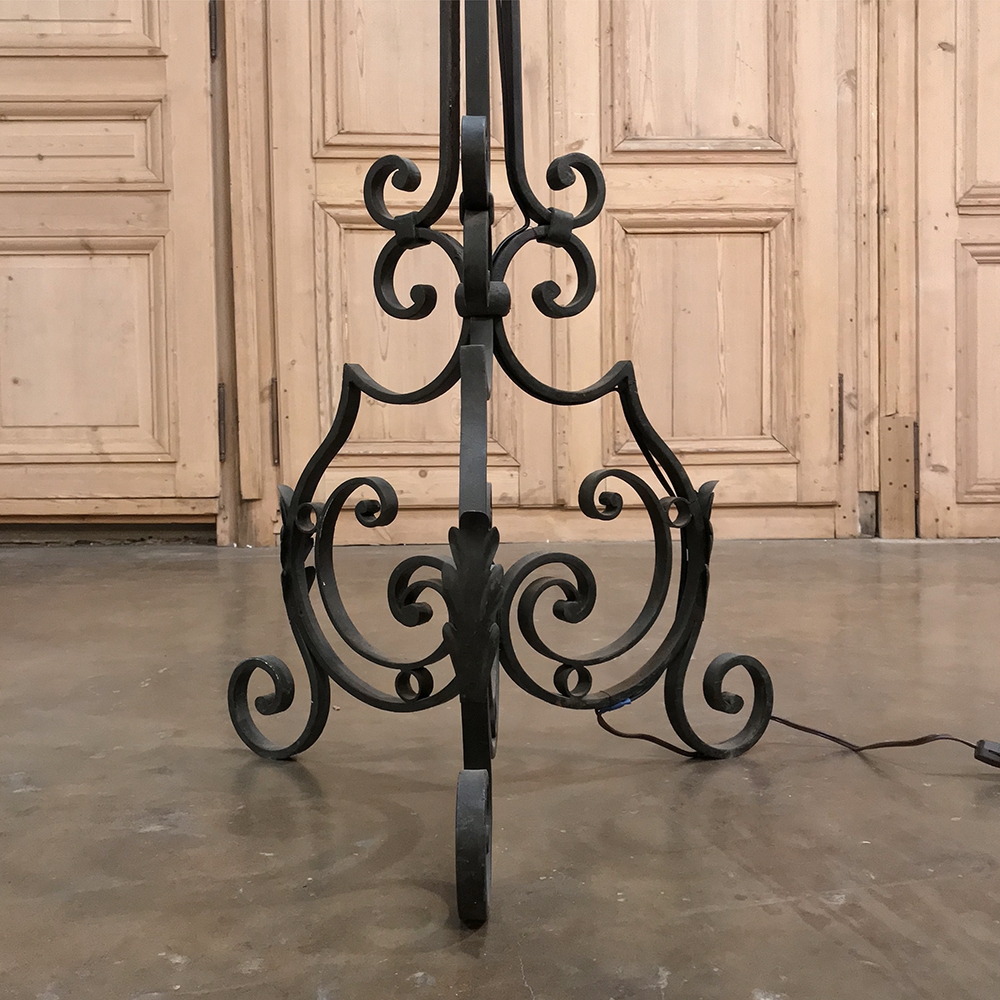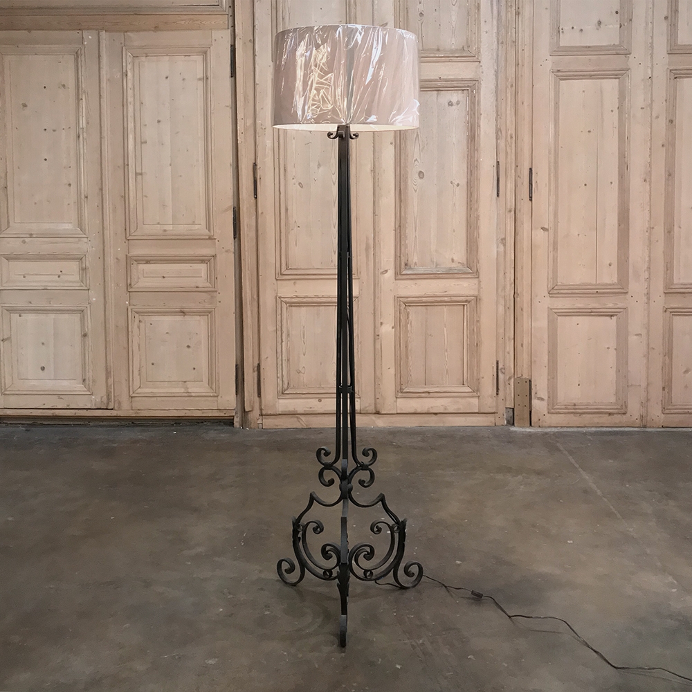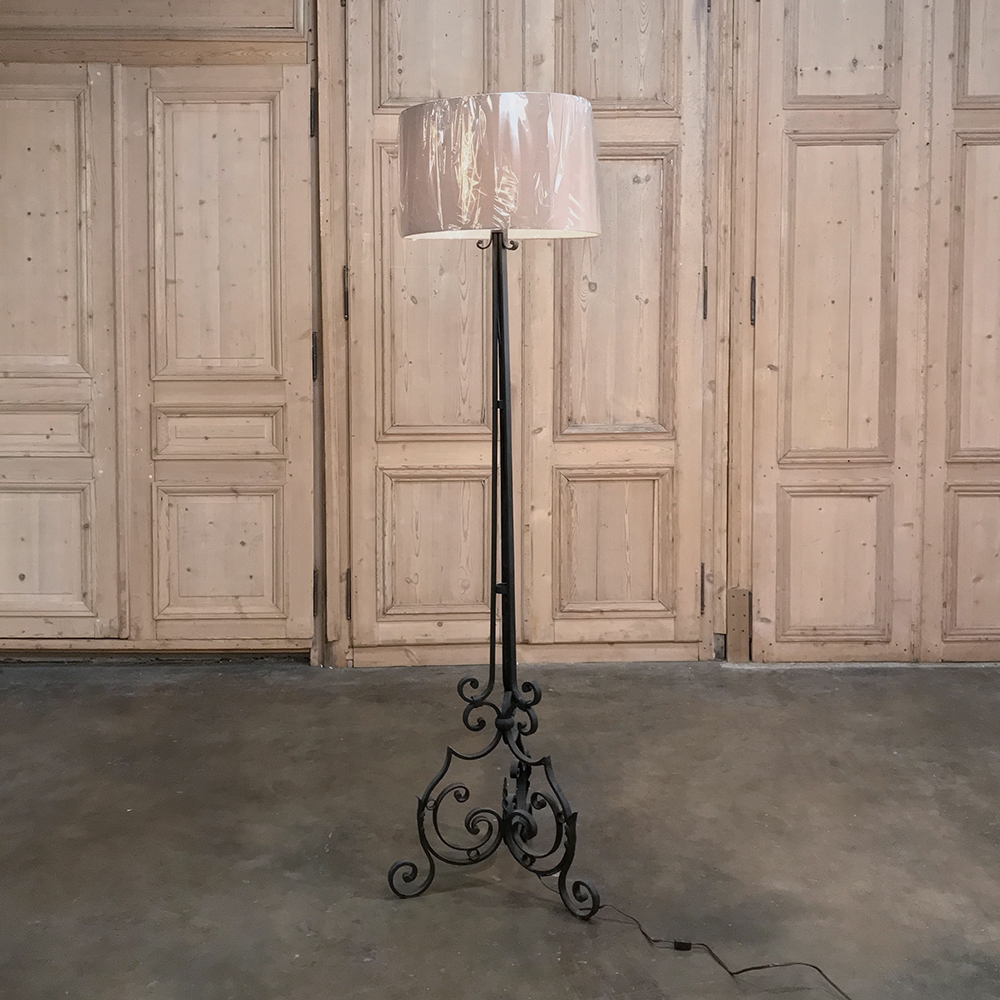 Country French Wrought Iron Floor Lamp has been wonderfully hand-crafted in the south of France by a talented blacksmith, and has also been newly electrified. Note the intricate scrollwork on the tripod base and just above, proof of the skills of the artisan who forged it from solid red-hot iron. Newly electrified with standard wiring, and fitted with a silk shade, all included in the price!
