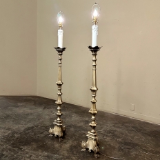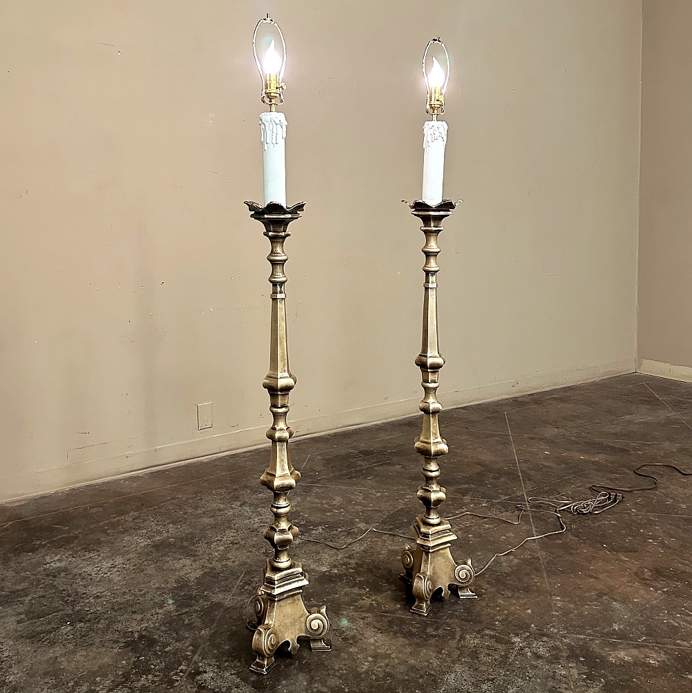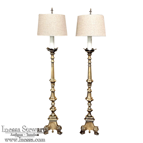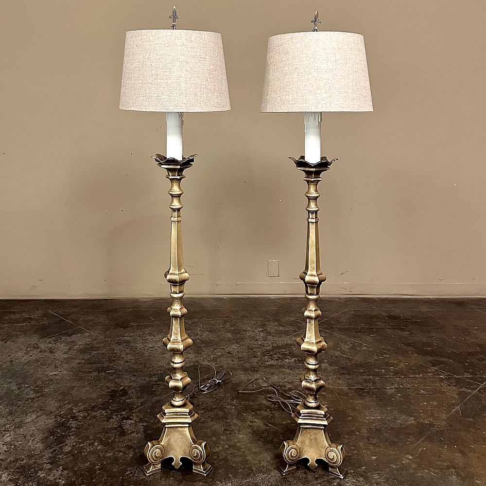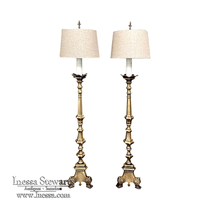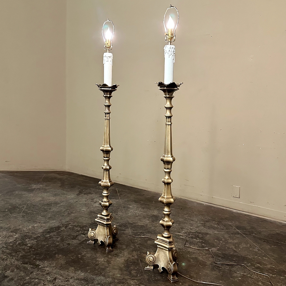 Pair 19th Century Bronze Candlestick Floor Lamps is a remarkable find! Heavy cast bronze comprises the entirety of the candlestick, featuring intricate turnings and a castellated bobeche at top, contrasting with the footed tripod base below. Such candlesticks were intended for rooms with a grand scale, so using them as a floor lamp in more typical home spaces is a great way to keep the past alive. Painstakingly cleaned and professionally wired to accommodate any medium base bulb (lamp), the new high-quality socket rests atop a realistic candlesleeve cover. Price includes the harp and fleur de lys finial as shown; shades not included. Add the ambiance of the Old World to your favorite room in perfect symmetry!