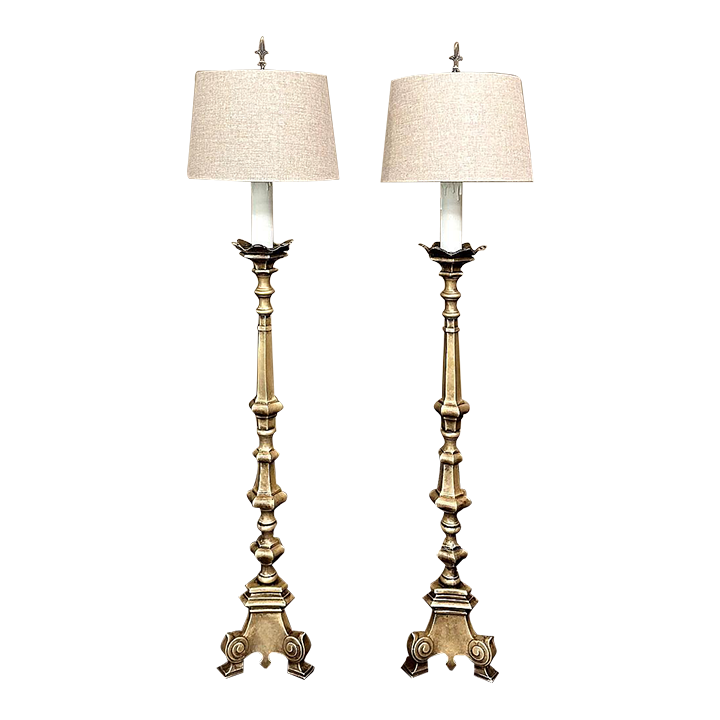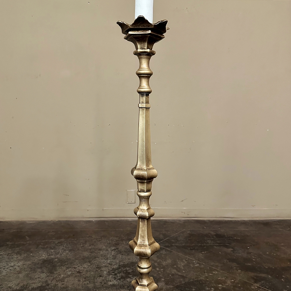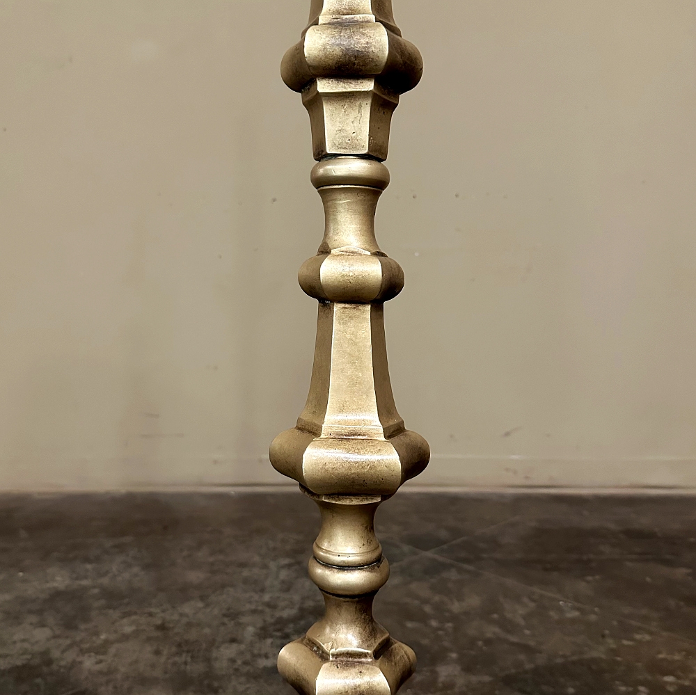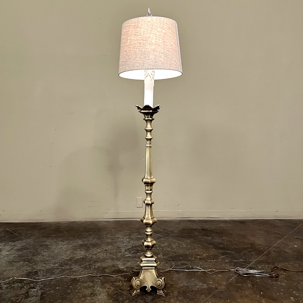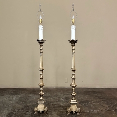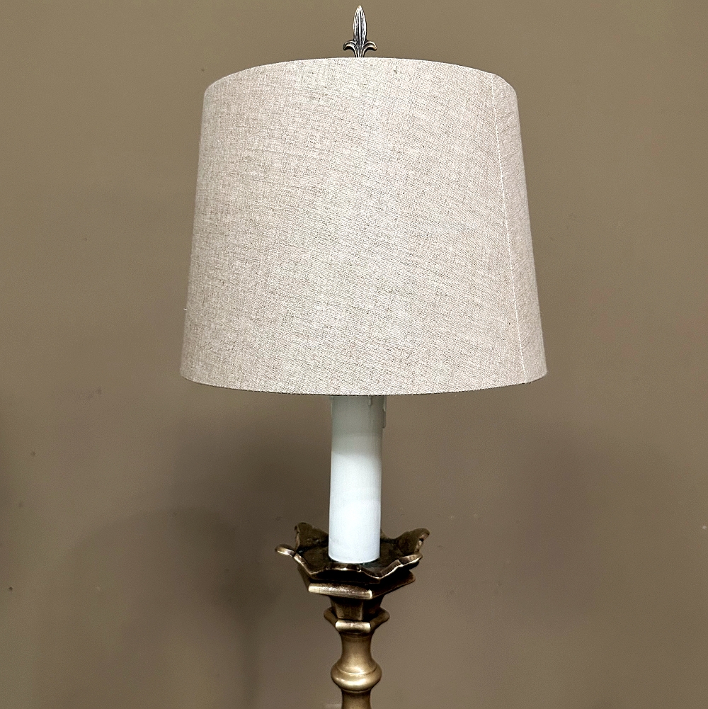 Pair 19th Century Bronze Candlestick Floor Lamps is a remarkable find! Heavy cast bronze comprises the entirety of the candlestick, featuring intricate turnings and a castellated bobeche at top, contrasting with the footed tripod base below. Such candlesticks were intended for rooms with a grand scale, so using them as a floor lamp in more typical home spaces is a great way to keep the past alive. Painstakingly cleaned and professionally wired to accommodate any medium base bulb (lamp), the new high-quality socket rests atop a realistic candlesleeve cover. Price includes the harp and fleur de lys finial as shown; shades not included. Add the ambiance of the Old World to your favorite room in perfect symmetry!