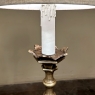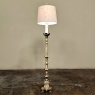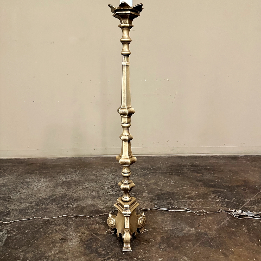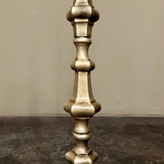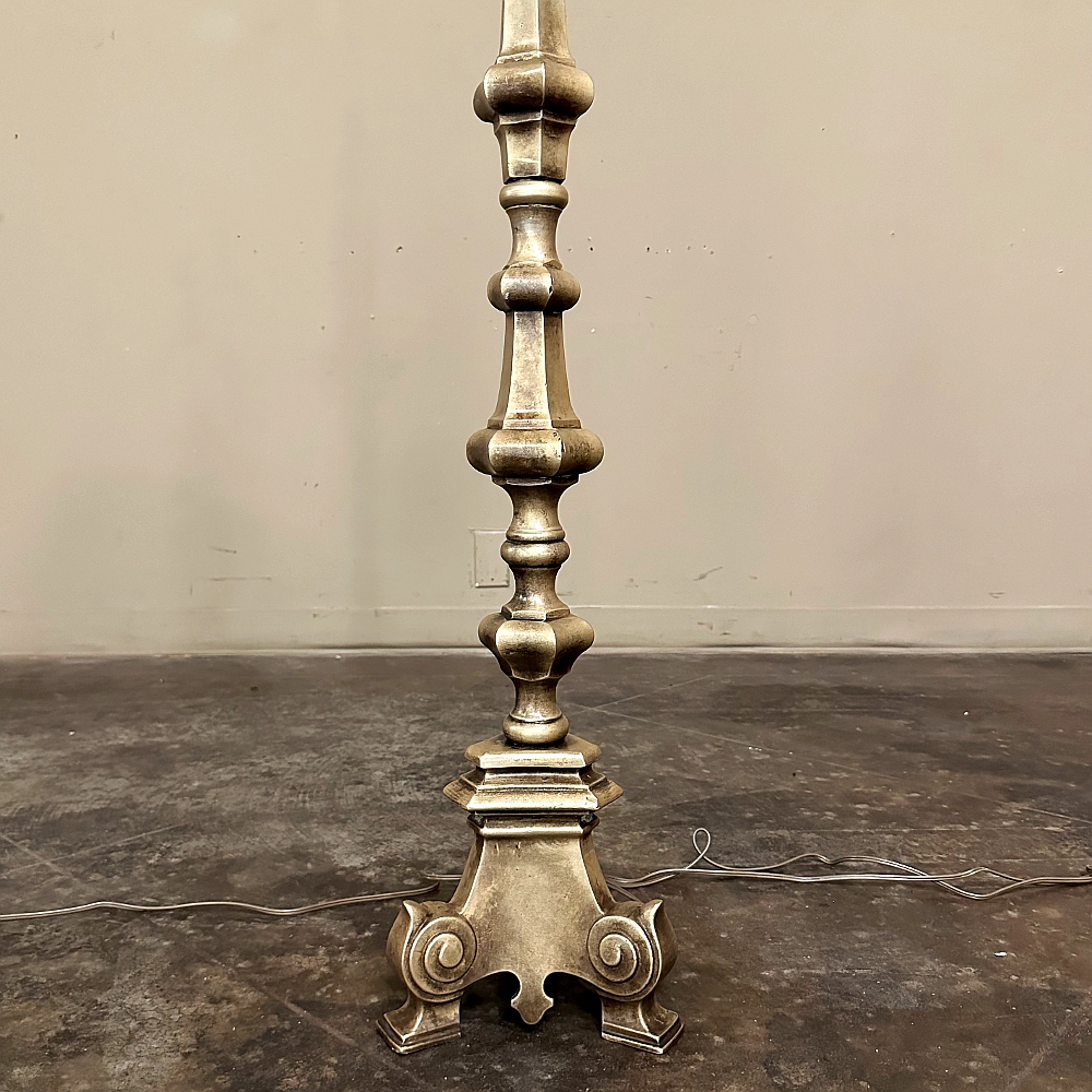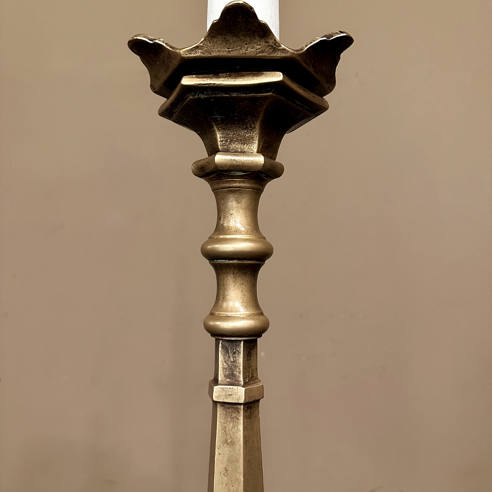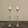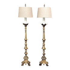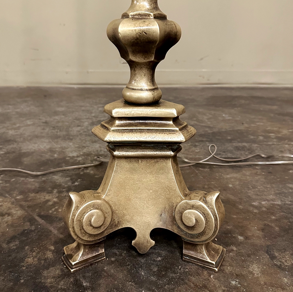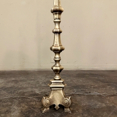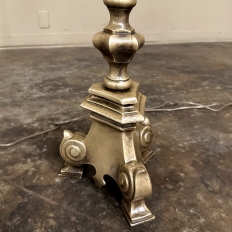 Pair 19th Century Bronze Candlestick Floor Lamps is a remarkable find! Heavy cast bronze comprises the entirety of the candlestick, featuring intricate turnings and a castellated bobeche at top, contrasting with the footed tripod base below. Such candlesticks were intended for rooms with a grand scale, so using them as a floor lamp in more typical home spaces is a great way to keep the past alive. Painstakingly cleaned and professionally wired to accommodate any medium base bulb (lamp), the new high-quality socket rests atop a realistic candlesleeve cover. Price includes the harp and fleur de lys finial as shown; shades not included. Add the ambiance of the Old World to your favorite room in perfect symmetry!