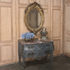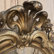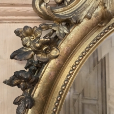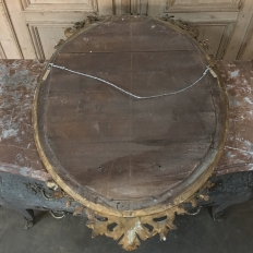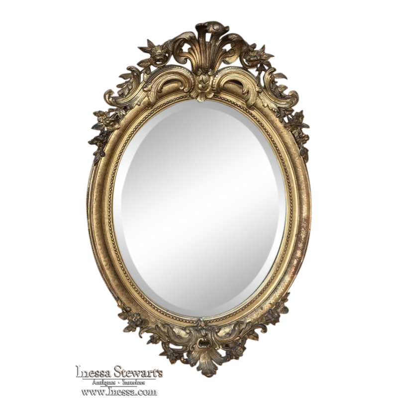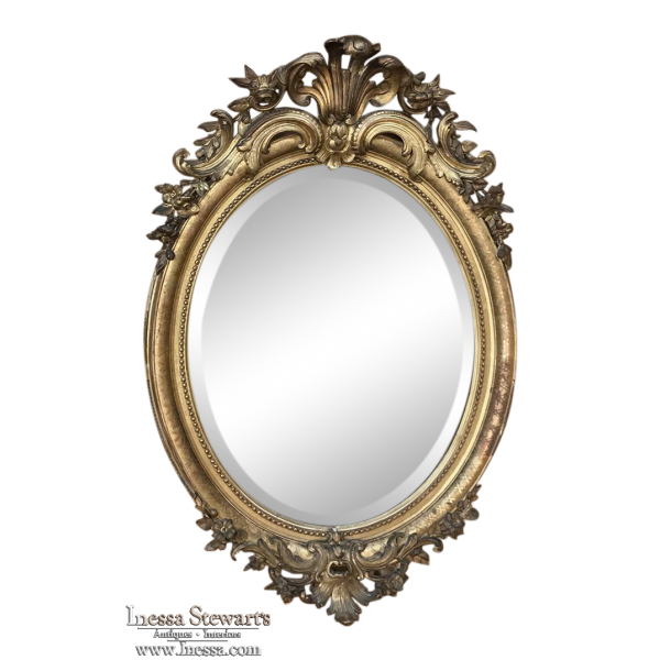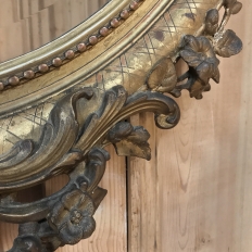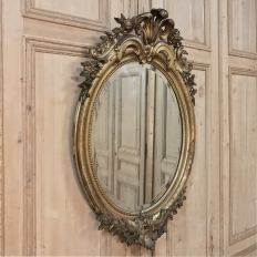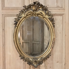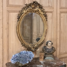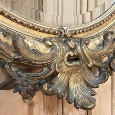 Sale19th century French Louis XVI Gilded Oval Mirror is poised to create a lavish decorative touch to any room, with its elaborate stylized shell, floral and foliate motifs above and below, and subtly embossed frame in between, all surrounding the original oval beveled mirror. Original finish on the frame has also achieved a captivating patina over the past century, accentuating the artistry of the embellishment. It is unusual for the crown and the base to have such prominent decoration, indicating this mirror was probably special ordered, or was an upper end item in the maker's catalogue. Even the frame on the sides exhibits a subtle embossed pattern, with a beaded molding trim immediately adjacent to the mirror glass. With such a keepsake, one can immediately create a focal point in the room as well as enhance ambient light!