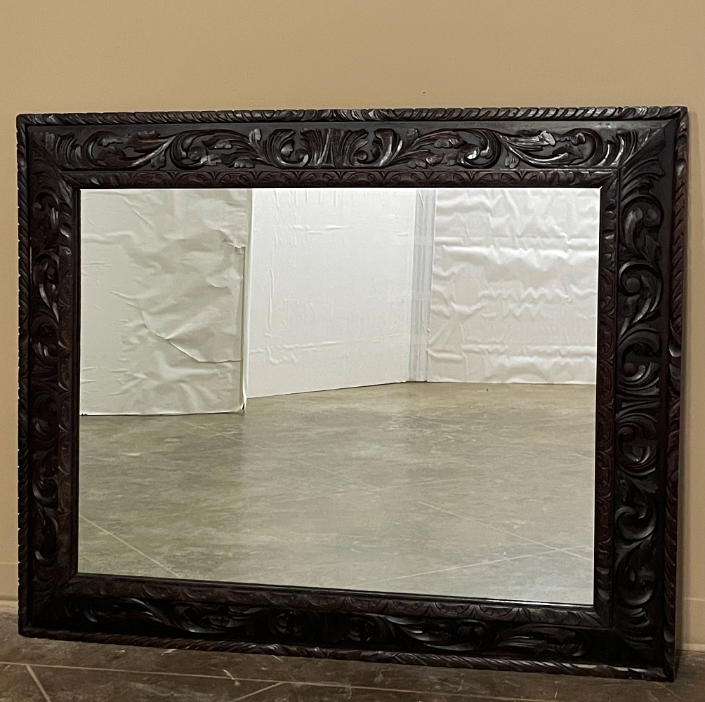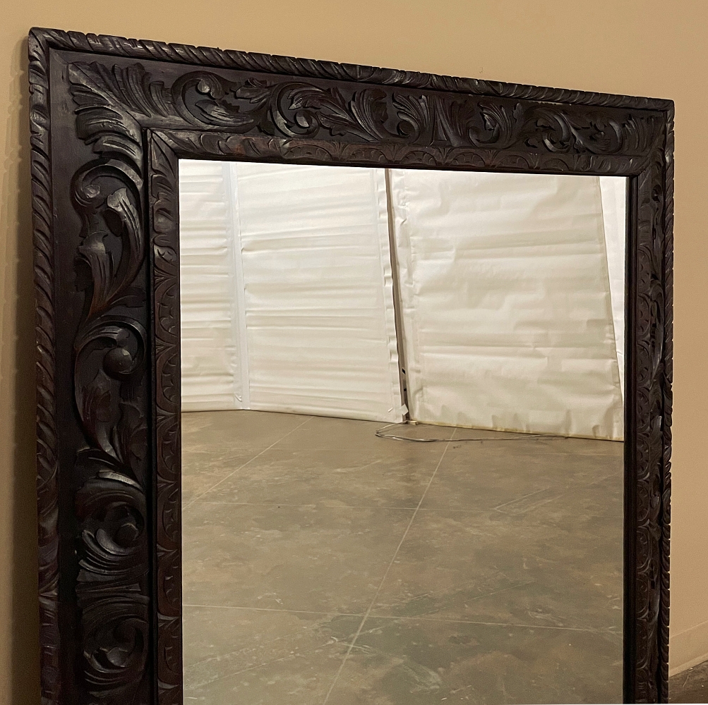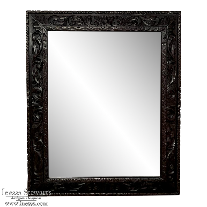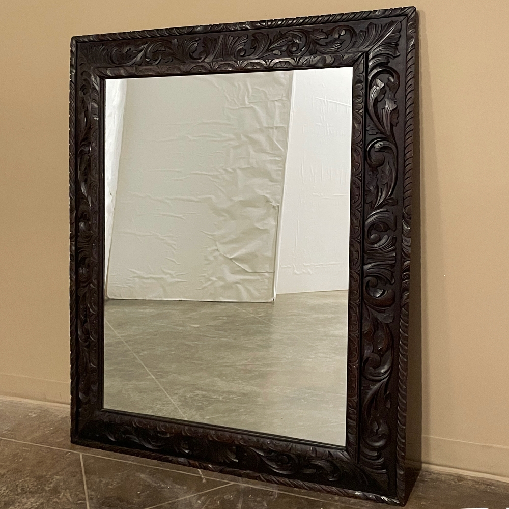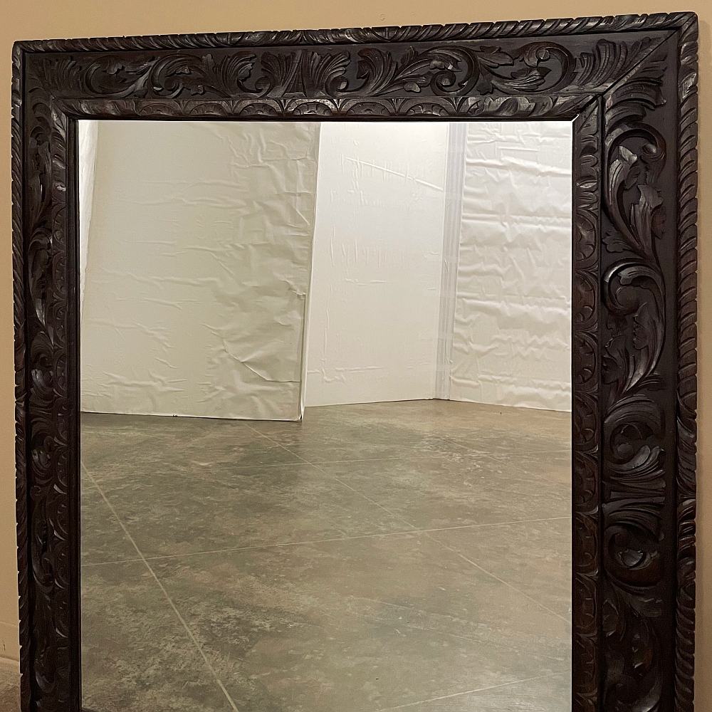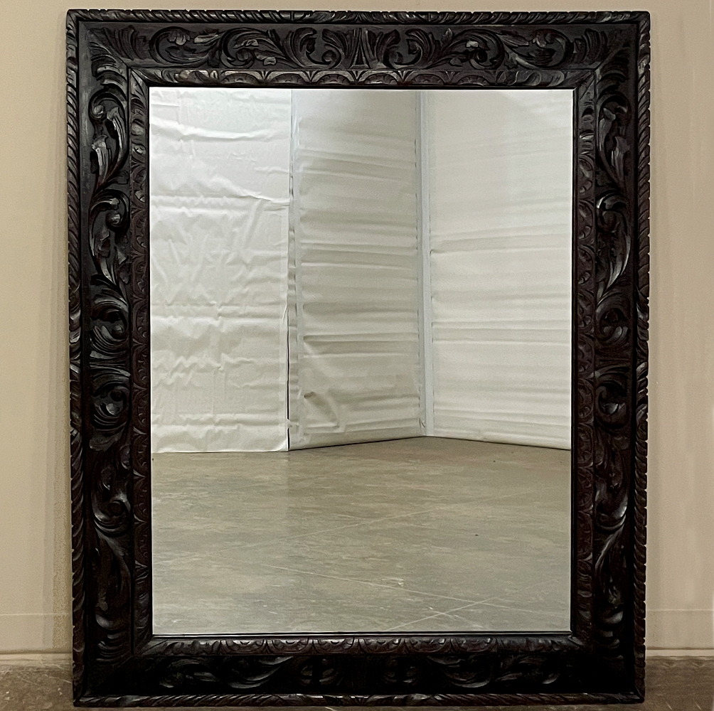 Antique French Renaissance Hand-Carved Wall Mirror is a great choice to add Old World ambiance to any room, and with its consistent framework can be mounted vertically or horizontally on the wall! Hand-carved foliate motifs inspired by ancient Greek acanthus forms undulates across the entire framework, with a design that projects the mirror glass itself away from the wall for an intriguing three dimensional effect. Imagine the hours it took to hand-carve the foliate forms in full relief to create this visually appealing keepsake!