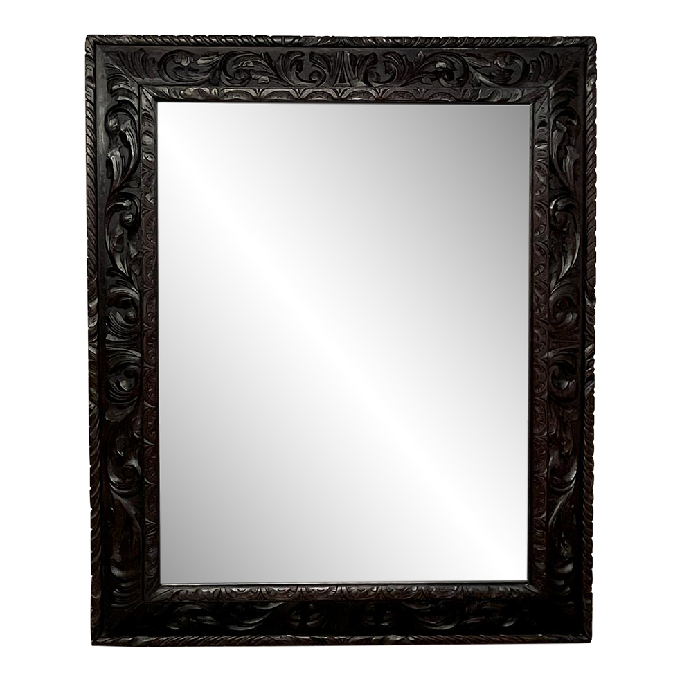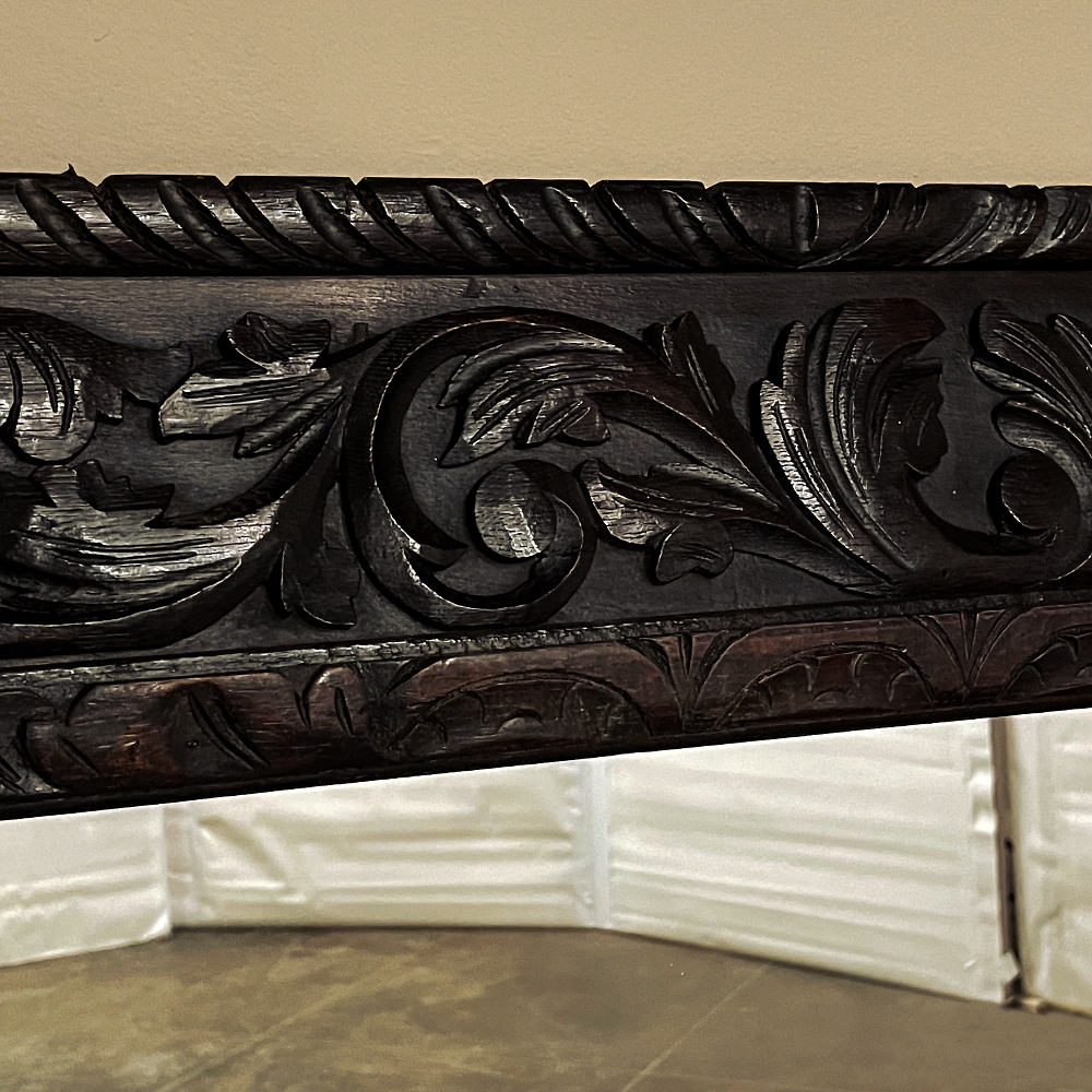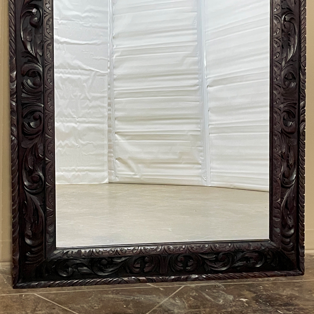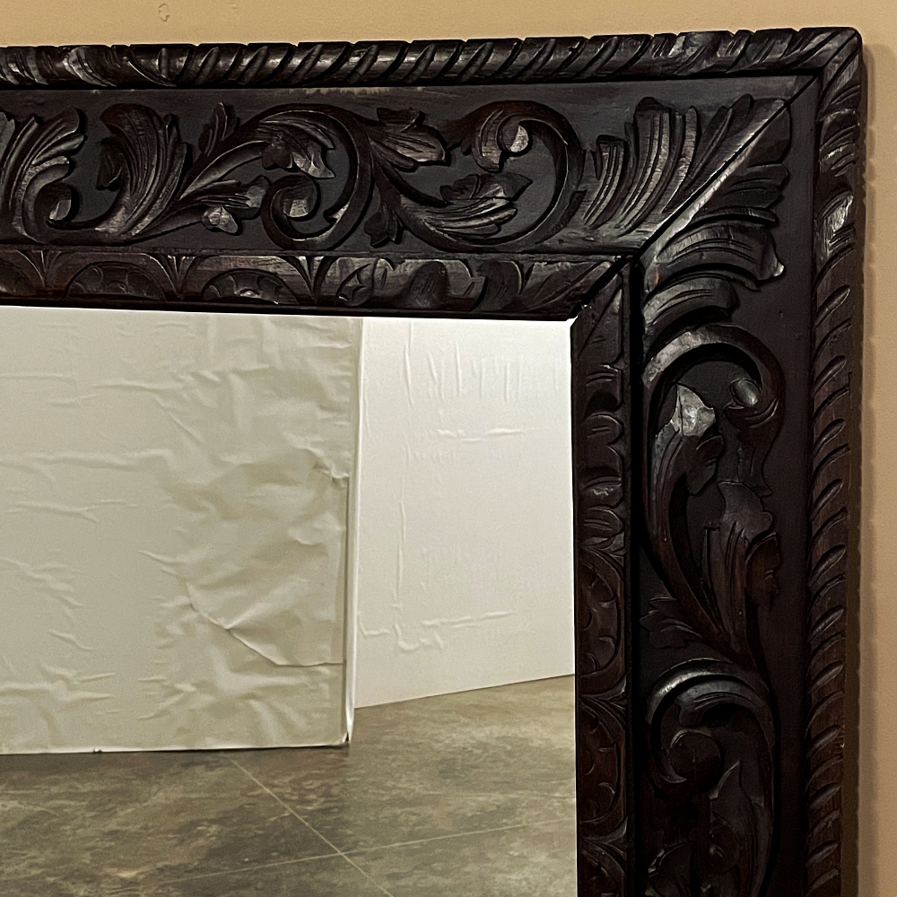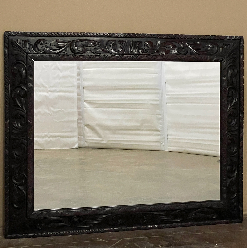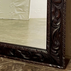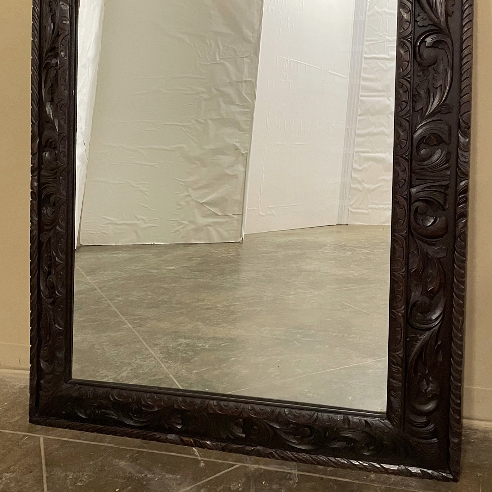 Antique French Renaissance Hand-Carved Wall Mirror is a great choice to add Old World ambiance to any room, and with its consistent framework can be mounted vertically or horizontally on the wall! Hand-carved foliate motifs inspired by ancient Greek acanthus forms undulates across the entire framework, with a design that projects the mirror glass itself away from the wall for an intriguing three dimensional effect. Imagine the hours it took to hand-carve the foliate forms in full relief to create this visually appealing keepsake!
