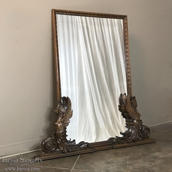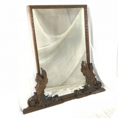 SaleAntique Italian Empire Walnut Mirror was hand-carved to depict winged angels on each side with feathered headdresses inspired by the noble Native Americans! Sculpted entirely from fine walnut, the frame surrounds the generously sized mirror, making this an excellent choice atop the fireplace mantel, in a foyer, above a buffet, or anywhere a magnificent specimen would impress!