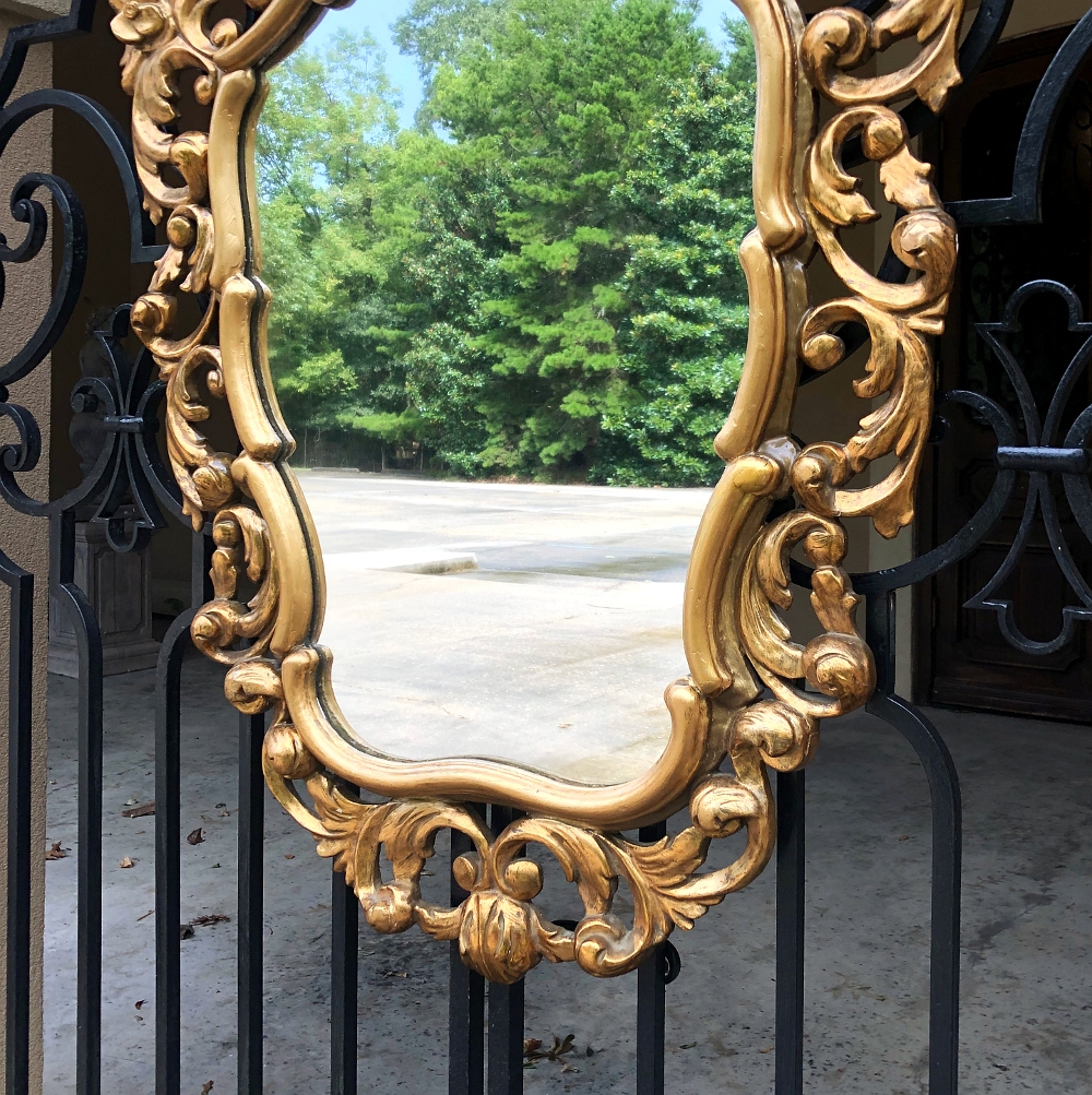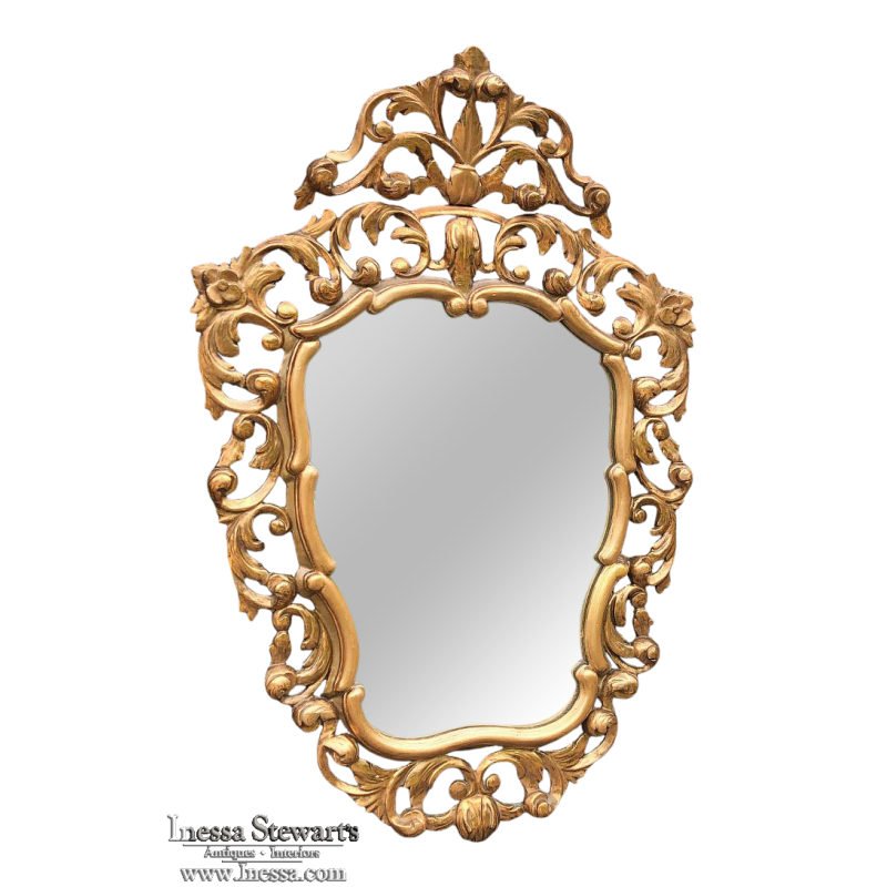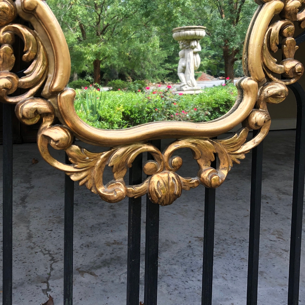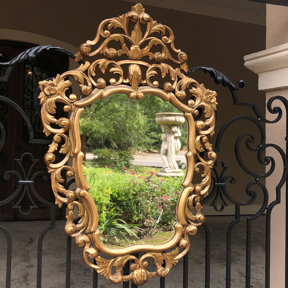 SaleItalian Baroque Giltwood Mirror was hand-carved from solid wood in an elaborate design which features full sculpting allowing the wall to show through the pierced openings in the design. Foliate motifs dominate the composition, creating a shield or crest form, with an exquisite crown projecting above overlooking the entire work. Hand-applied gold finish adds opulence, and has achieved a nice level of patina for more visual appeal and charm.