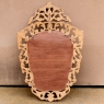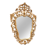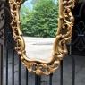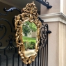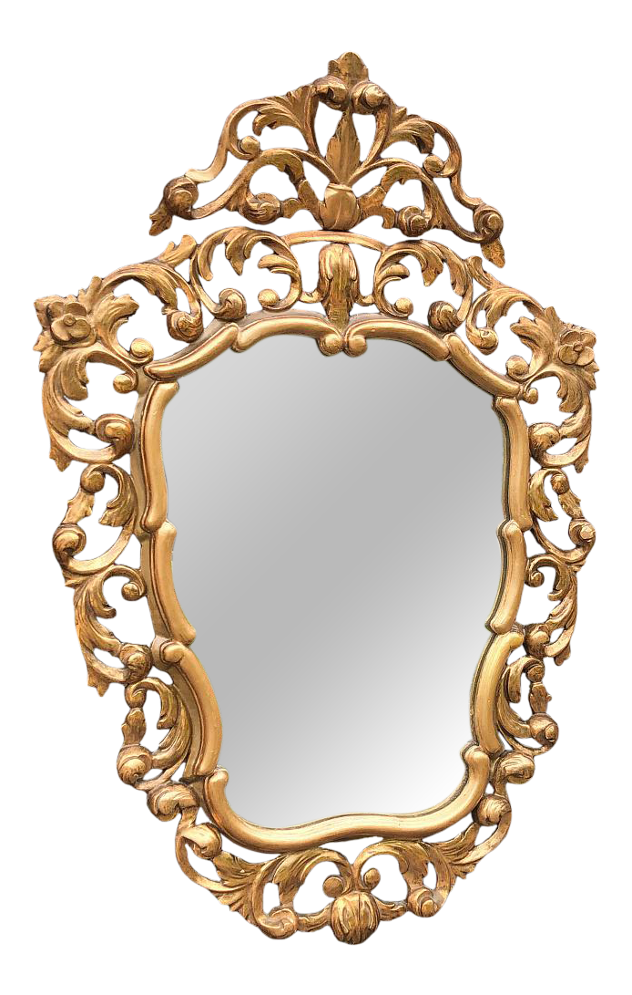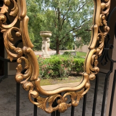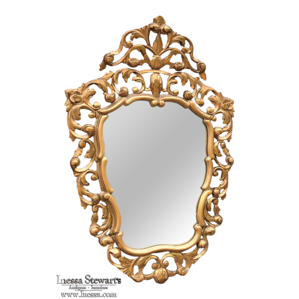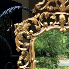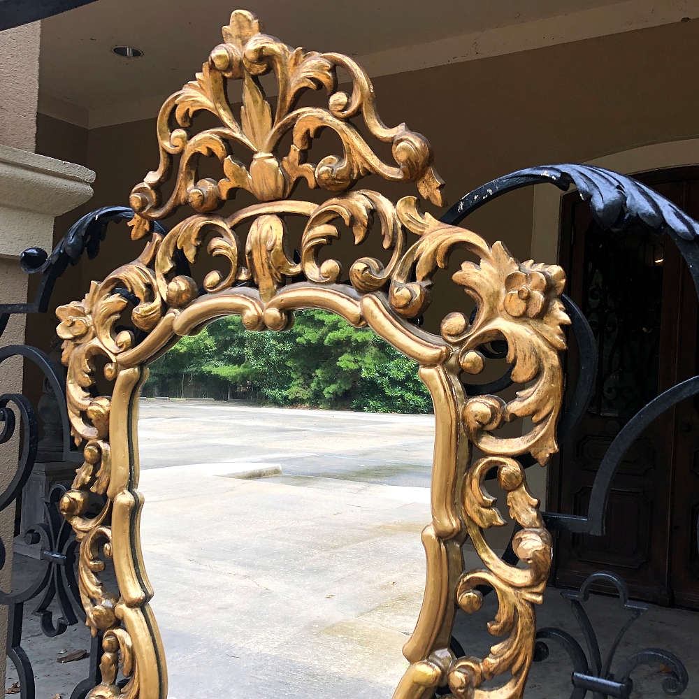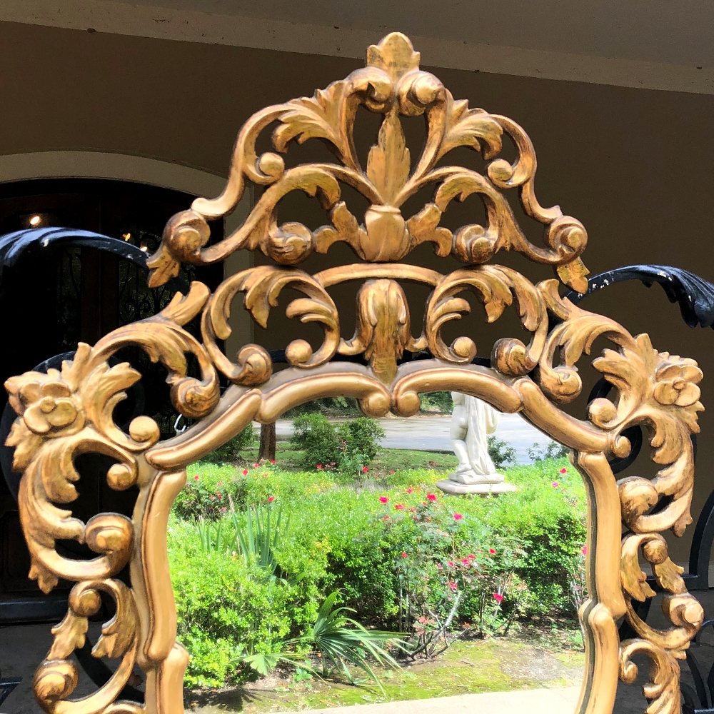 SaleItalian Baroque Giltwood Mirror was hand-carved from solid wood in an elaborate design which features full sculpting allowing the wall to show through the pierced openings in the design. Foliate motifs dominate the composition, creating a shield or crest form, with an exquisite crown projecting above overlooking the entire work. Hand-applied gold finish adds opulence, and has achieved a nice level of patina for more visual appeal and charm.