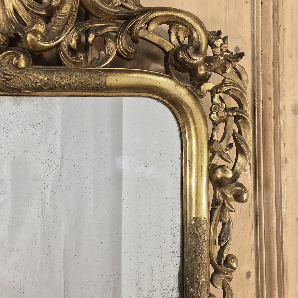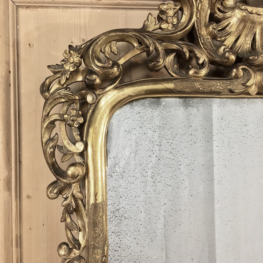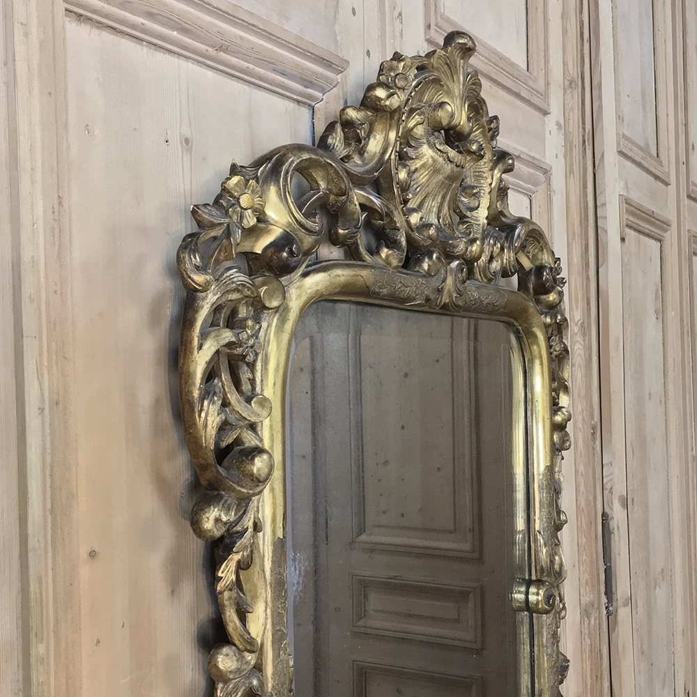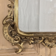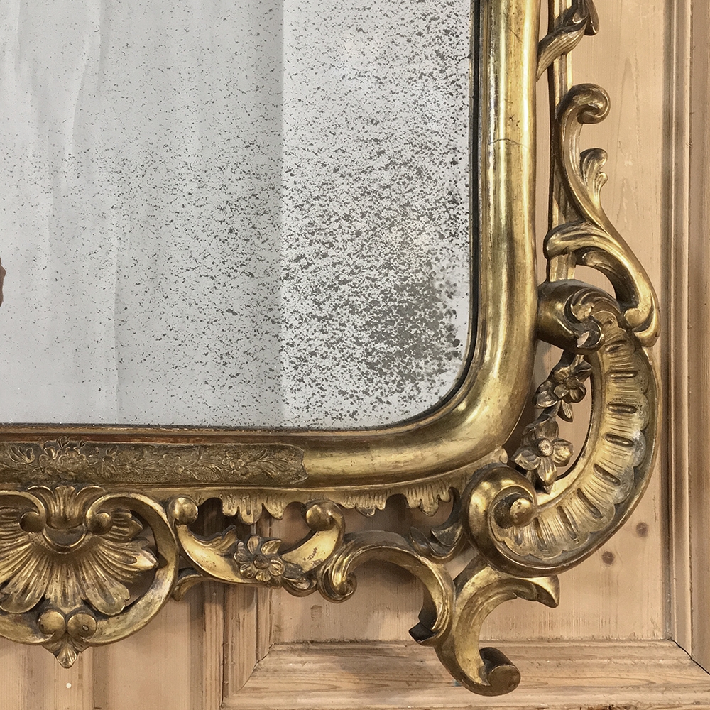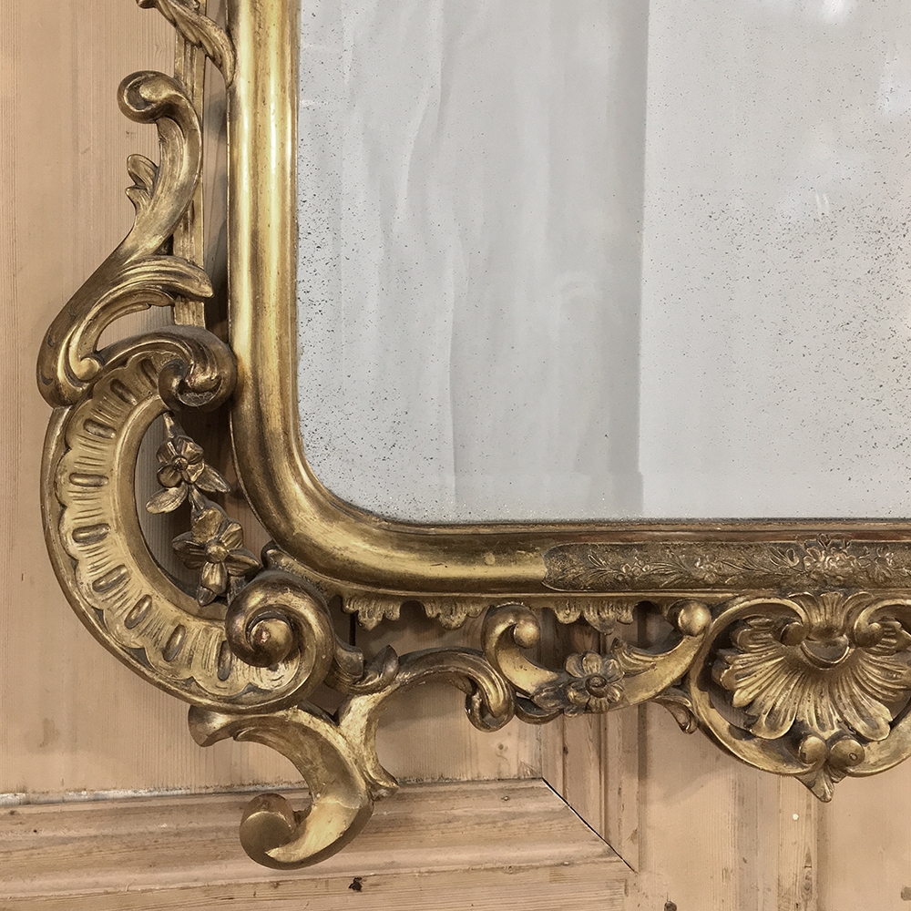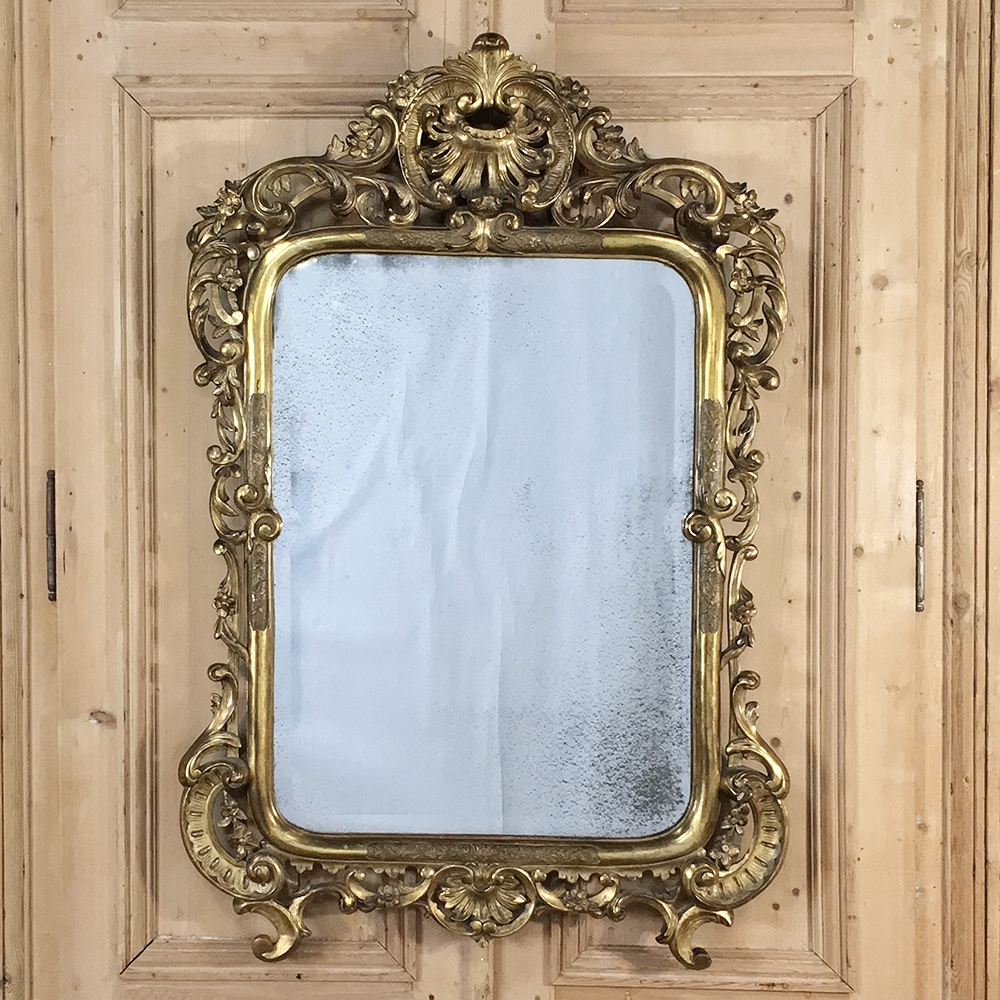 19th Century Italian Baroque Giltwood Mirror is a wonderfully well-preserved example of the master Italian sculptor's work! Intricate scroll, shell, foliate and floral motifs abound around the entire framework, pierce-carved (which is the most difficult of adornment to master) to perfection, and featuring one of the earliest examples of hand-beveled mirrors to appear on the European continent in the early second half of the 19th century. Subtle traces of silver crystallization are evident only upon close examination at the bottom, indicating this mirror was well-placed and survived over a century and a half in the same home, only to be brought here to the USA to provide enjoyment, reflected ambient light, and extraordinary beauty to your home for generations to come! Original gilded finish only adds to the allure. An exceptionally rare and incredible find!