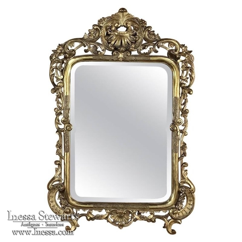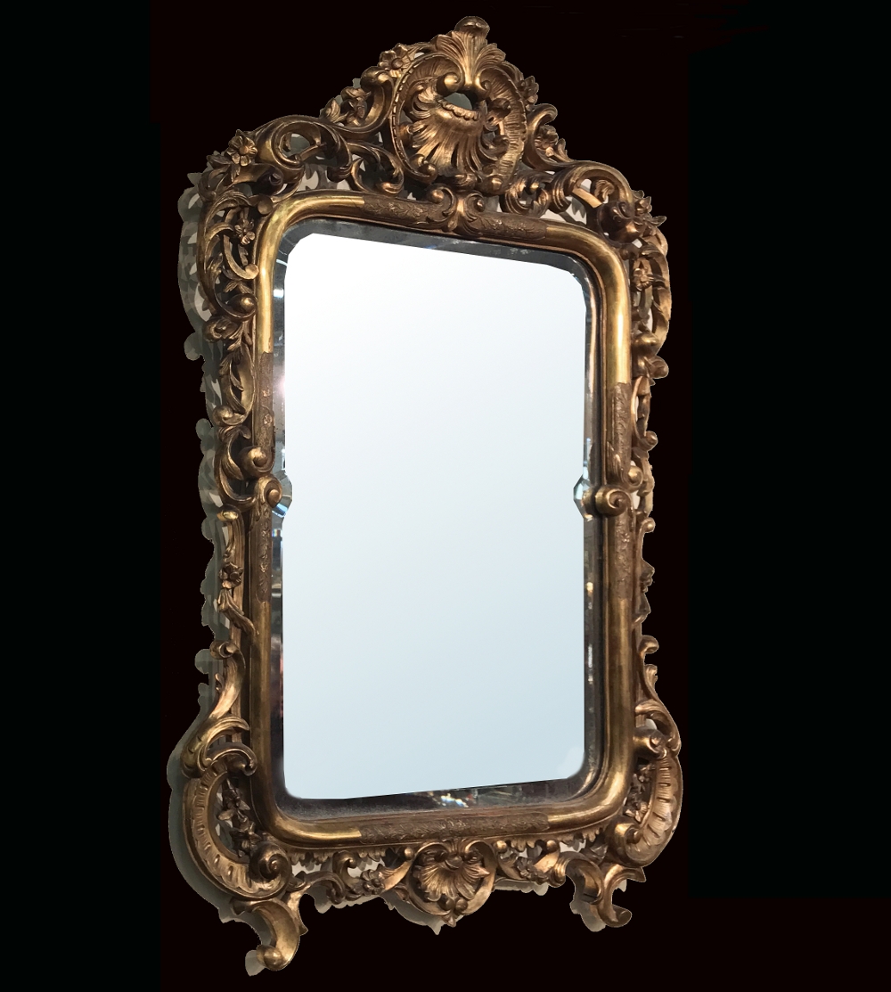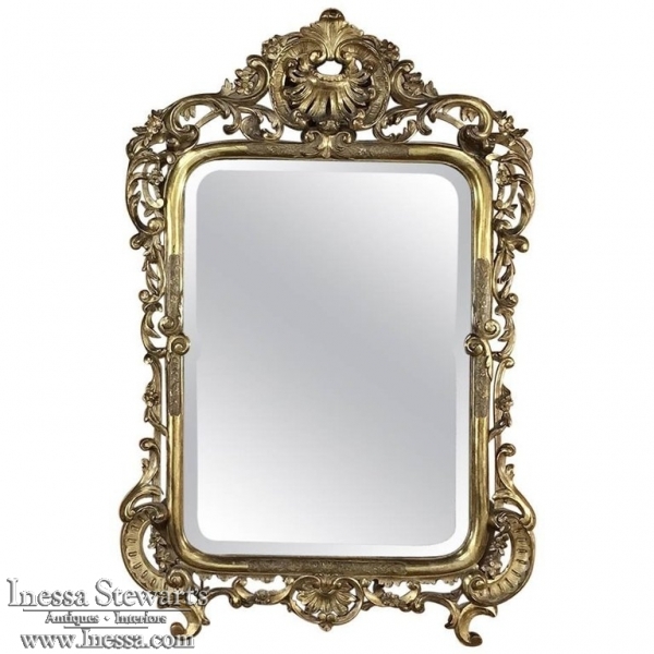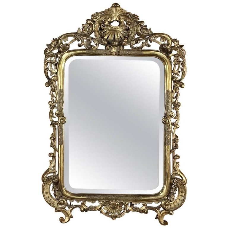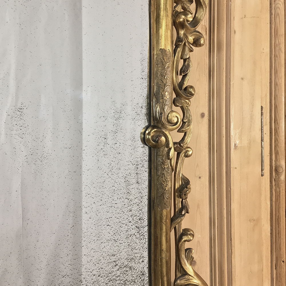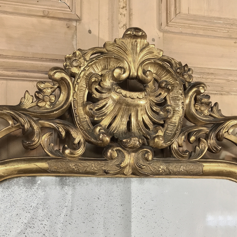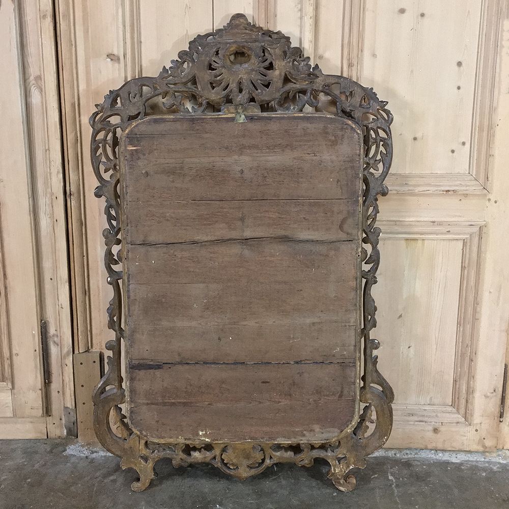 19th Century Italian Baroque Giltwood Mirror is a wonderfully well-preserved example of the master Italian sculptor's work! Intricate scroll, shell, foliate and floral motifs abound around the entire framework, pierce-carved (which is the most difficult of adornment to master) to perfection, and featuring one of the earliest examples of hand-beveled mirrors to appear on the European continent in the early second half of the 19th century. Subtle traces of silver crystallization are evident only upon close examination at the bottom, indicating this mirror was well-placed and survived over a century and a half in the same home, only to be brought here to the USA to provide enjoyment, reflected ambient light, and extraordinary beauty to your home for generations to come! Original gilded finish only adds to the allure. An exceptionally rare and incredible find!
