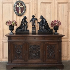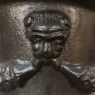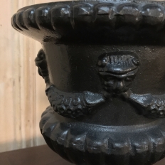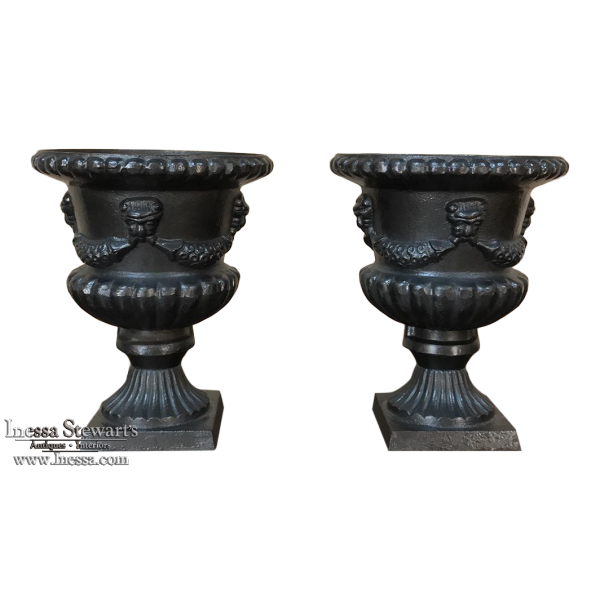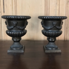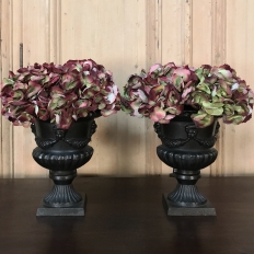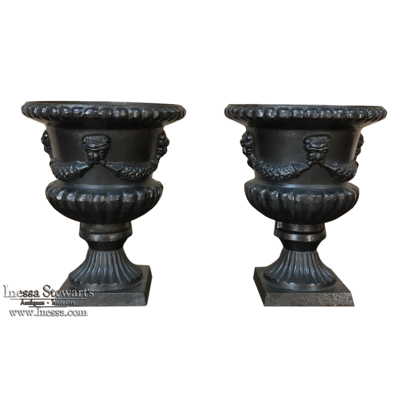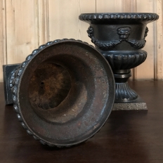 SalePair 19th Century Neoclassical Cast Iron Garden Urns are ideal for exterior or interior use. Each is a heavy casting that features a splendid neoclassical design inspired by ancient Greek and Roman architecture, with a wide opening at the top. The sides are finely decorated and include lions heads holding floral garlands that encircle the entire vase. The urn flares out once more with a lower floral collar then transitions into the pediment style base with an additional oversize square bottom that ensures stability. There's a hole at the center to allow proper drainage. Such artifacts have decorated fine homes for literally thousands of years!