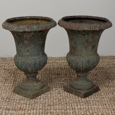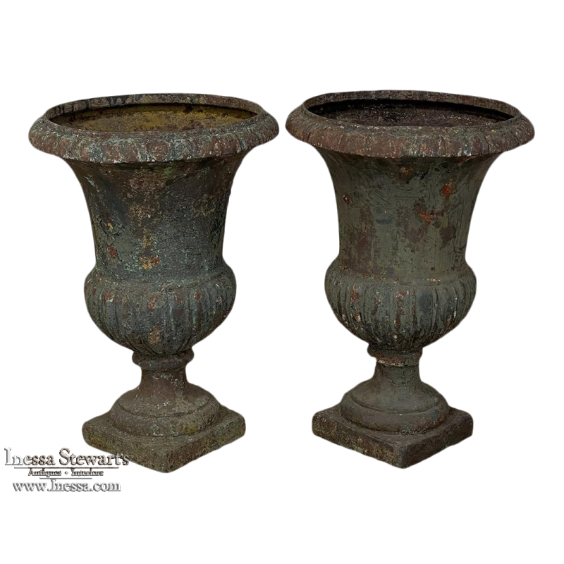 Pair 19th Century French Neoclassical Cast Iron Garden Vases ~ Jardinieres are perfect for outdoors or indoors as well! Classic design dates back to ancient Rome and Greece, with an inverted bell shape which transitions into a flared and squared base. Cast in solid iron to last for centuries!
