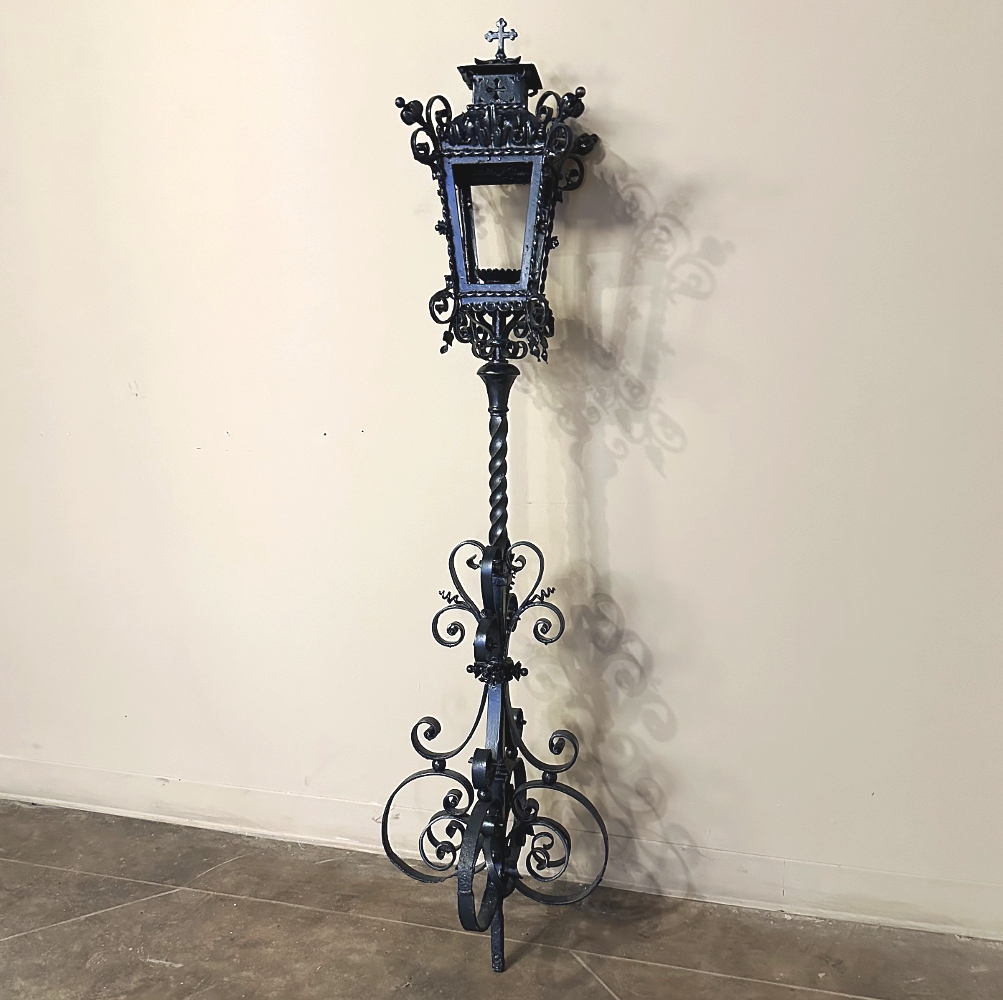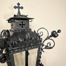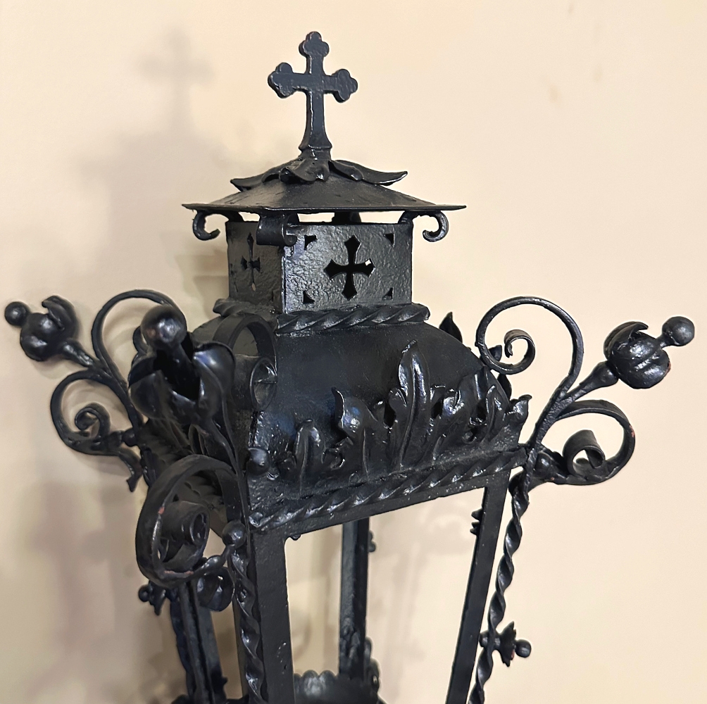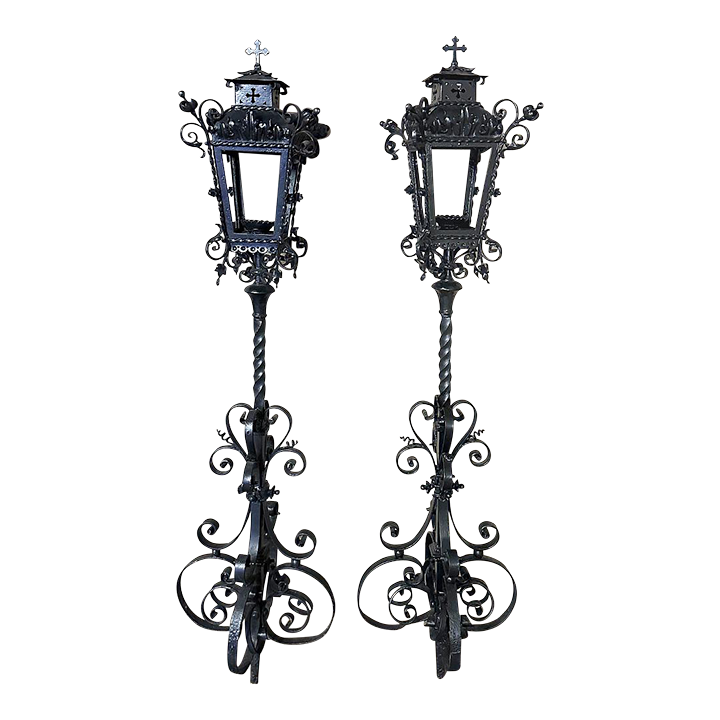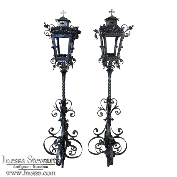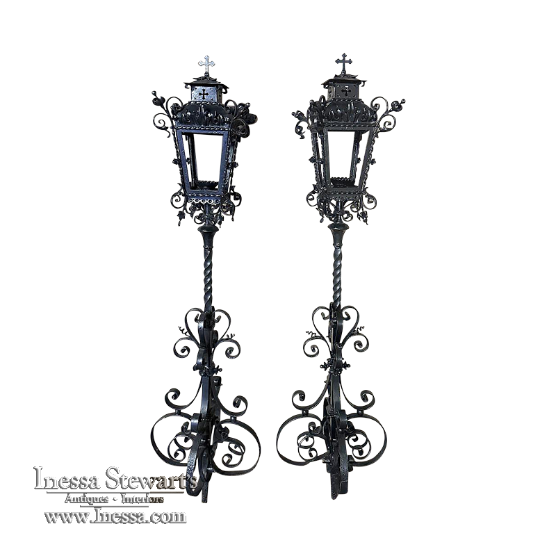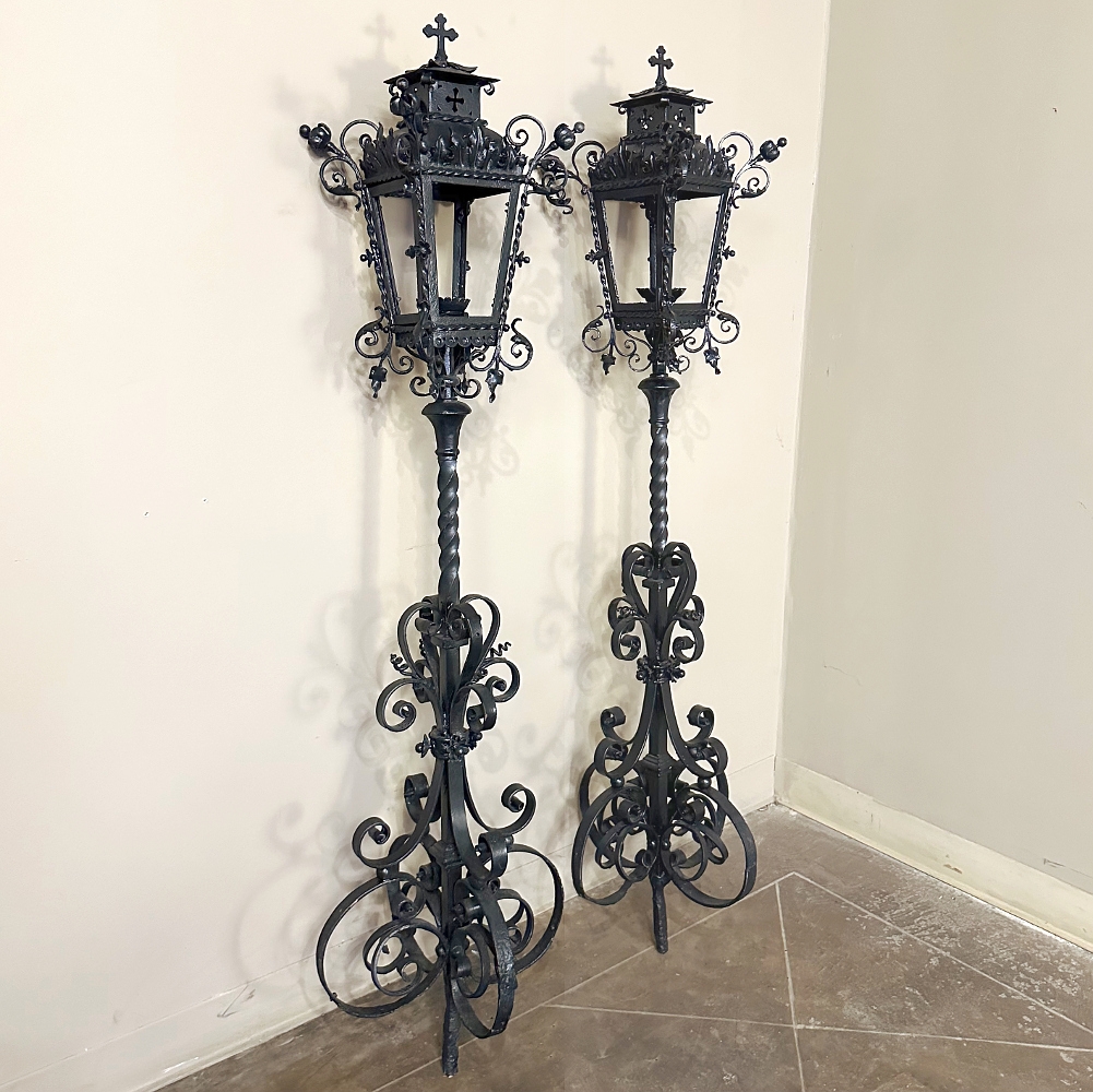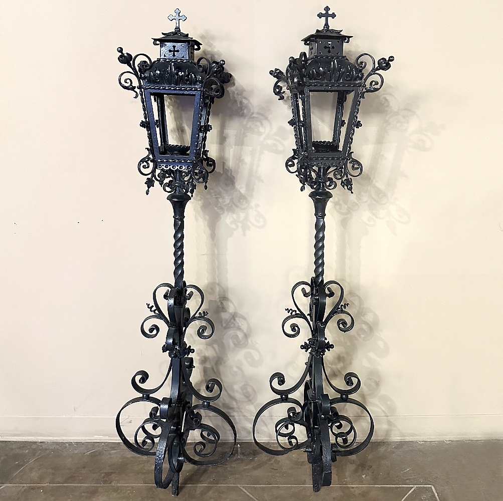 Pair 19th Century French Wrought Iron Garden Lanterns are a testament to the extraordinary talents of a master blacksmith! Intended for either the grounds around a church or a garden belonging to a family of faith, each features a cross on top, with ventilation cut into the top of the structure also in the shape of the Maltese cross. The angled four-sided lantern was designed to hold candles, but each can be electrified in the same manner as other similar wrought iron chandeliers and fixtures we carry. Note the acanthus leaves around the perimeter, floral blossoms tipping the scrolls, judicious use of twisted strips and of course the main shaft, and elaborate scrolls with rosettes and tendrils below forming the base. Extra shaft extends below the scrolls for insertion into the pedestal or mounting block for actual installation.