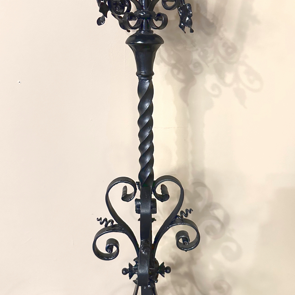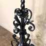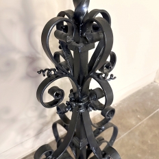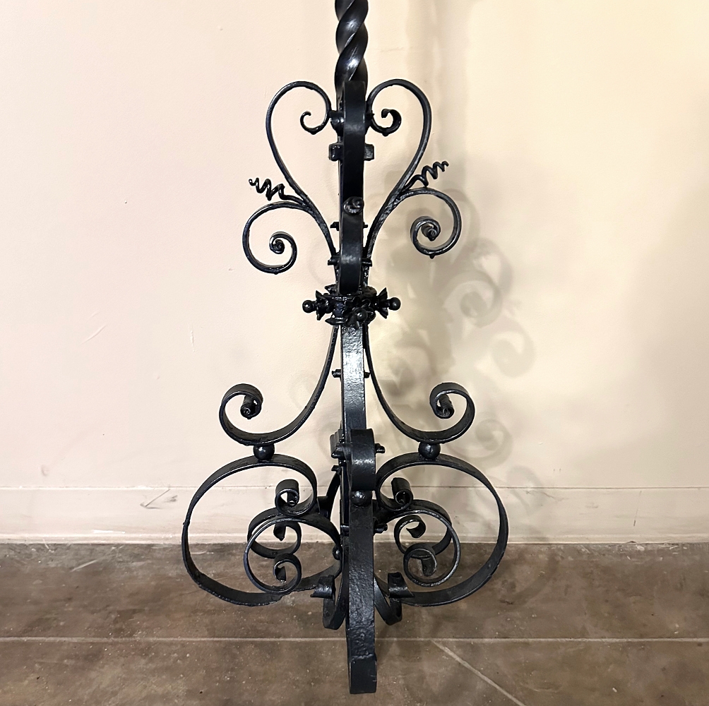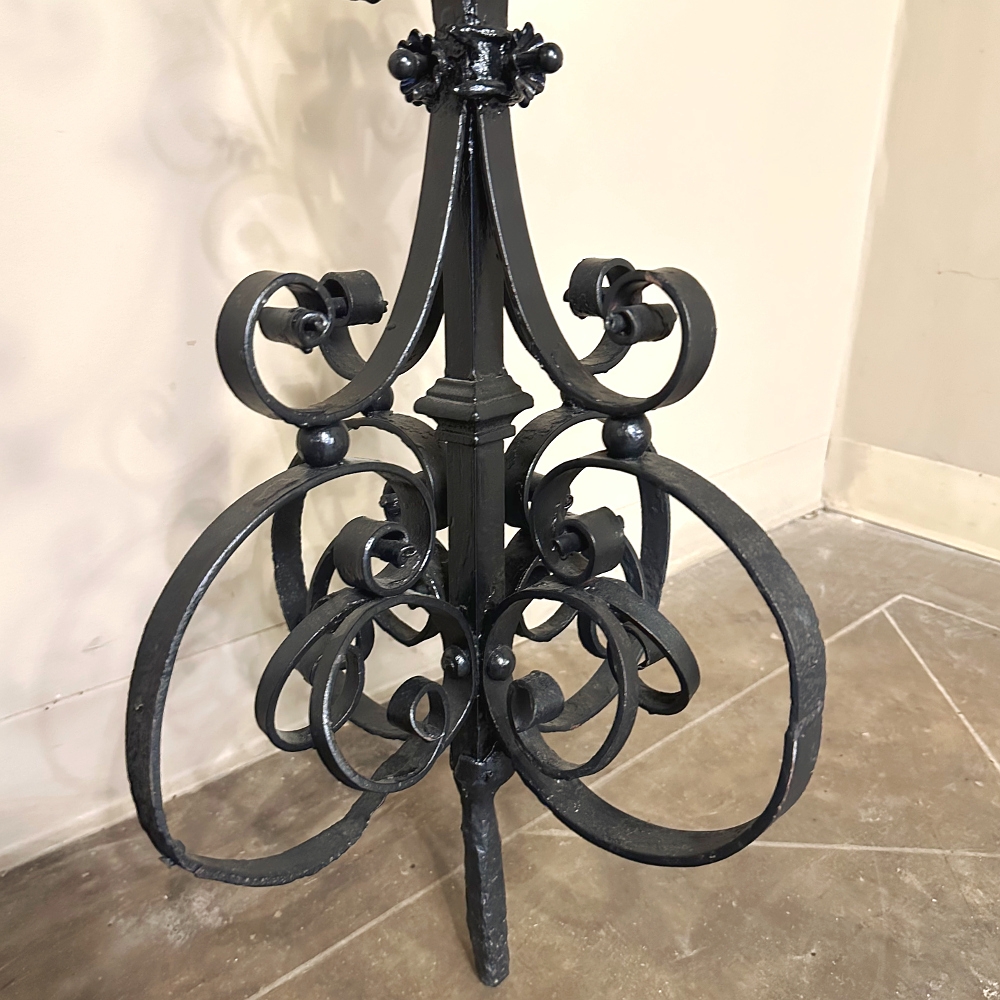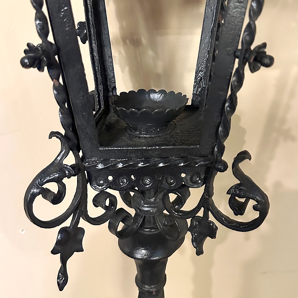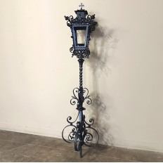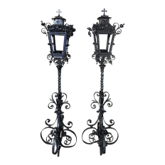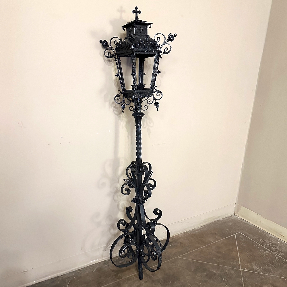 Pair 19th Century French Wrought Iron Garden Lanterns are a testament to the extraordinary talents of a master blacksmith! Intended for either the grounds around a church or a garden belonging to a family of faith, each features a cross on top, with ventilation cut into the top of the structure also in the shape of the Maltese cross. The angled four-sided lantern was designed to hold candles, but each can be electrified in the same manner as other similar wrought iron chandeliers and fixtures we carry. Note the acanthus leaves around the perimeter, floral blossoms tipping the scrolls, judicious use of twisted strips and of course the main shaft, and elaborate scrolls with rosettes and tendrils below forming the base. Extra shaft extends below the scrolls for insertion into the pedestal or mounting block for actual installation.